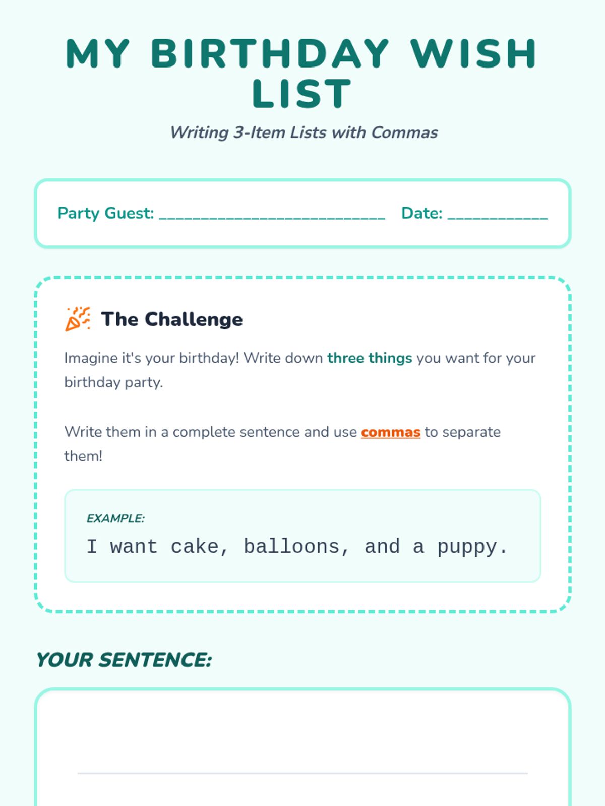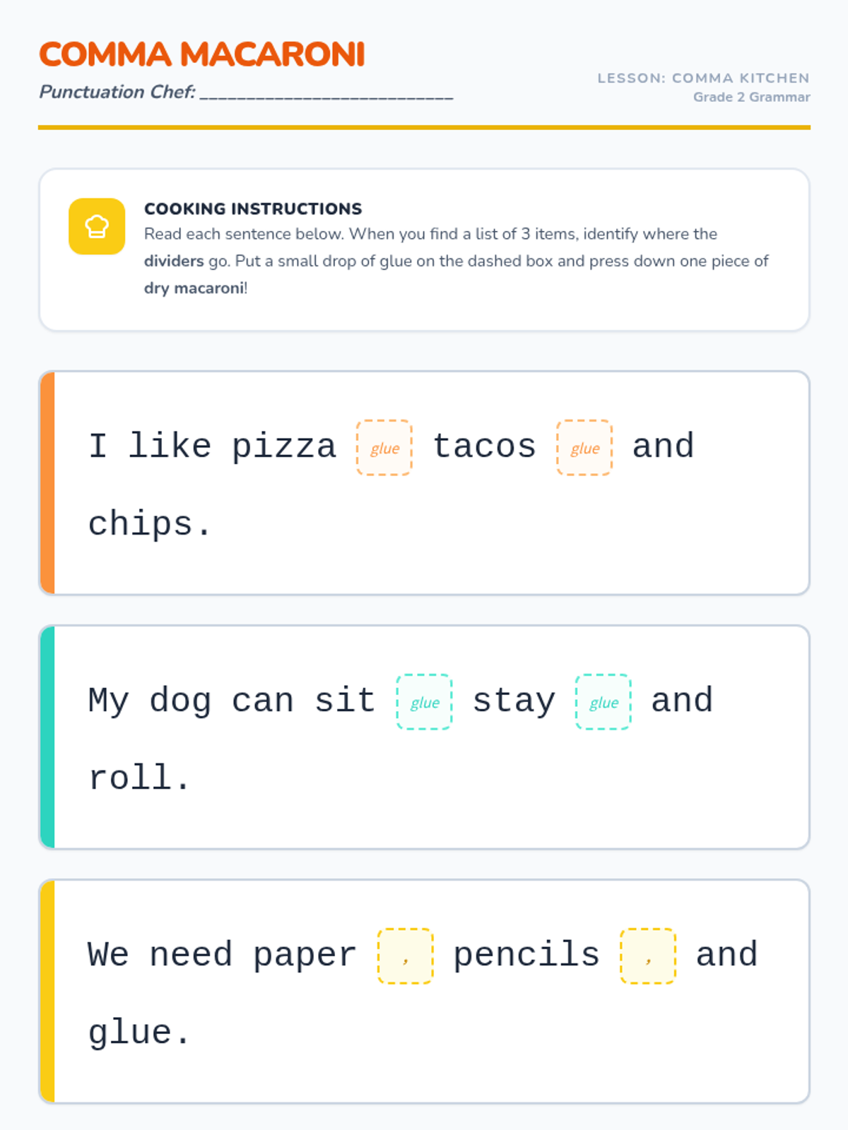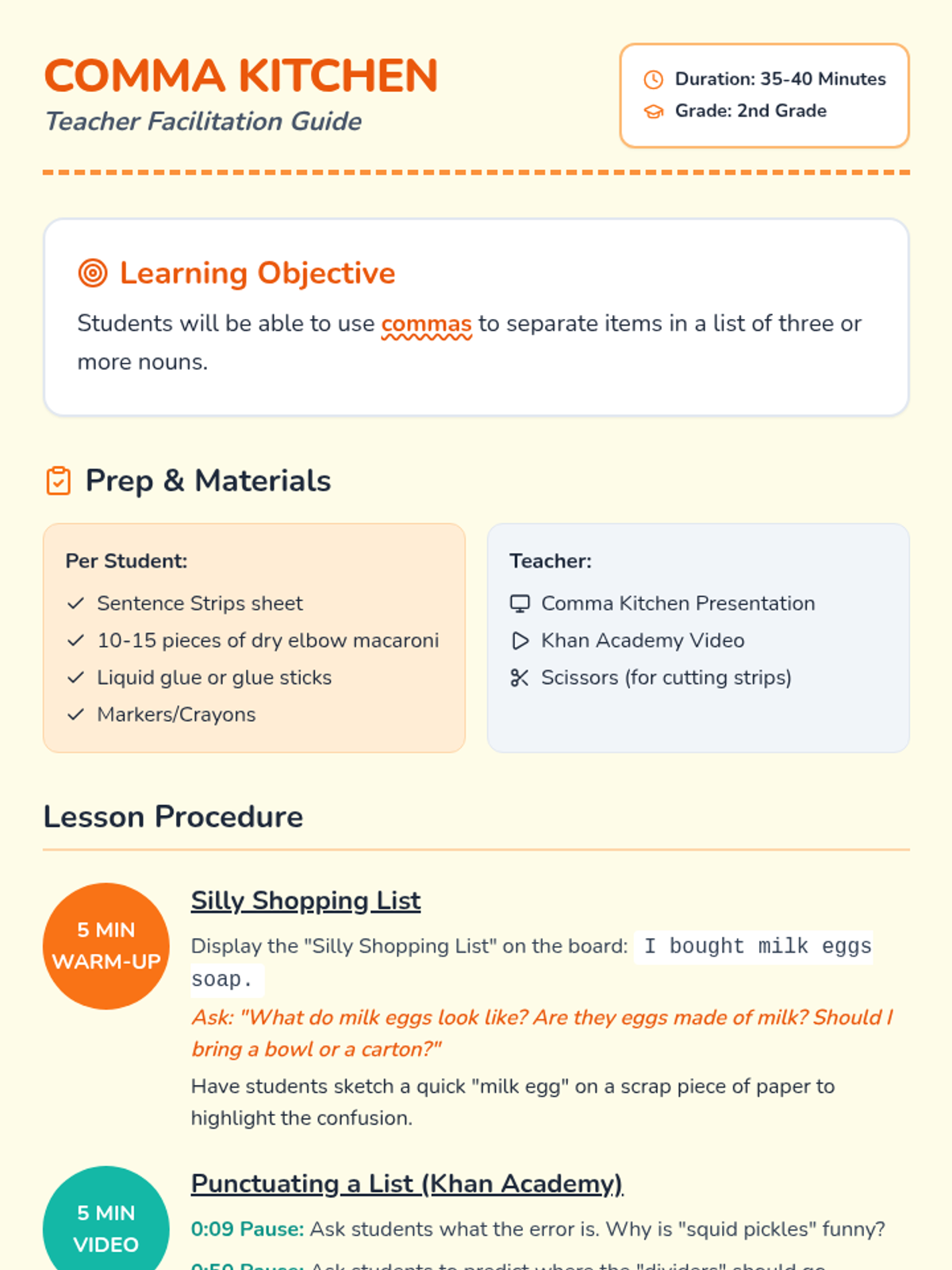 A 2nd-grade grammar lesson using tactile macaroni pasta to teach students how to separate items in a list using commas, based on a Khan Academy video.
