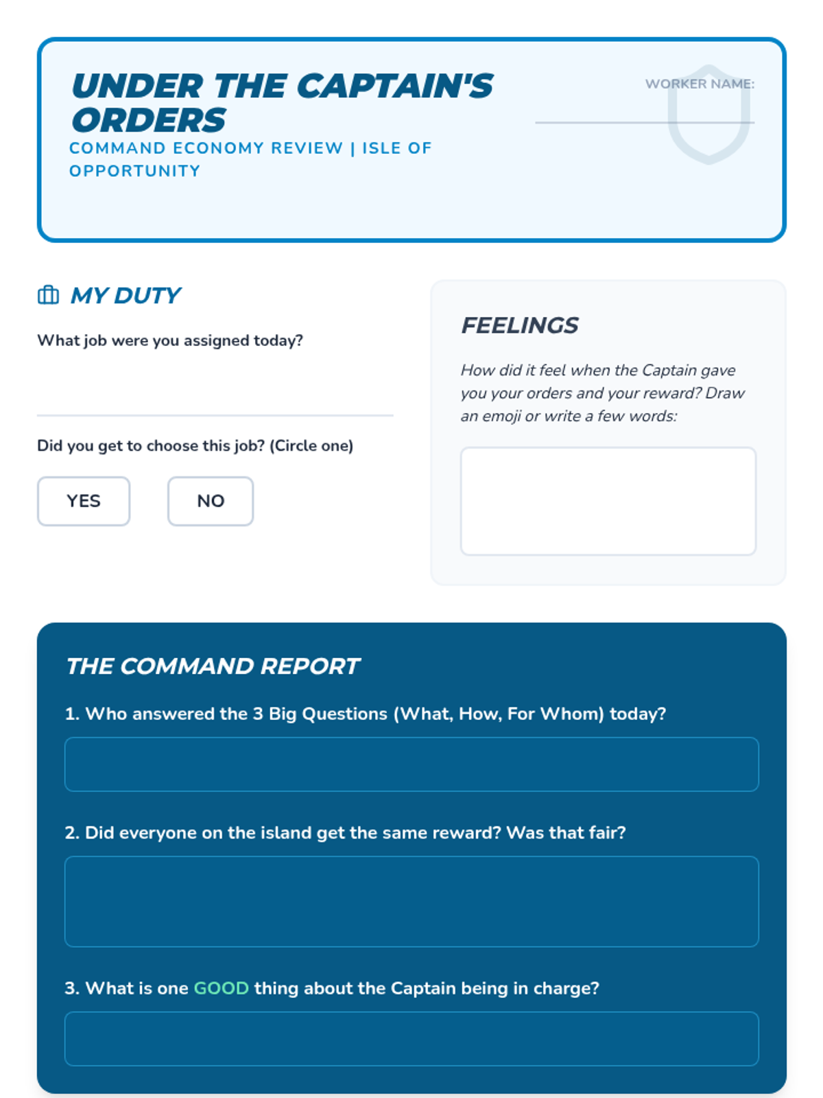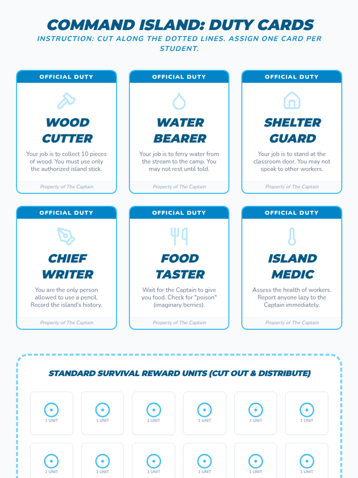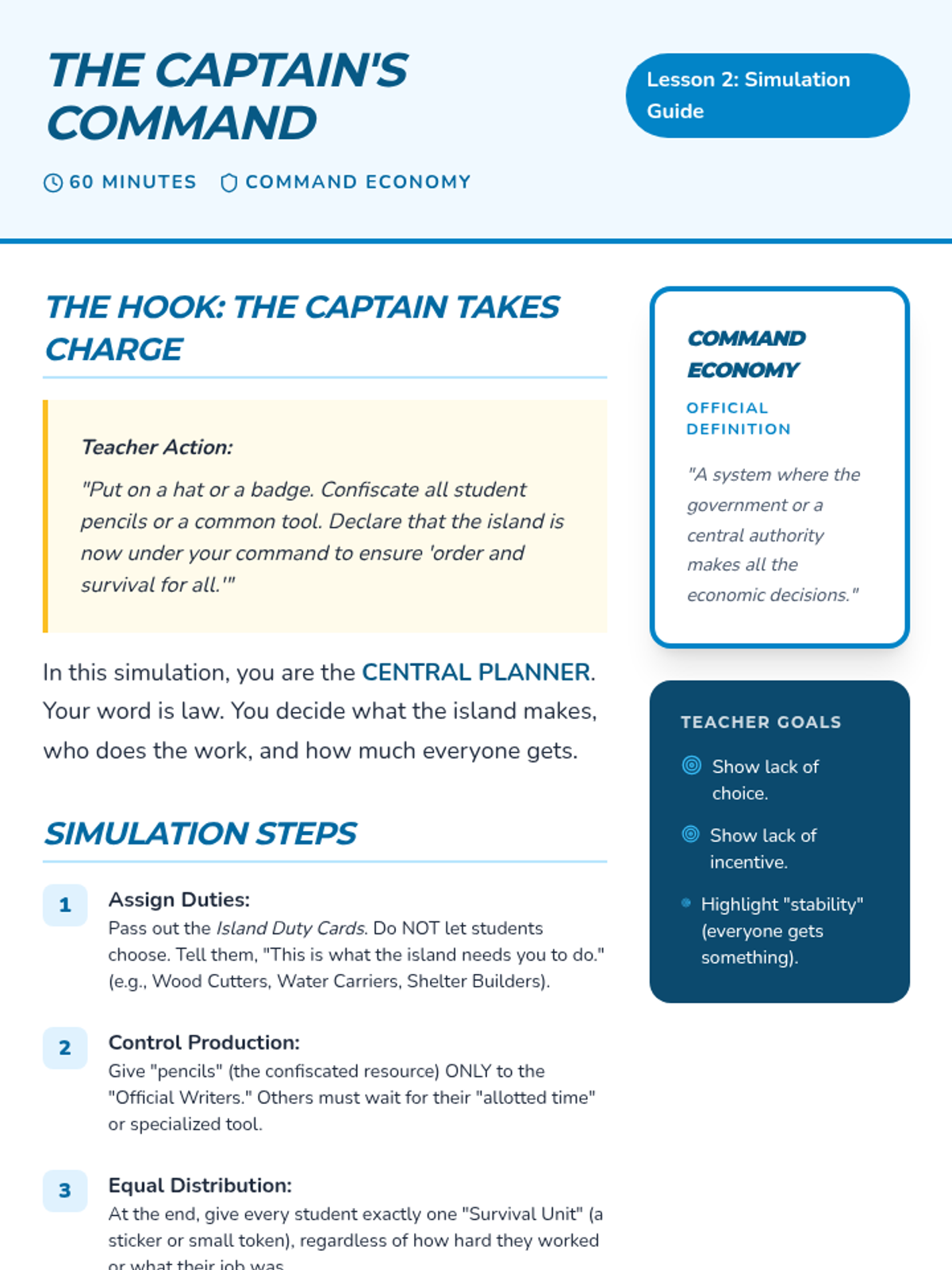 The teacher acts as a Central Planner in a Command Economy simulation, assigning roles and controlling all resources to show students a system prioritizing stability and equity over individual choice.