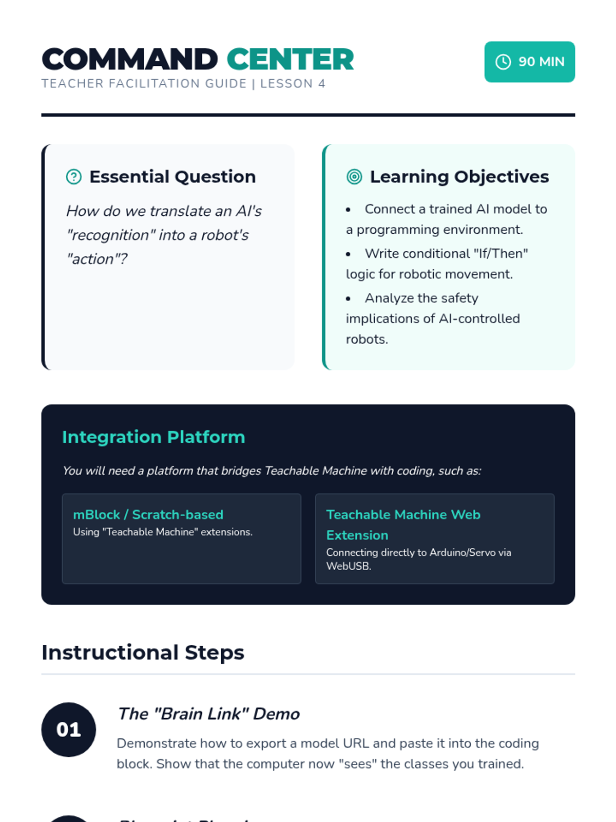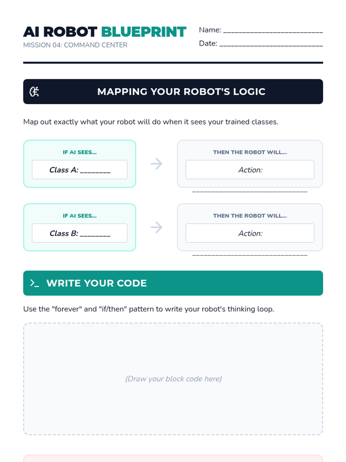Students integrate their AI models with robotic control logic, creating systems where sensor/camera input triggers specific motor actions.