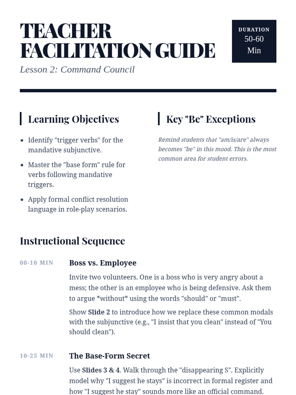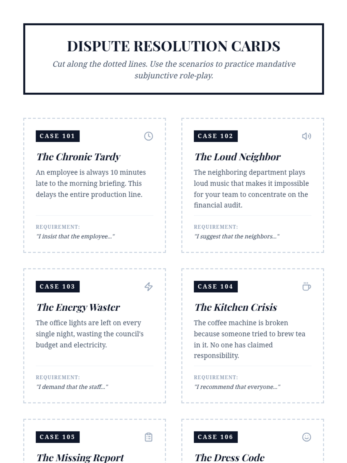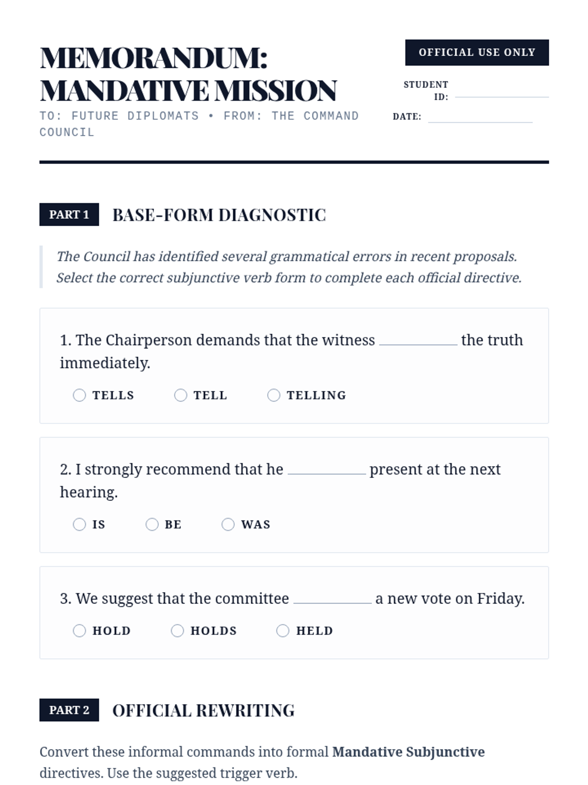 Focuses on the mandative subjunctive used after verbs of demand and suggestion. Students learn the 'base form' rule and apply it to professional conflict resolution scenarios.