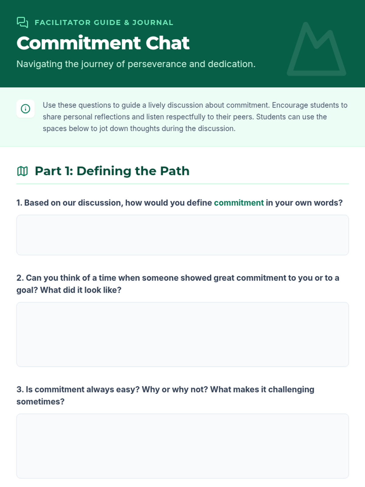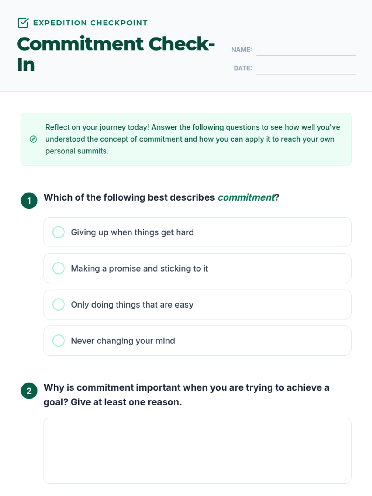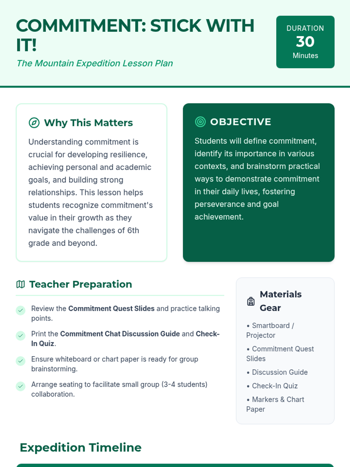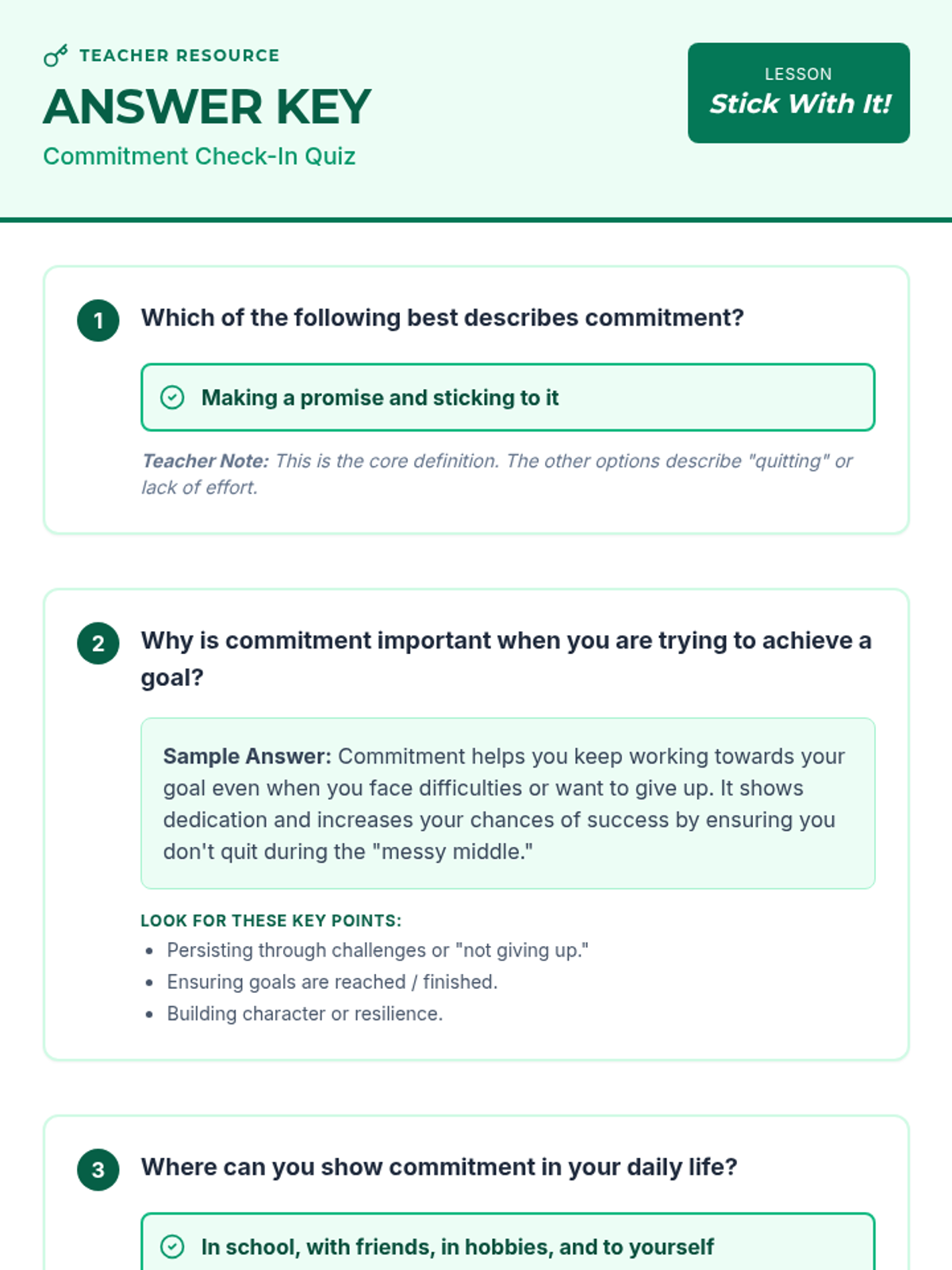 A single-session lesson for 6th graders that explores the definition, importance, and application of commitment through a 'Quest' theme. Students engage in discussions, brainstorming, and a self-reflection quiz to understand how perseverance leads to success.