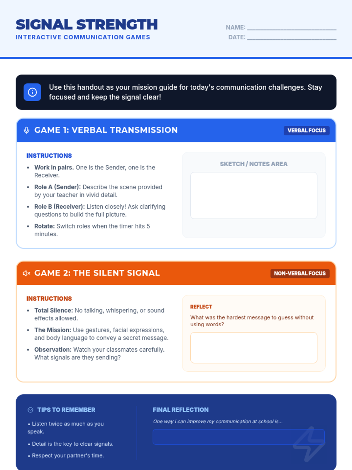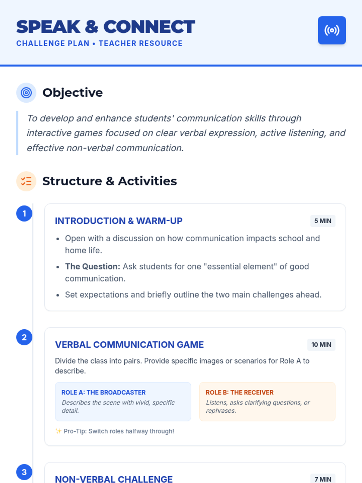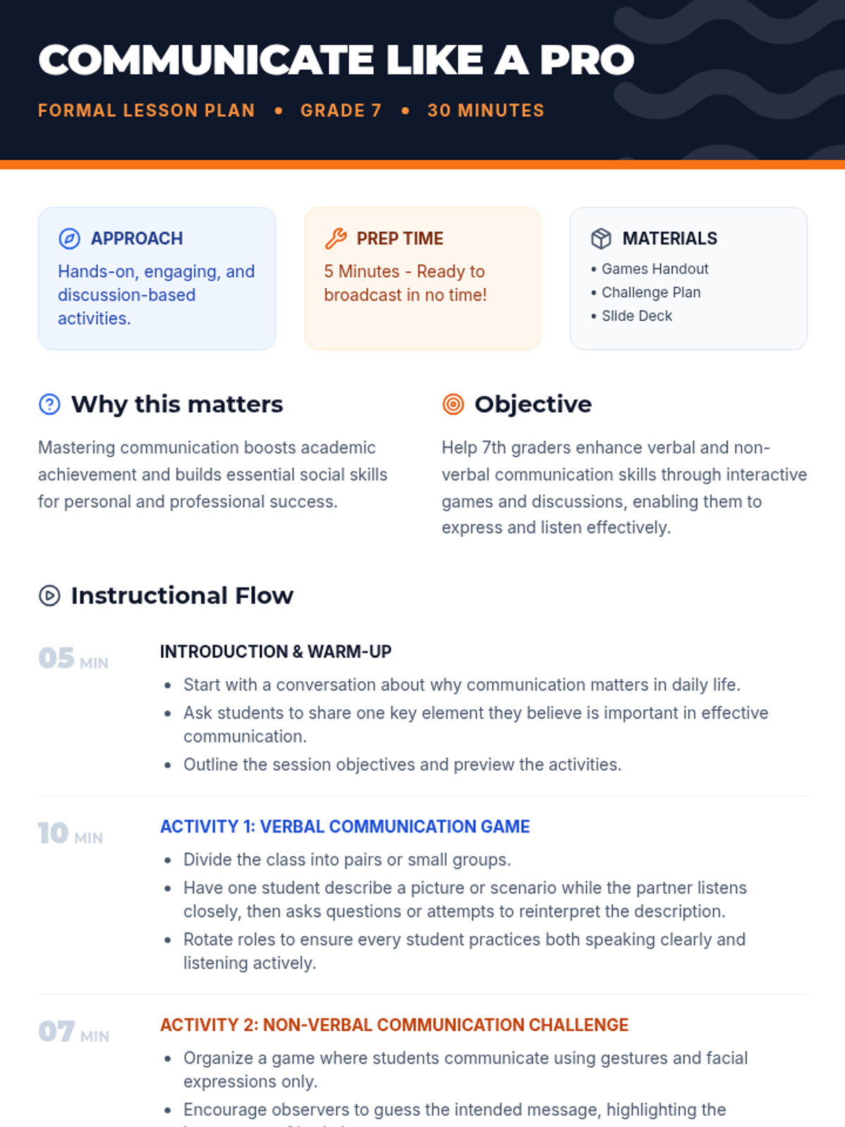 A 30-minute interactive lesson for 7th graders focused on mastering verbal and non-verbal communication through engaging games and group discussion.