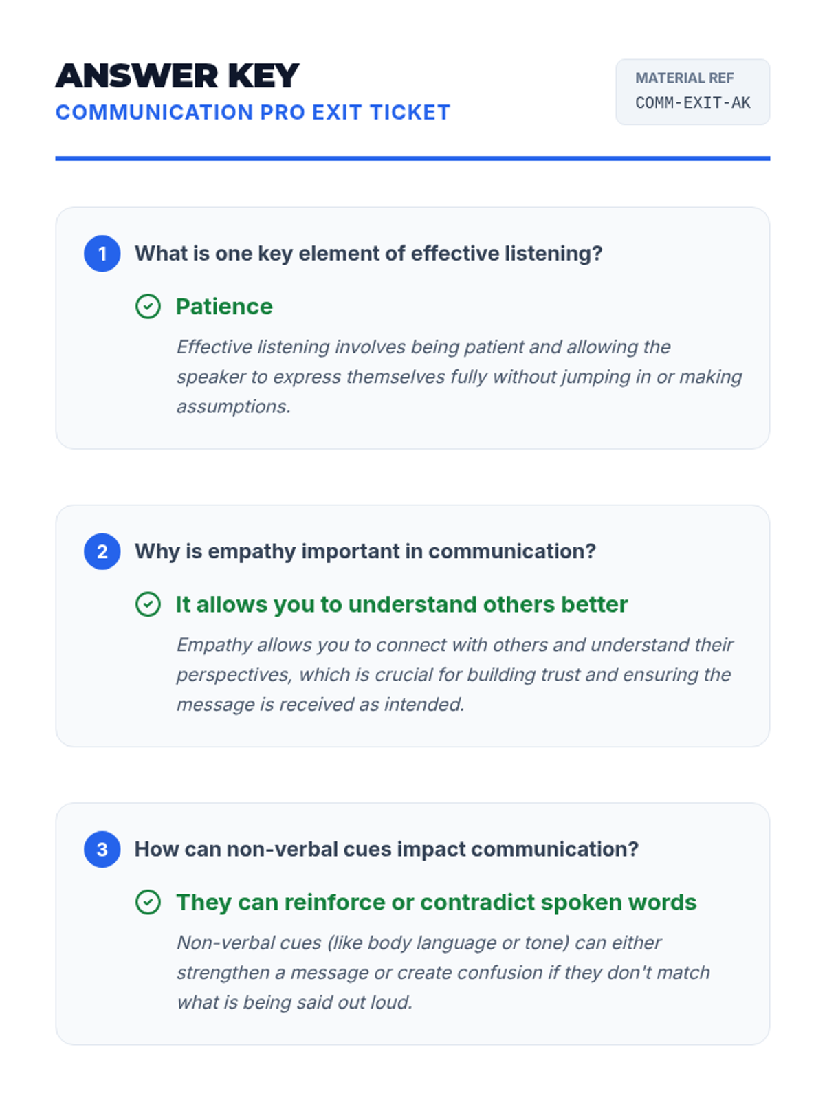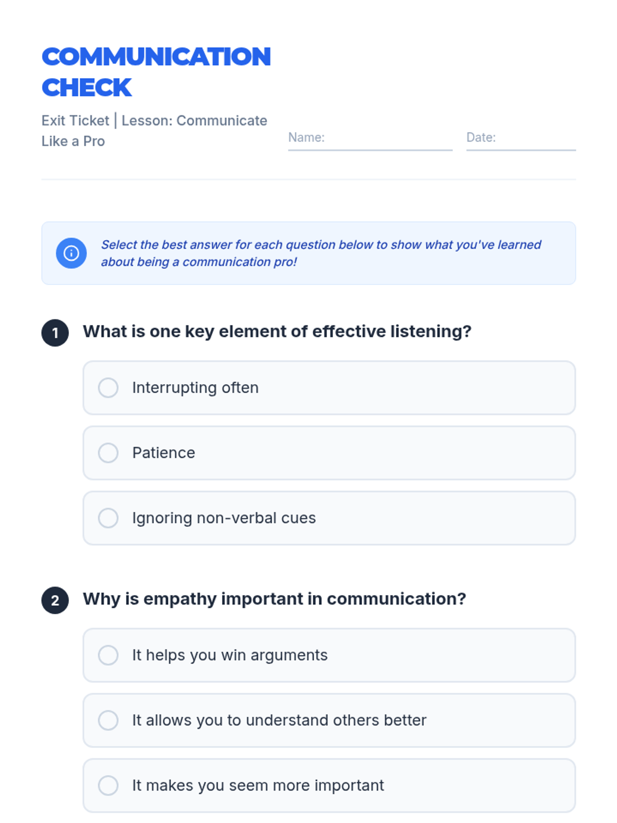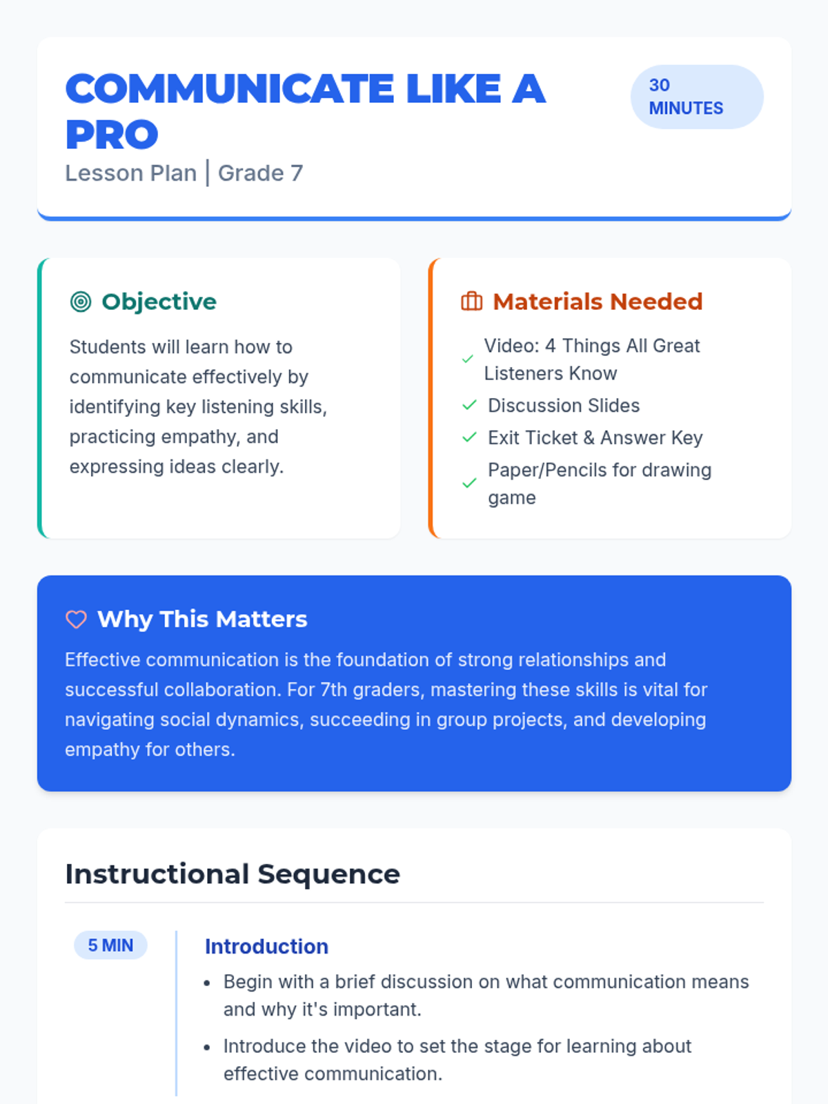 This lesson focuses on teaching 7th graders the essentials of effective communication through engaging activities, a video on active listening, and group games. Students will learn the importance of listening, empathy, and clear expression to build stronger relationships and collaborate effectively.