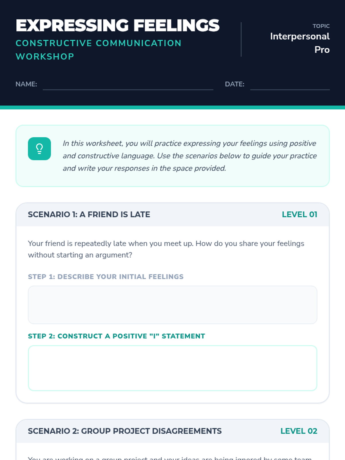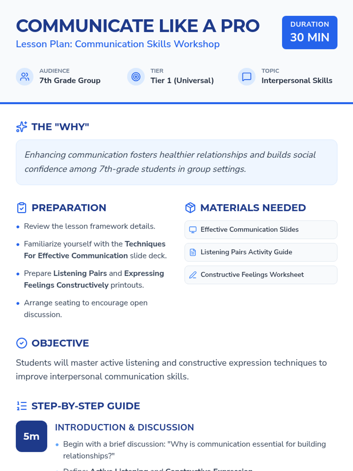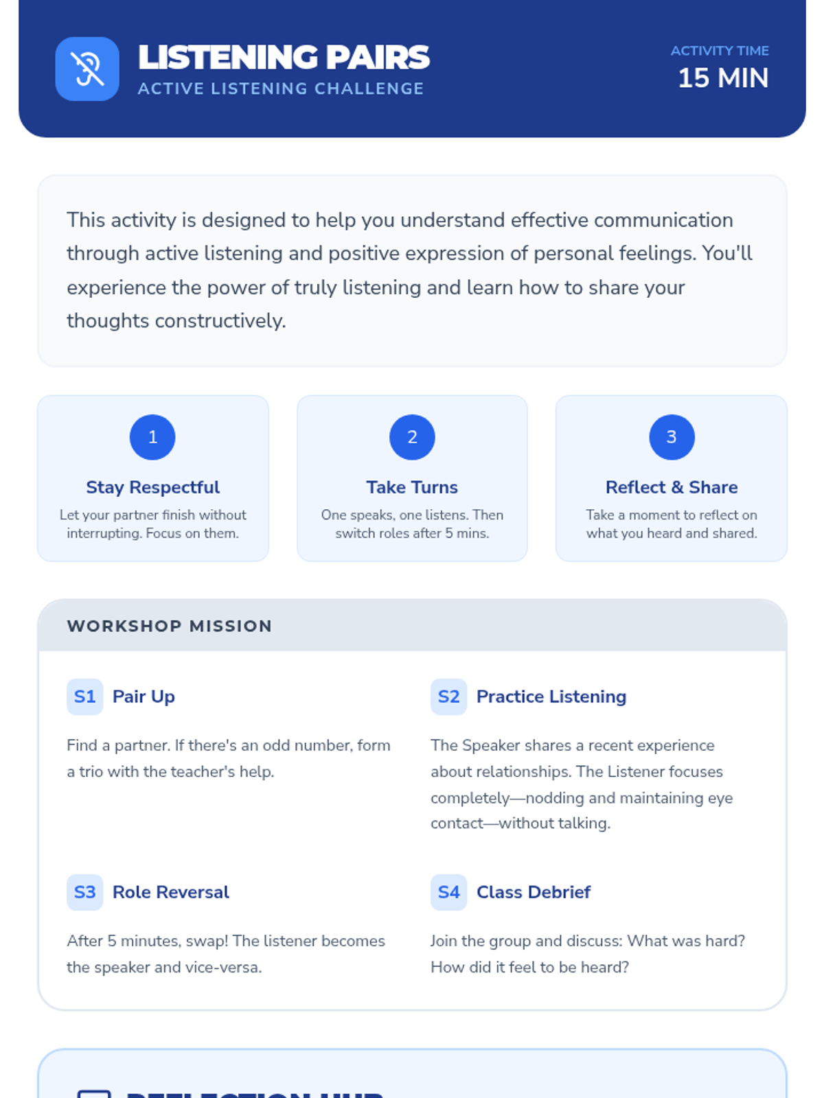 A comprehensive workshop for 7th graders to master active listening and constructive self-expression to build stronger interpersonal relationships.
