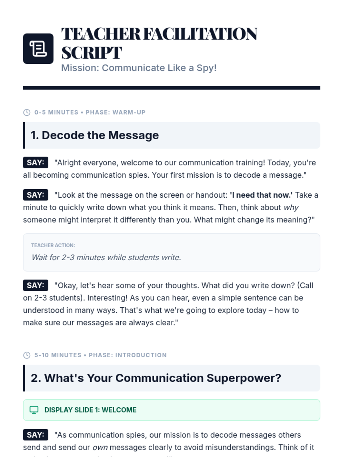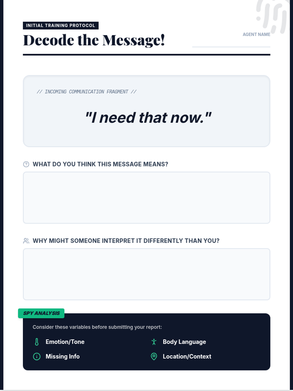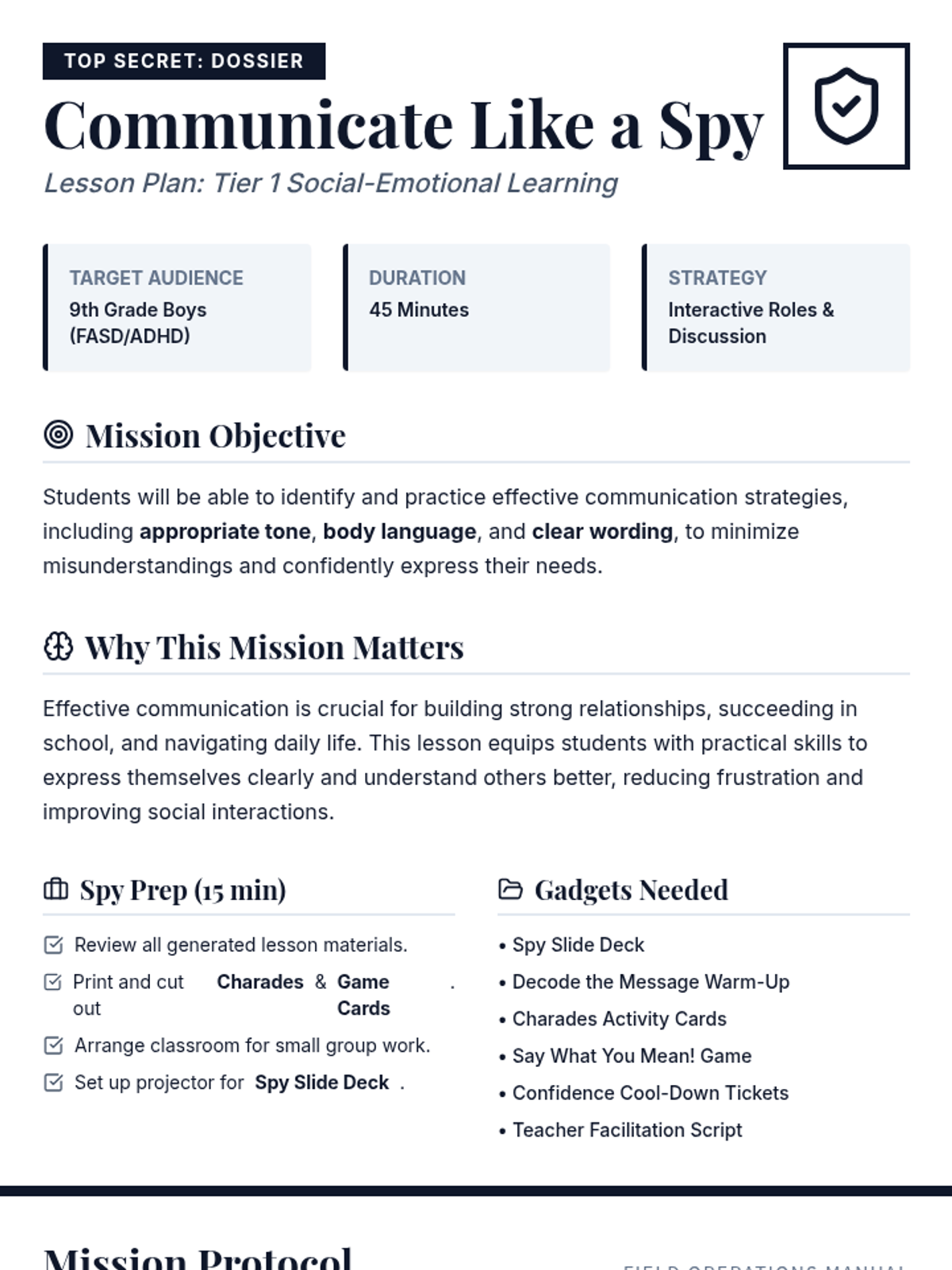 A 45-minute lesson for 9th-grade boys with FASD and ADHD to strengthen communication skills through the lens of being a 'communication spy,' focusing on tone, body language, and clear wording.