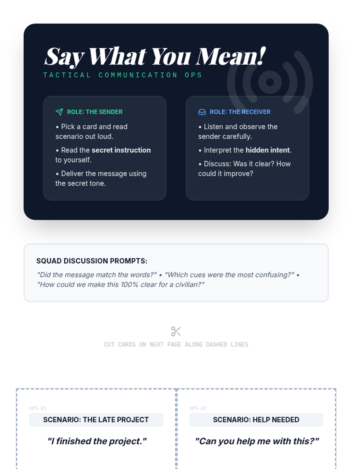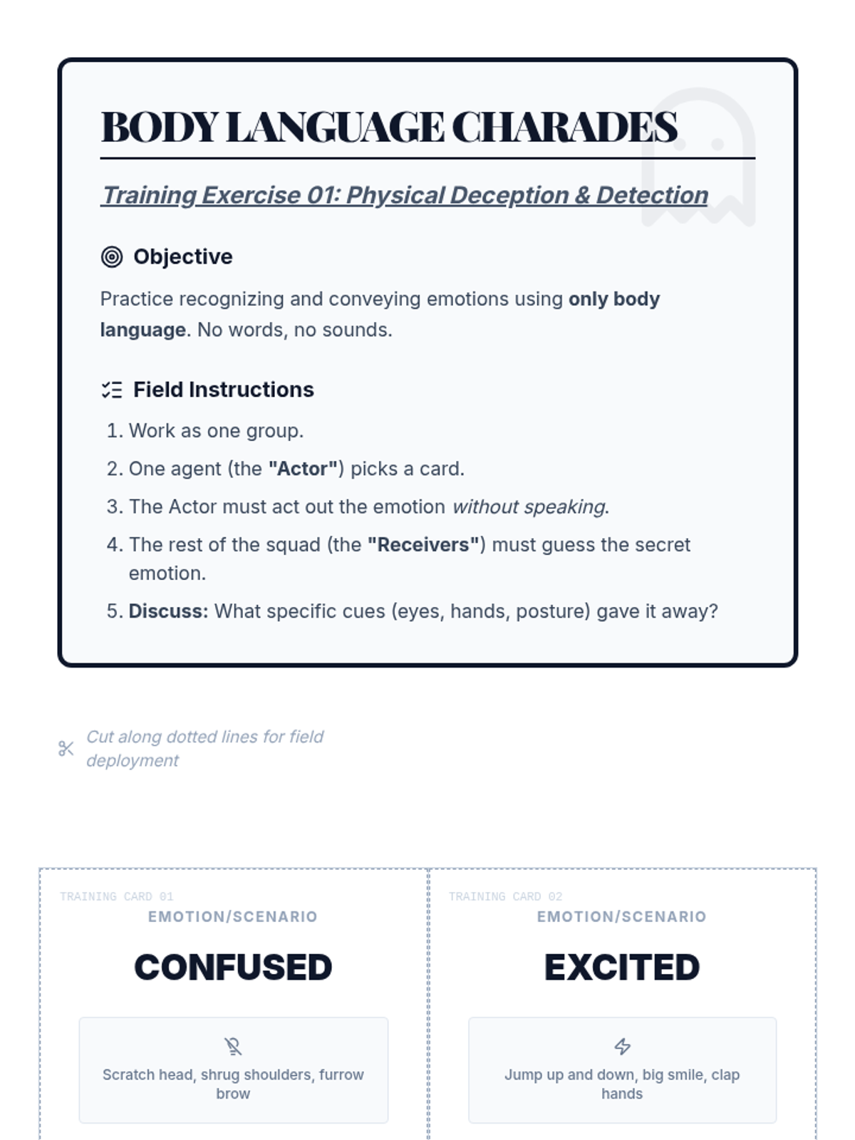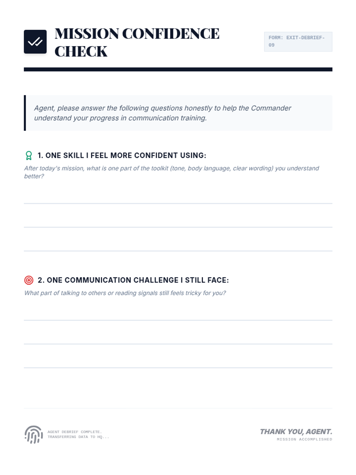 A 45-minute lesson for 9th-grade boys with FASD and ADHD to strengthen communication skills through the lens of being a 'communication spy,' focusing on tone, body language, and clear wording.
