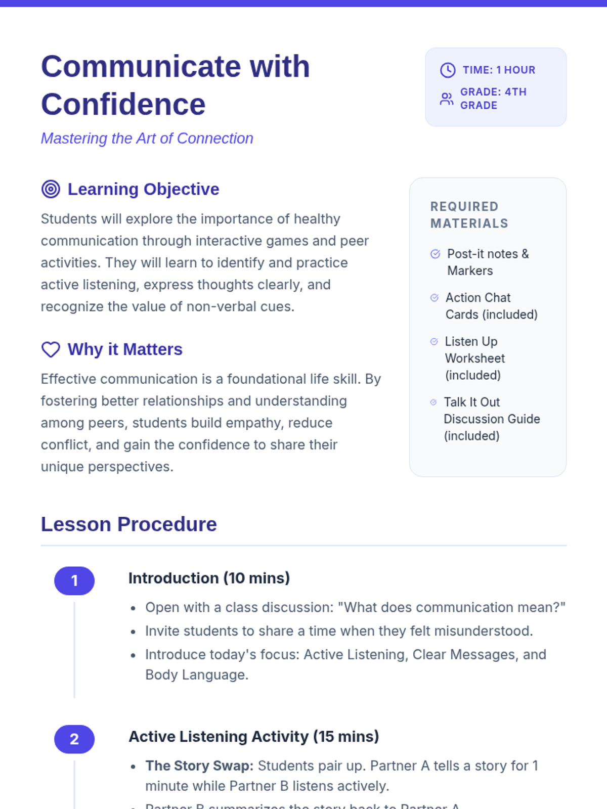 Students explore healthy communication through interactive games and peer activities, focusing on active listening, clear expression, and non-verbal cues.
