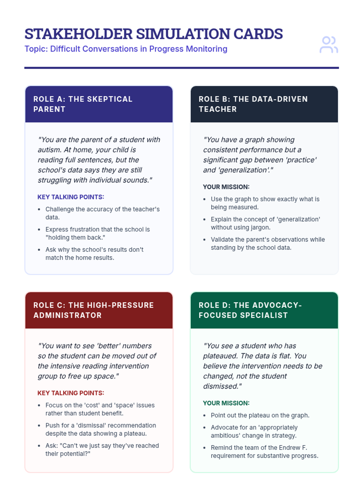 Practice bridging the gap between special education jargon and family understanding. Cover visual literacy strategies to explain graphs to parents and strategies for delivering difficult news regarding lack of progress.