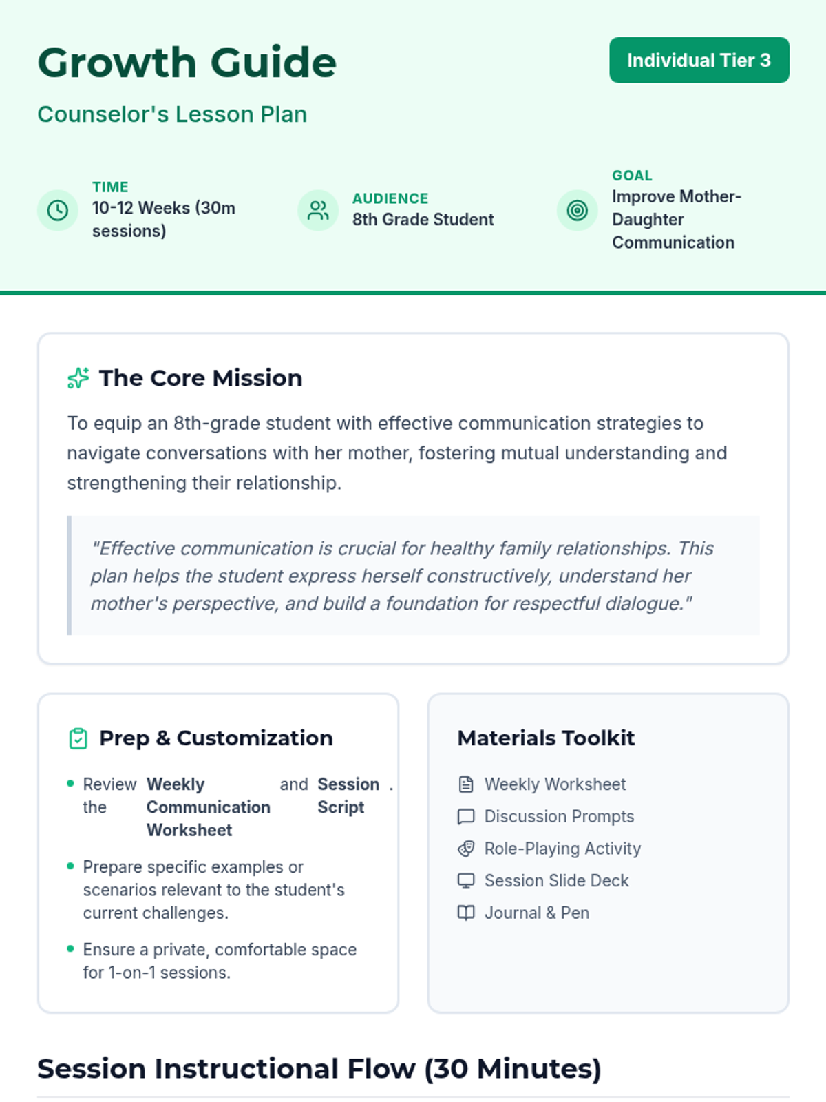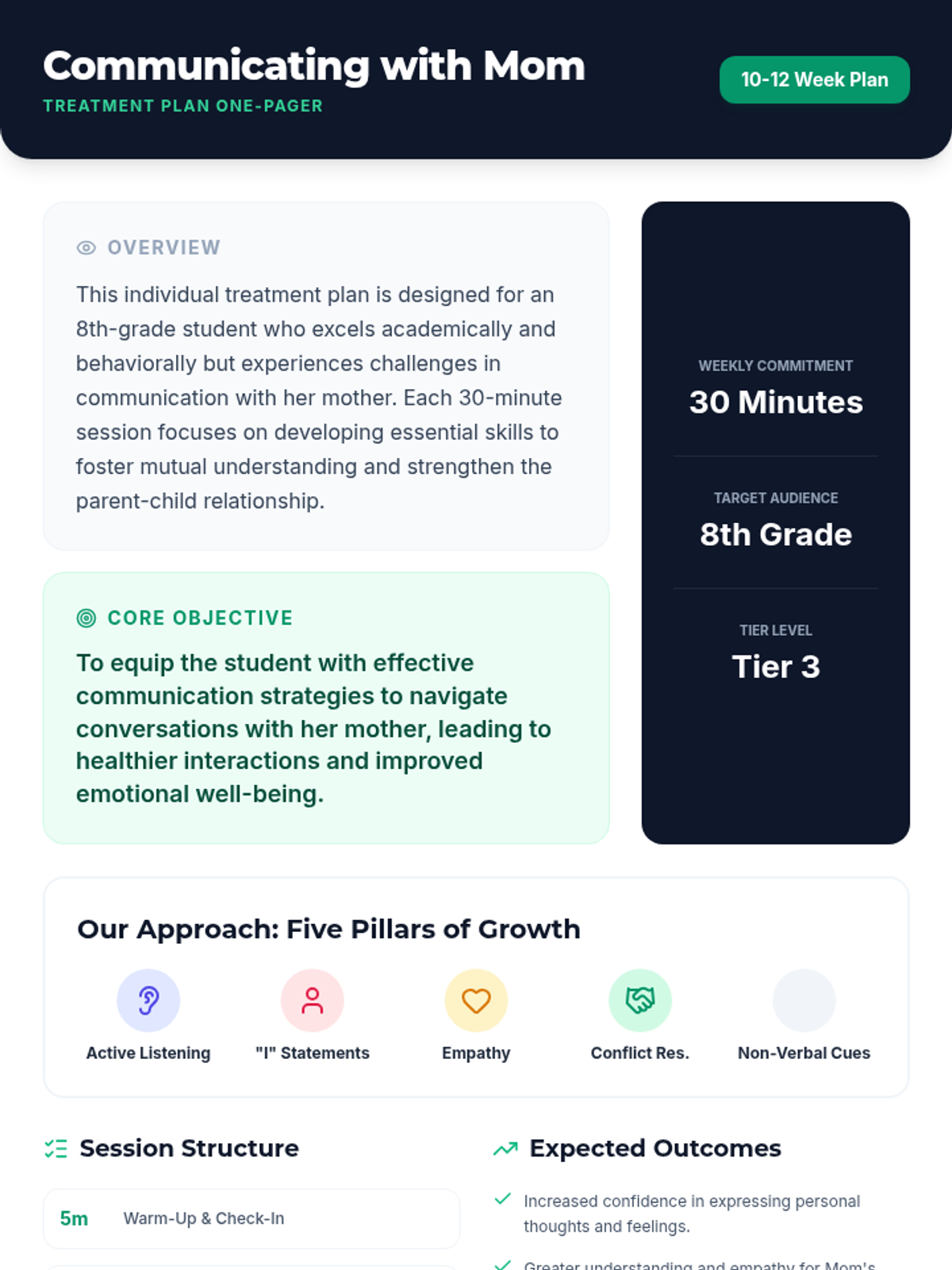 A 10-12 week individual treatment plan for an 8th-grade student to improve communication and empathy with her mother through 30-minute skill-building sessions.