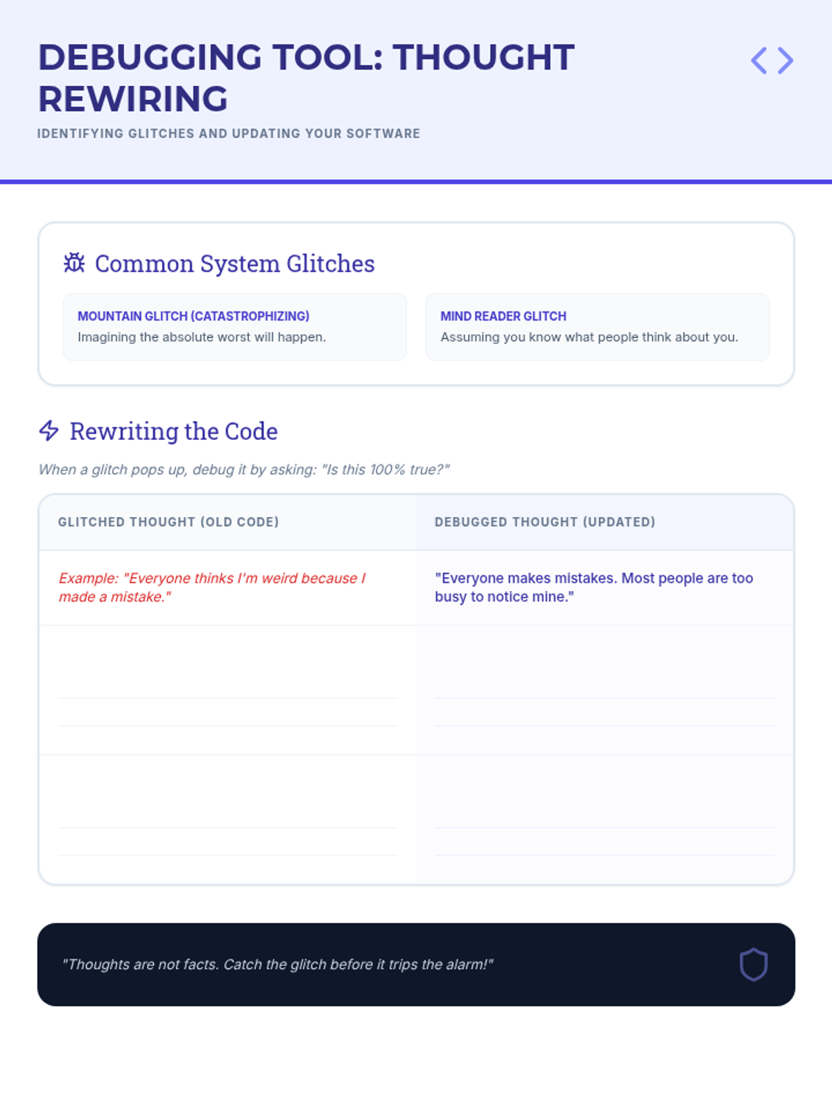 Identifying and challenging 'glitches' or cognitive distortions that fuel anxiety through negative thought patterns.