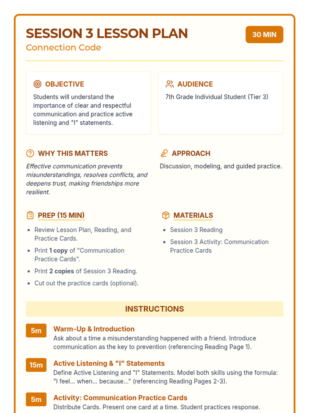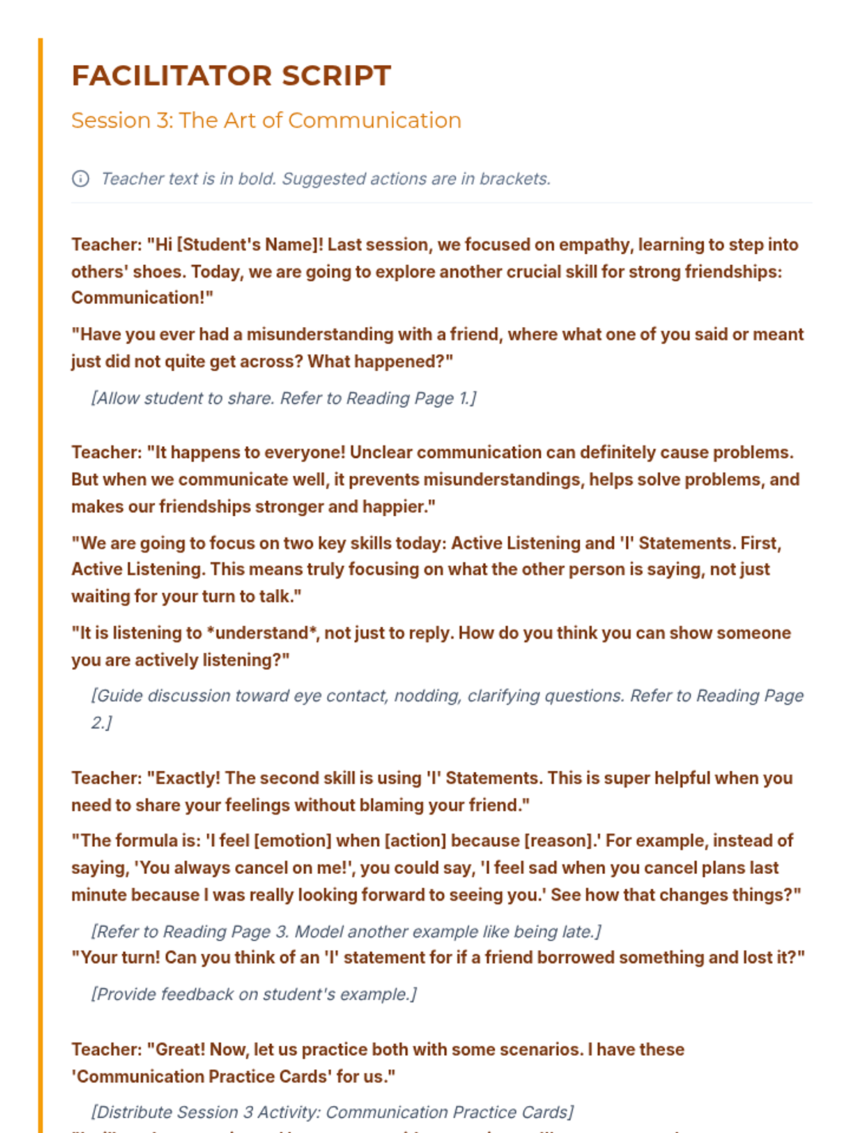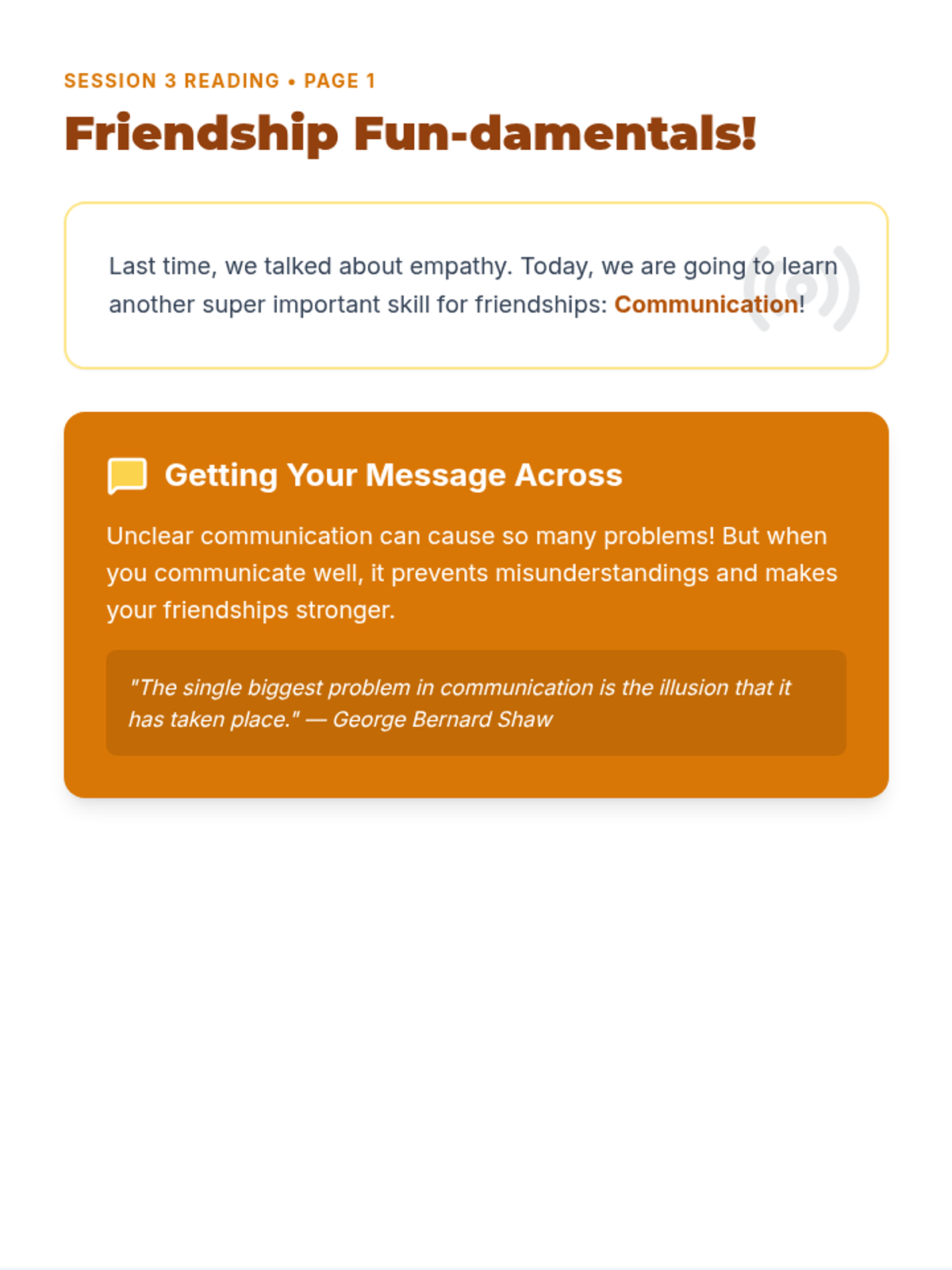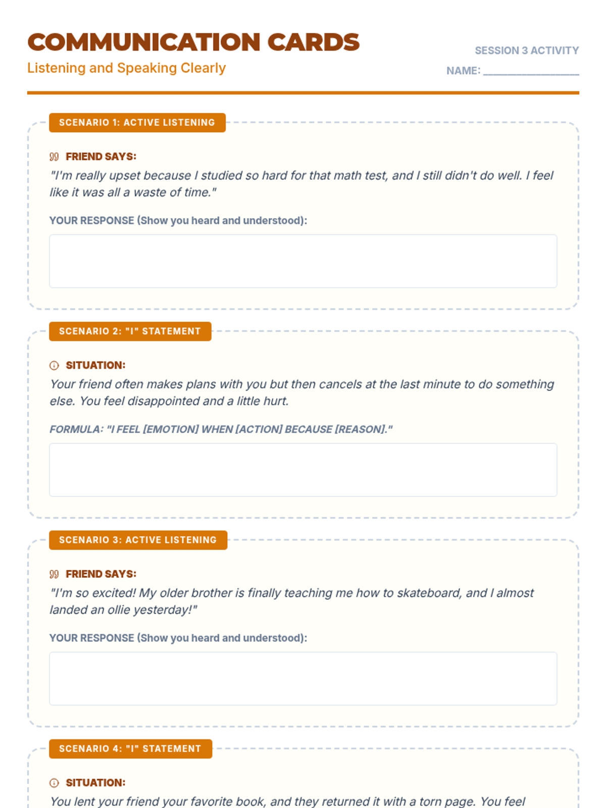 Introduces active listening and "I" statements as essential tools for clear, respectful communication within friendships.