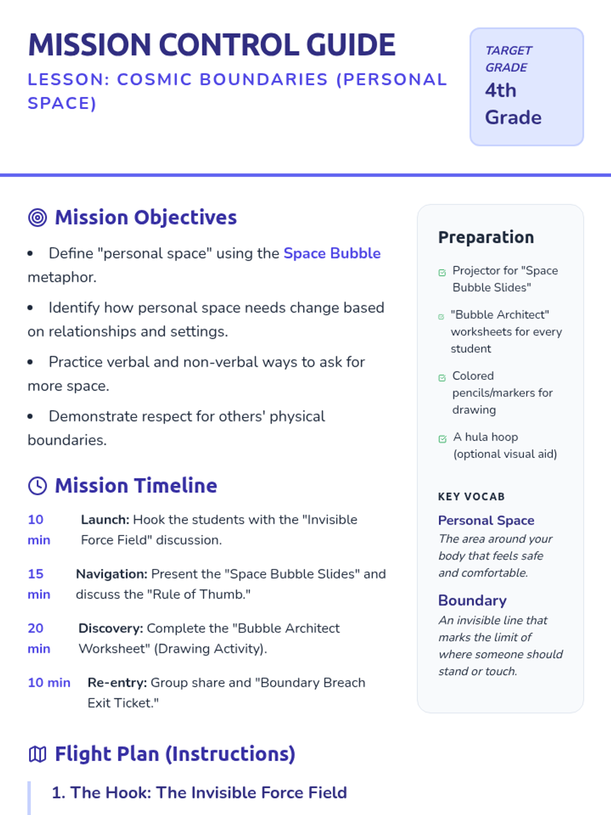 A comprehensive social-emotional learning lesson for 4th graders focused on understanding and respecting personal space using a 'space bubble' metaphor. Students explore physical boundaries through discussion, visual aids, and a creative drawing activity.