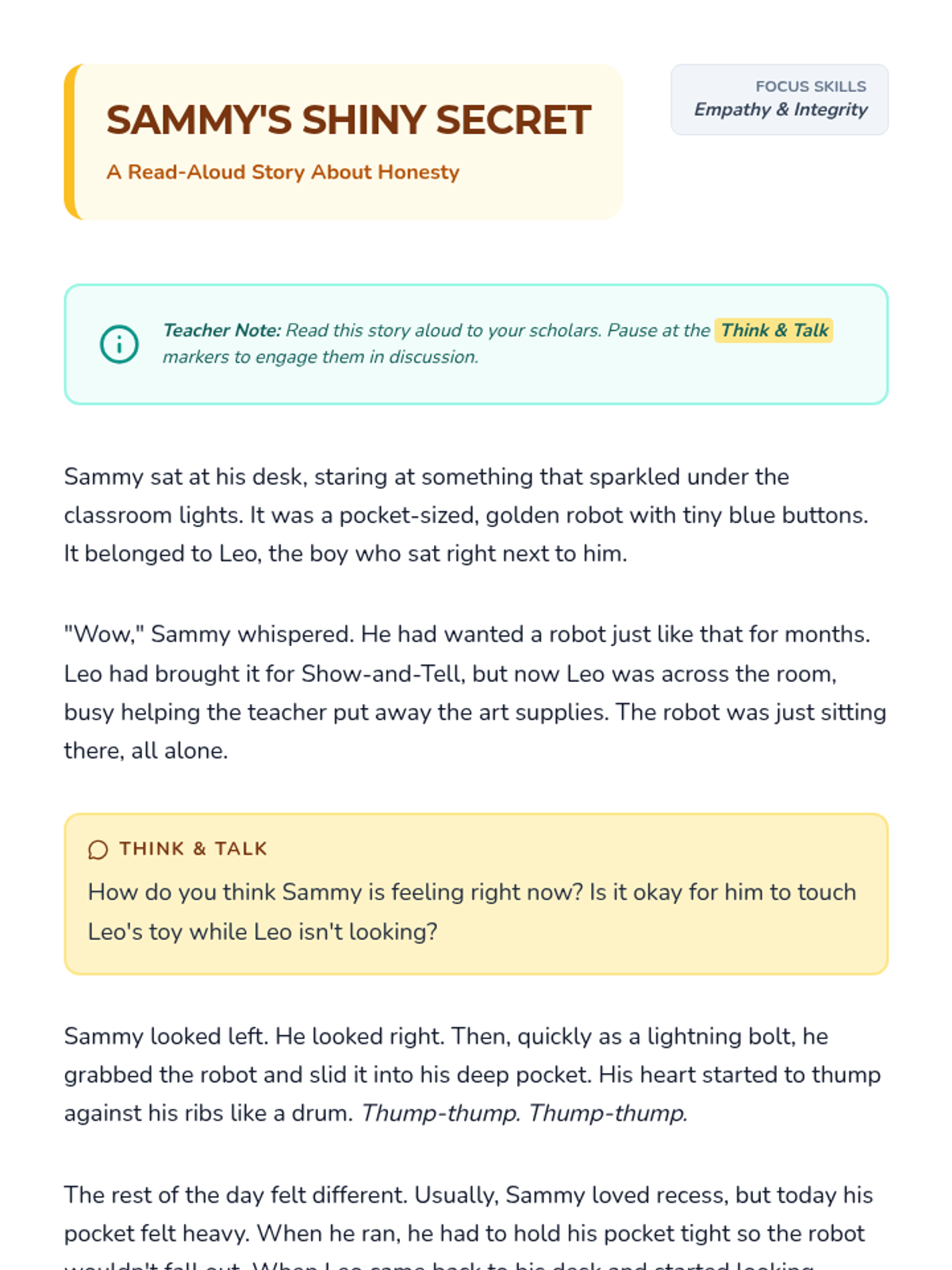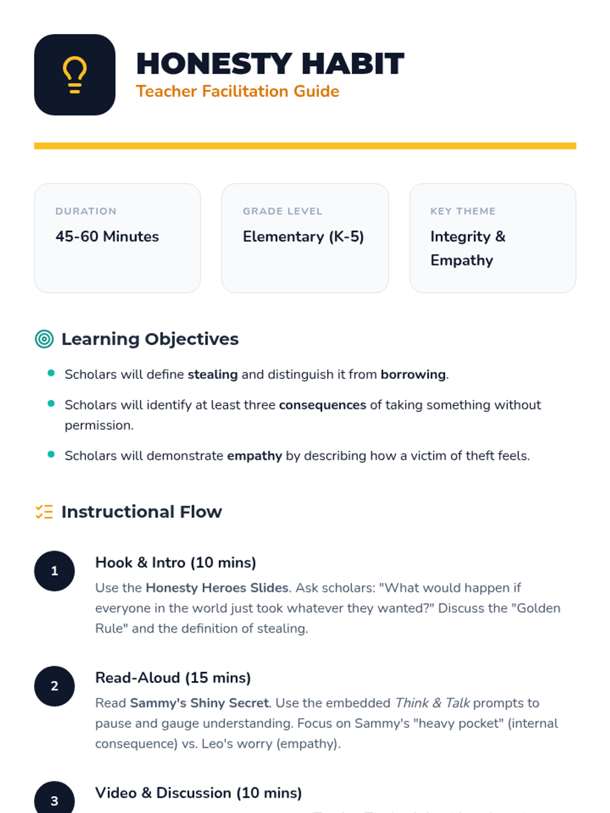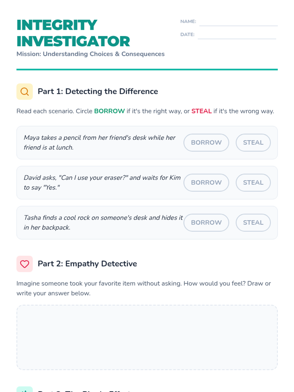 A comprehensive lesson teaching elementary scholars the importance of honesty, focusing on the rules against stealing, the consequences of taking what isn't ours, and developing empathy for others.