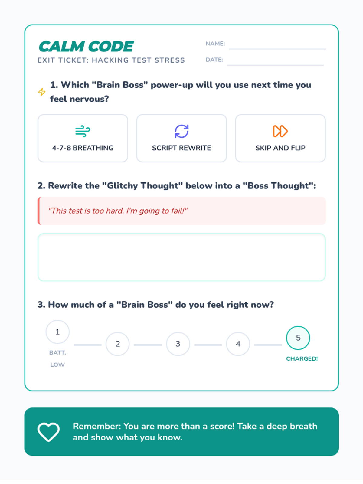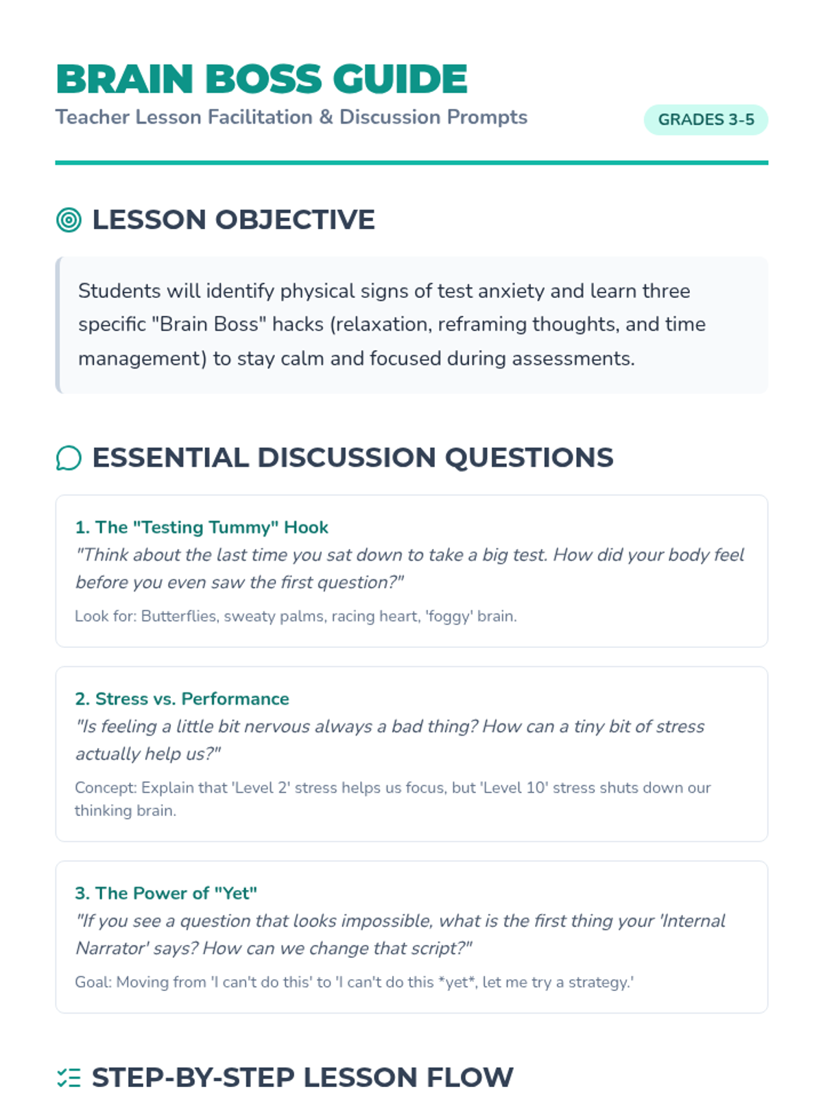 A comprehensive lesson for upper elementary students to identify the physical and emotional signs of test anxiety and build a toolkit of effective coping strategies.