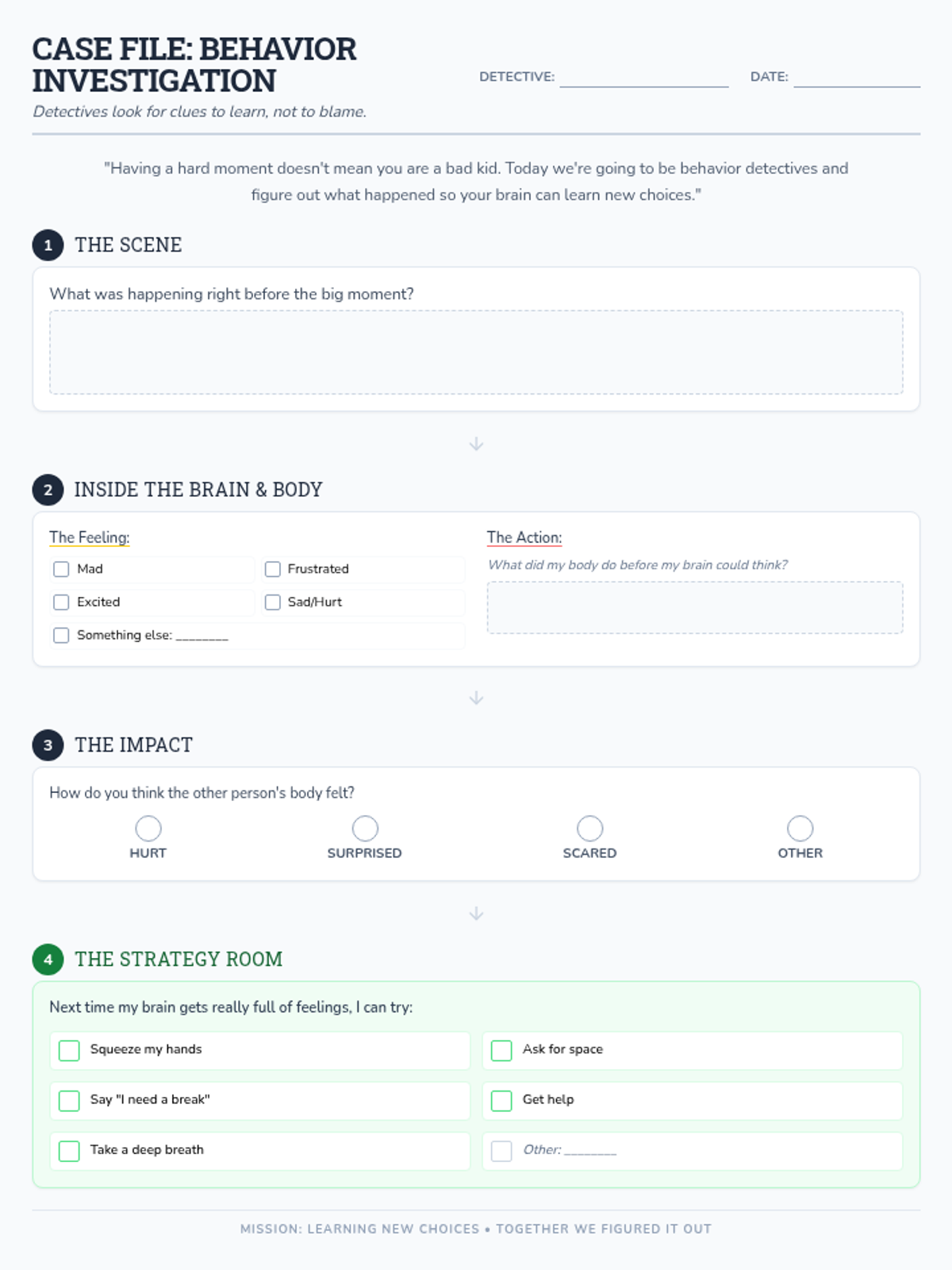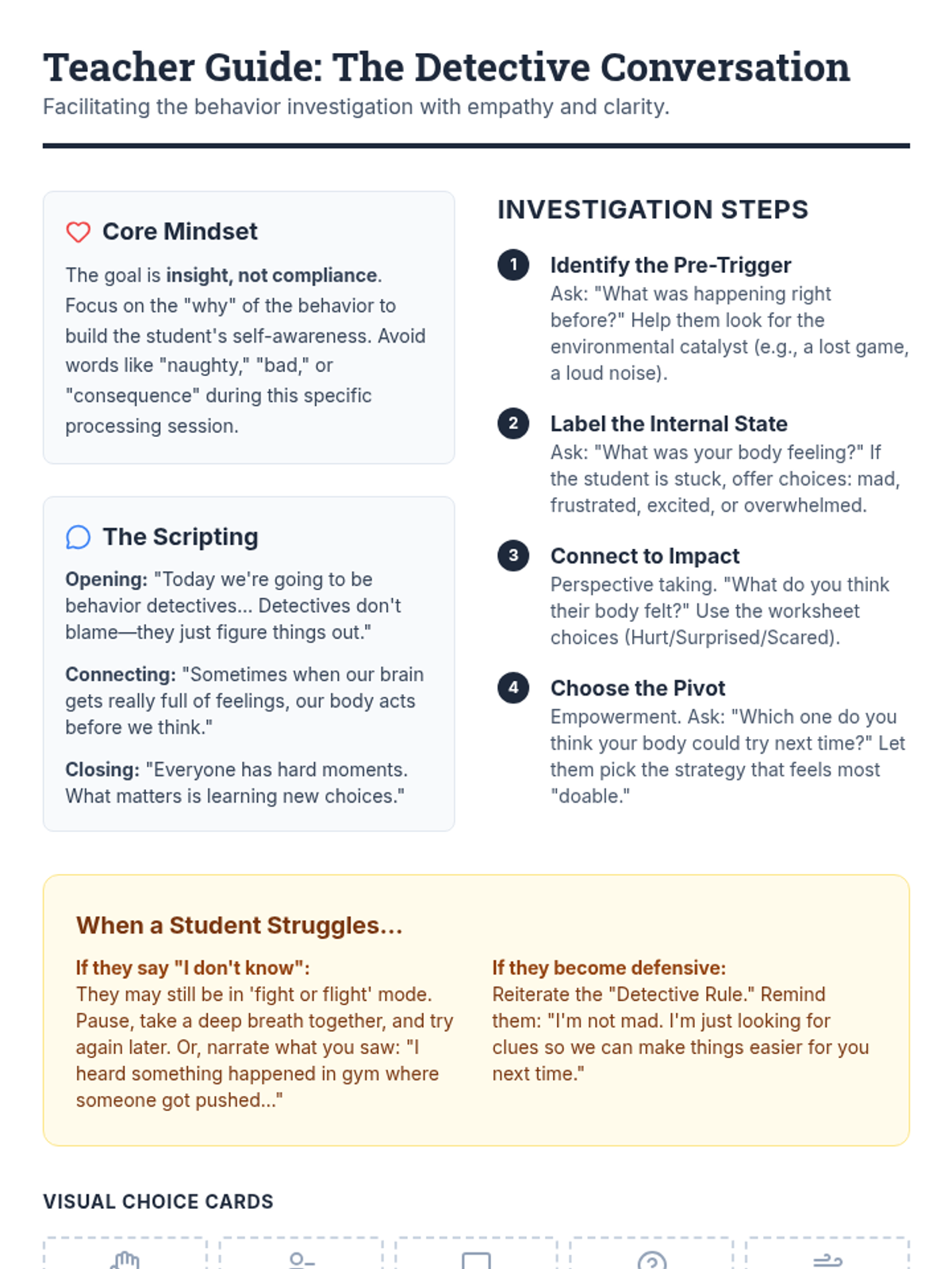 A lesson focused on self-regulation and emotional processing using the 'Behavior Detective' metaphor to help students analyze their actions without shame and develop better coping strategies.
