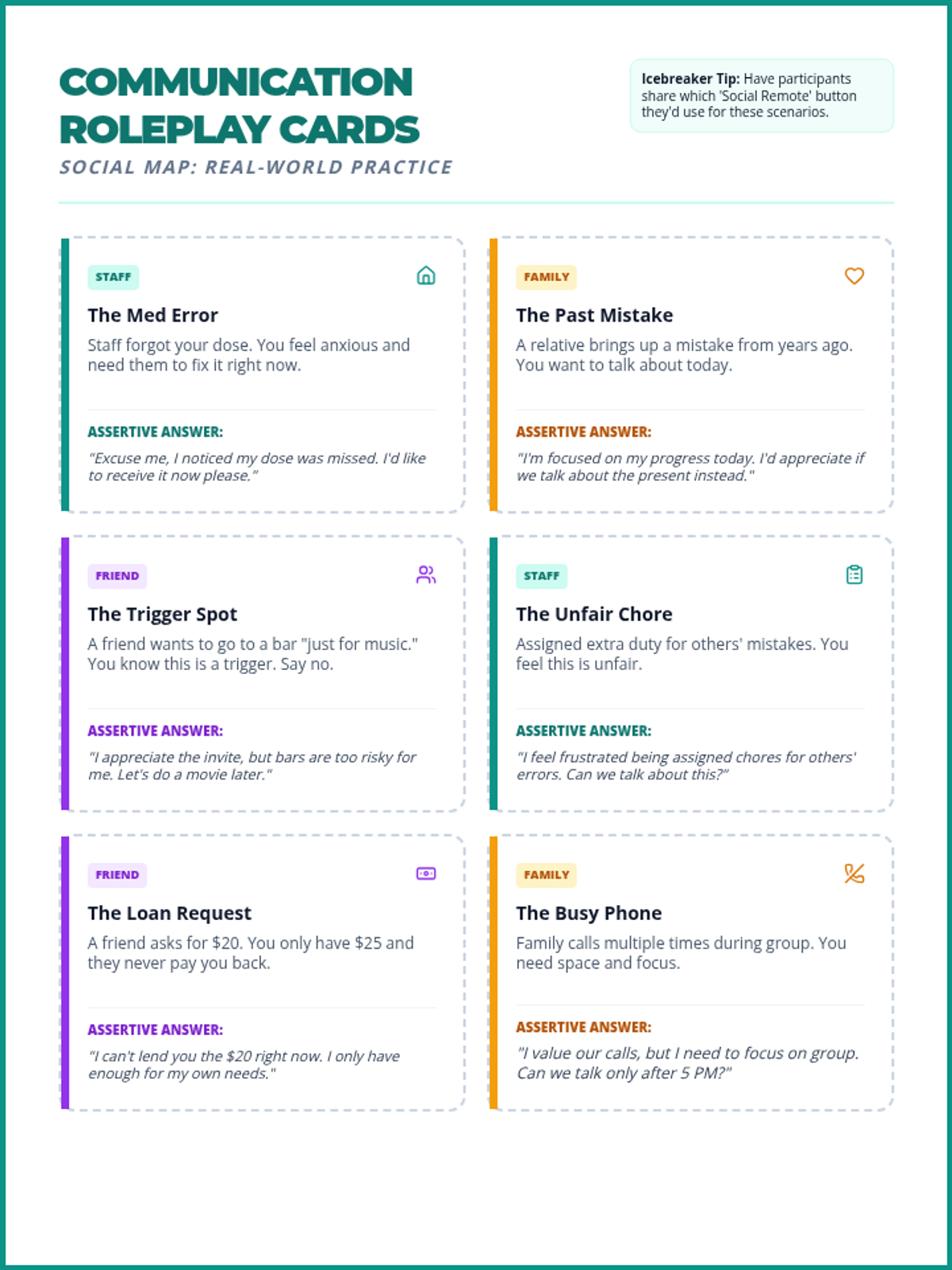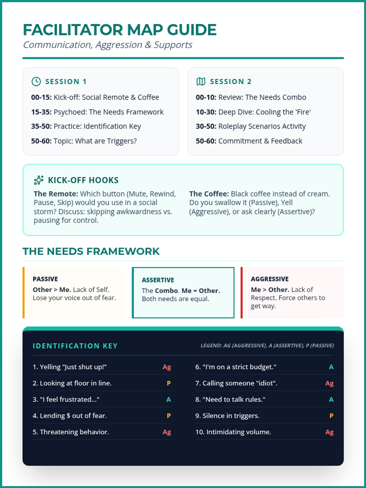 A two-session group therapy lesson for adults focused on identifying and practicing communication styles (passive, assertive, and passive-aggressive) and leveraging support systems.