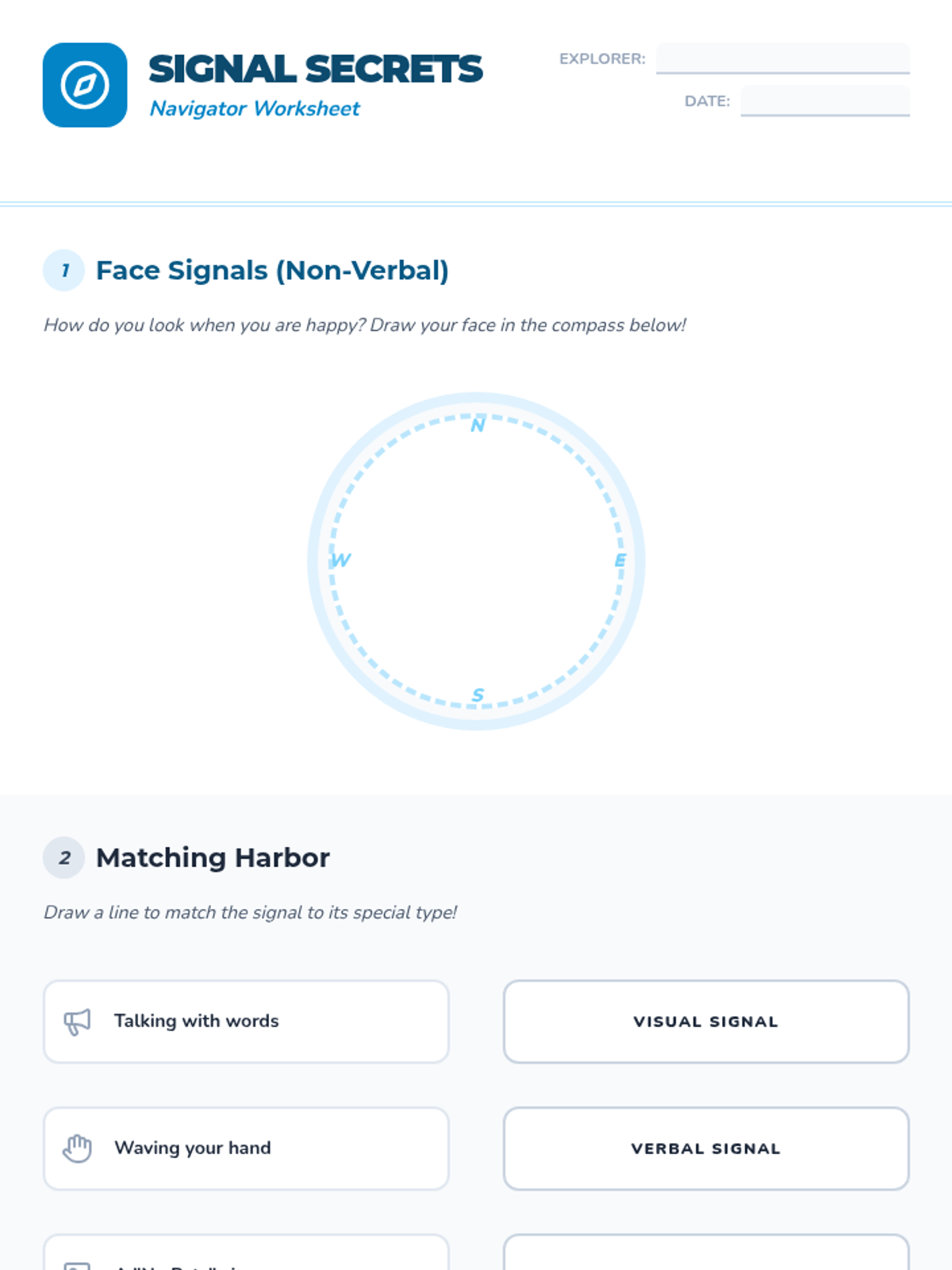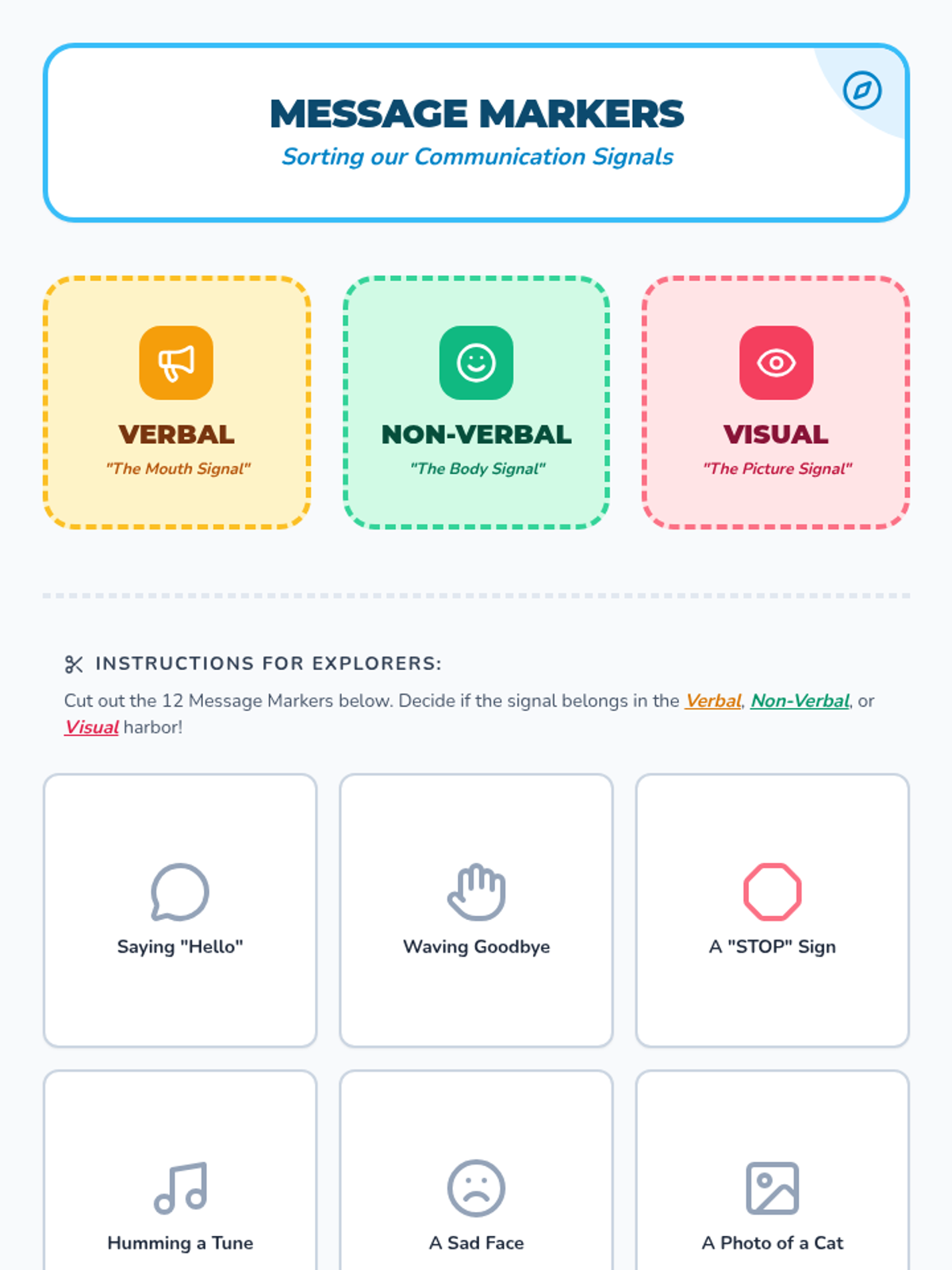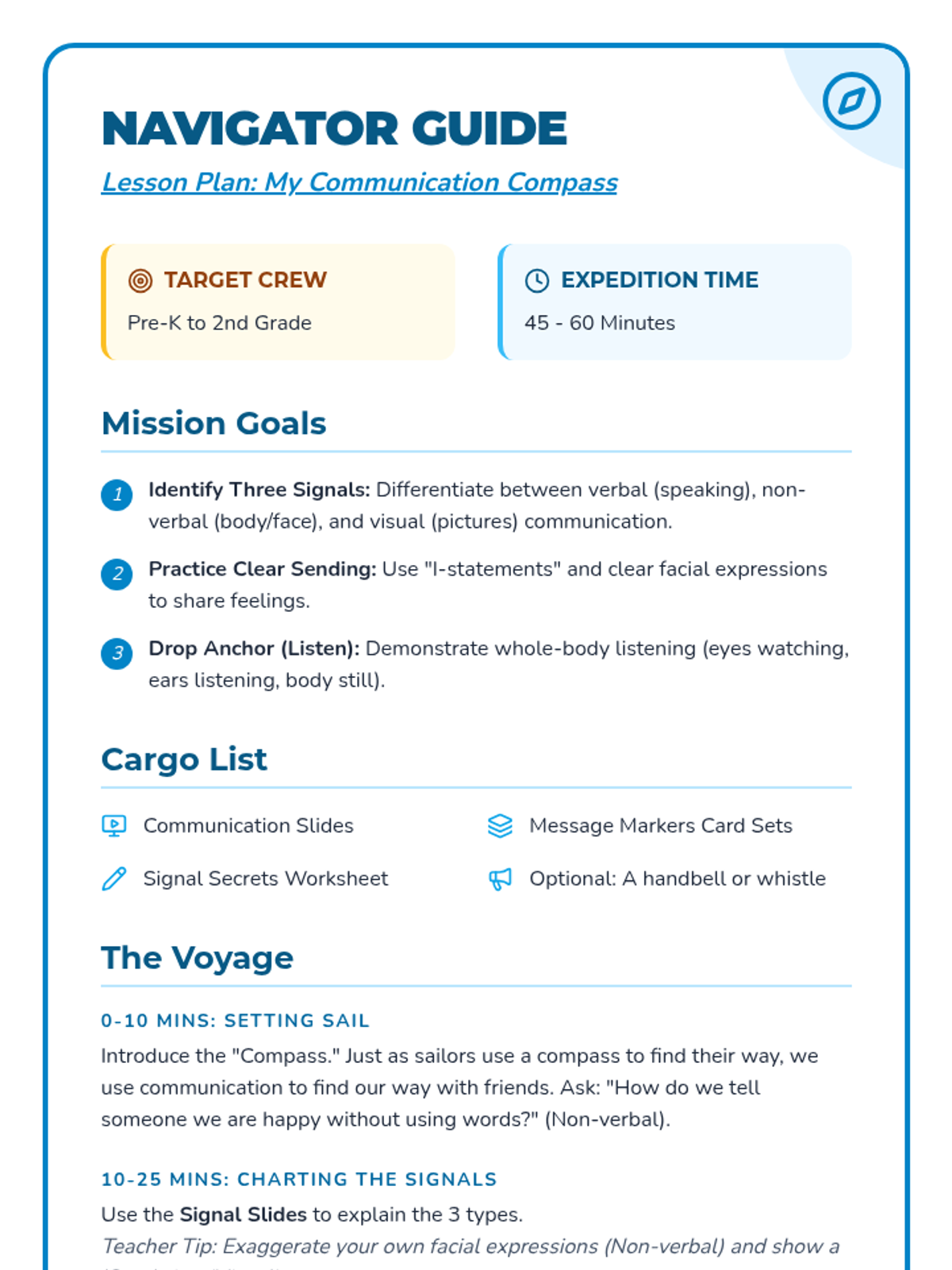 A foundational communication lesson for young learners using a nautical 'compass' metaphor to explore verbal, non-verbal, and visual communication. Students practice active listening and clear expression to navigate social interactions effectively.