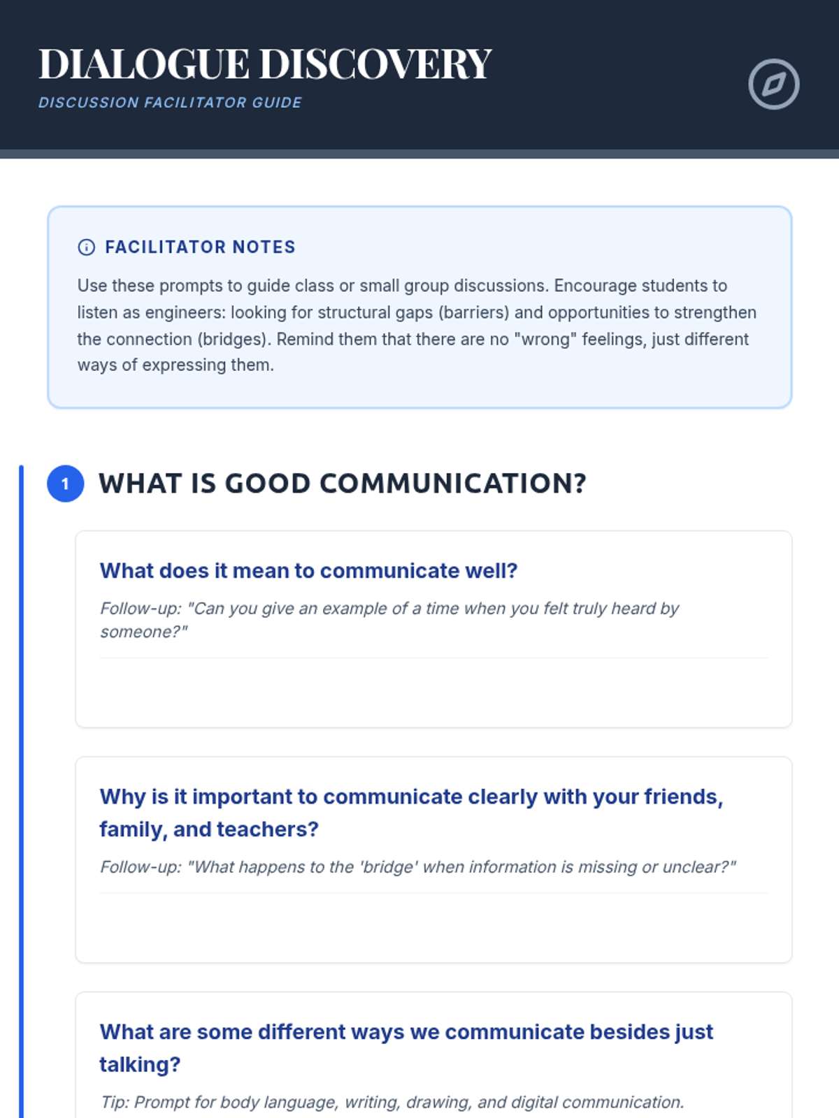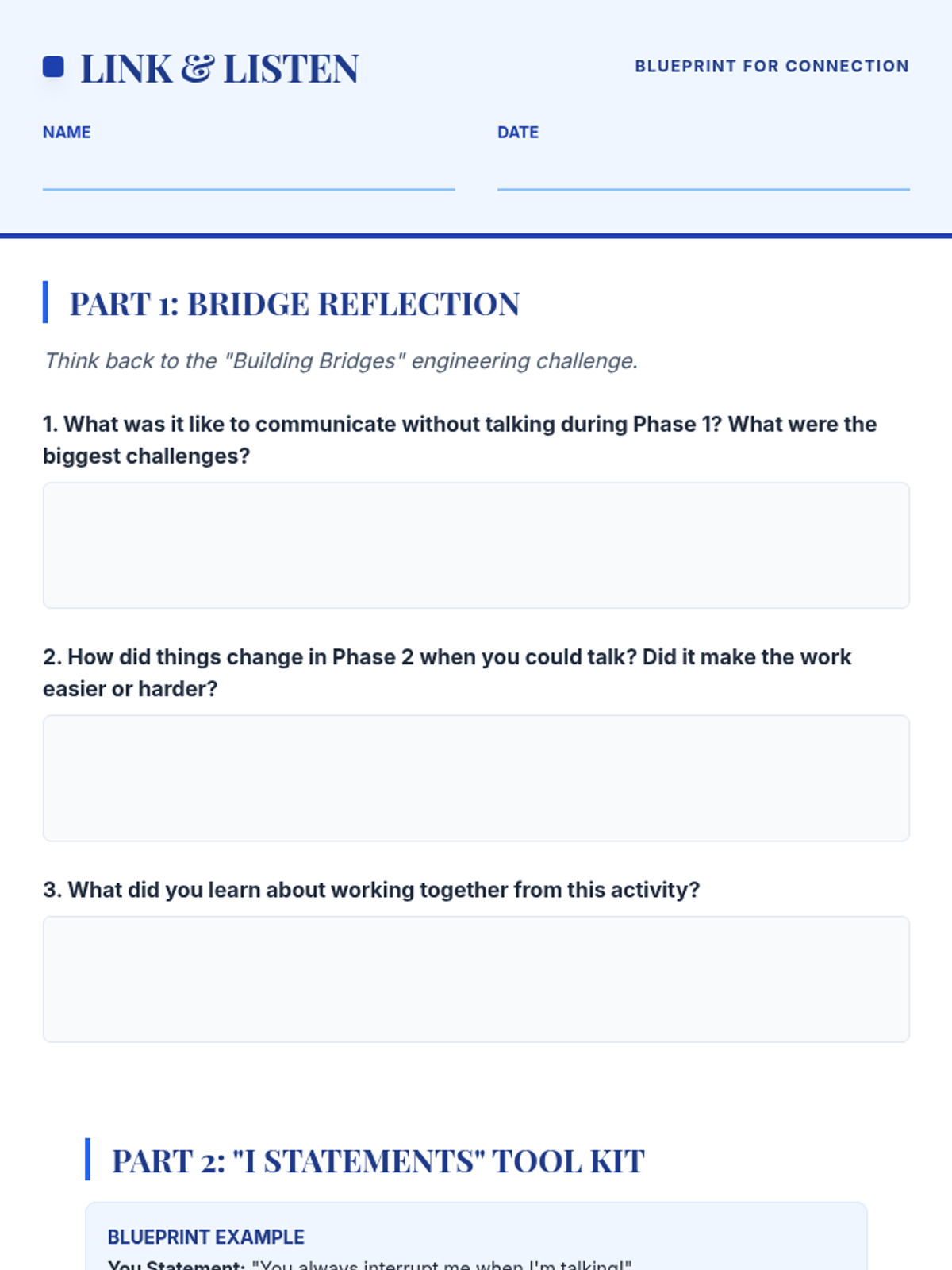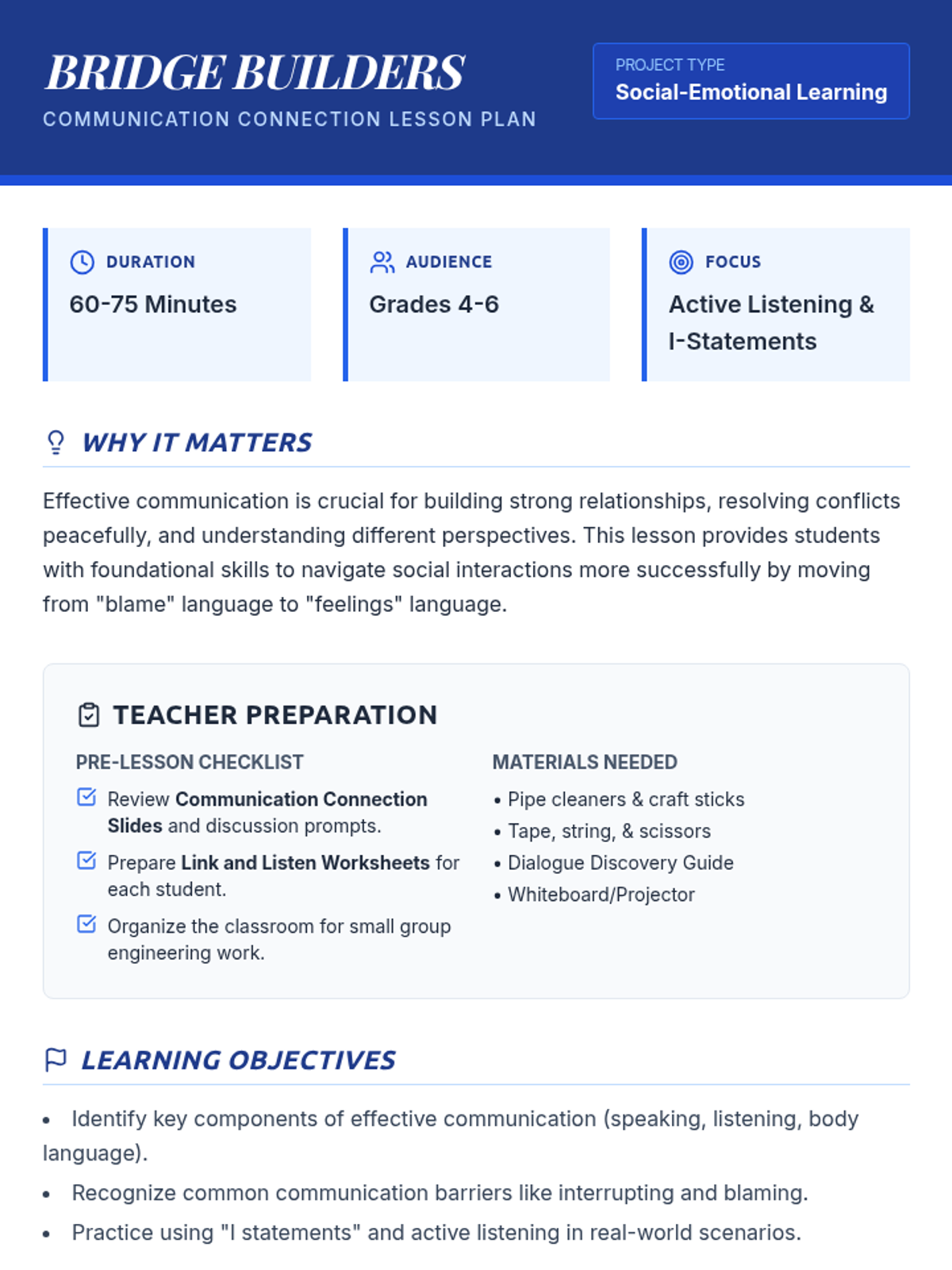 An empowering lesson for 4th-6th graders on effective communication, using the metaphor of bridges and barriers to teach active listening and 'I statements'. Students build physical bridges and practice verbal skills to strengthen social connections.