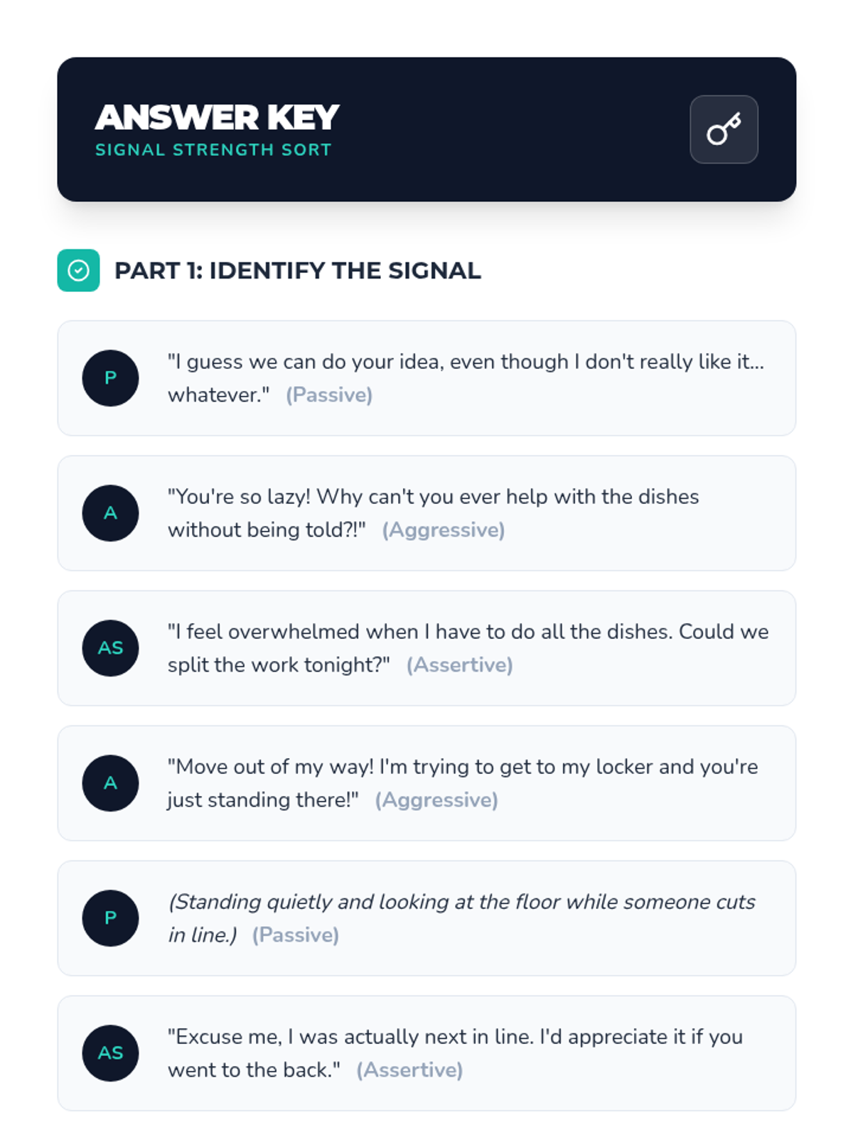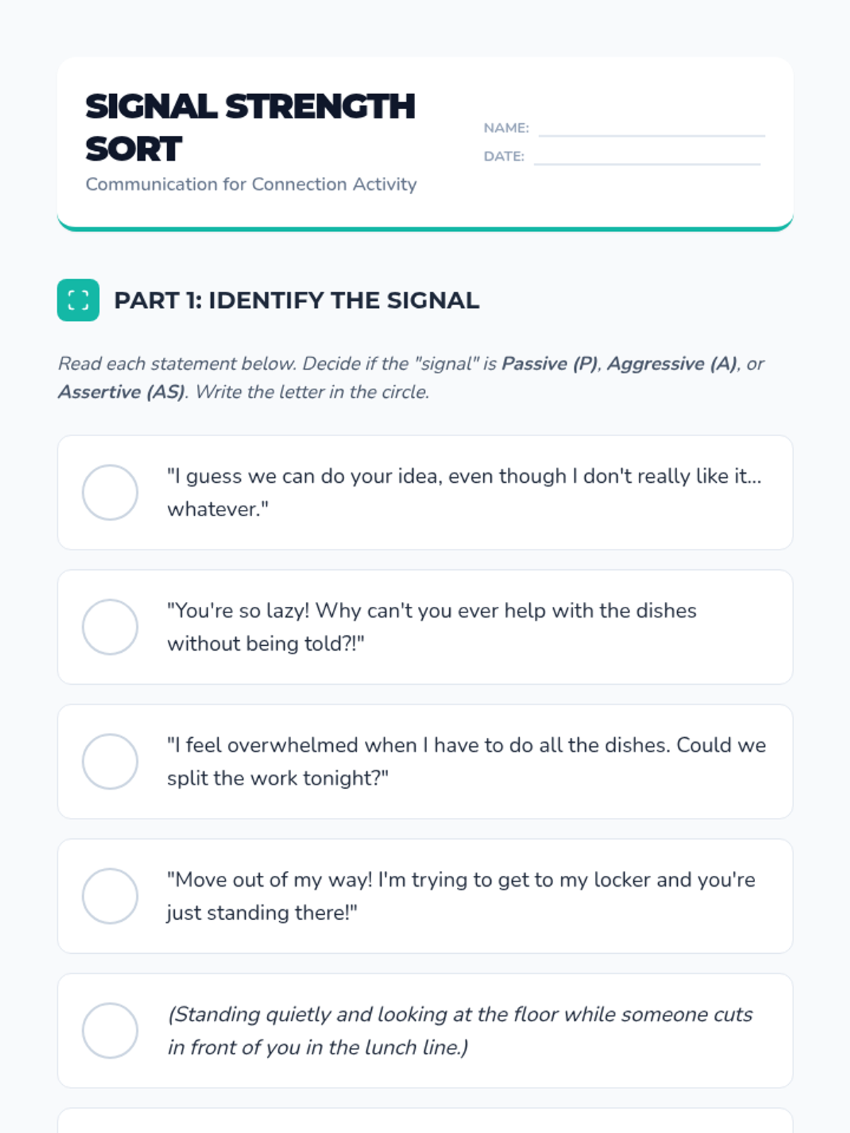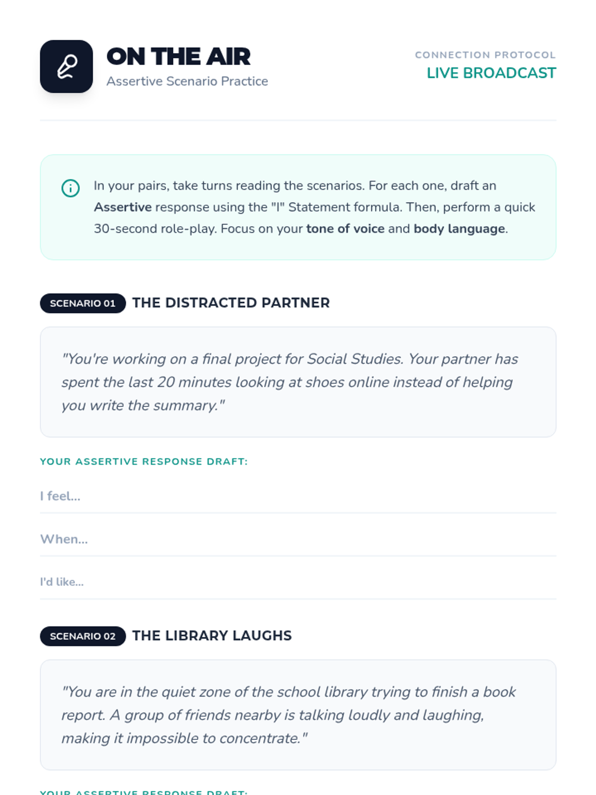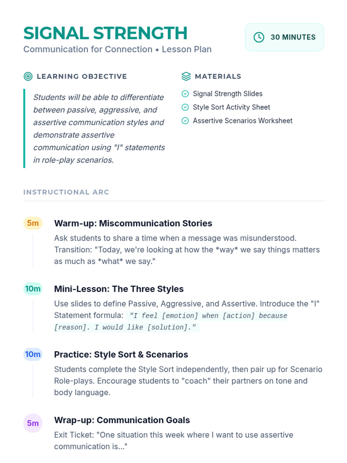 An 8th-grade lesson on mastering assertive communication. Students learn to identify passive, aggressive, and assertive styles, use 'I' statements, and navigate social conflicts with confidence.