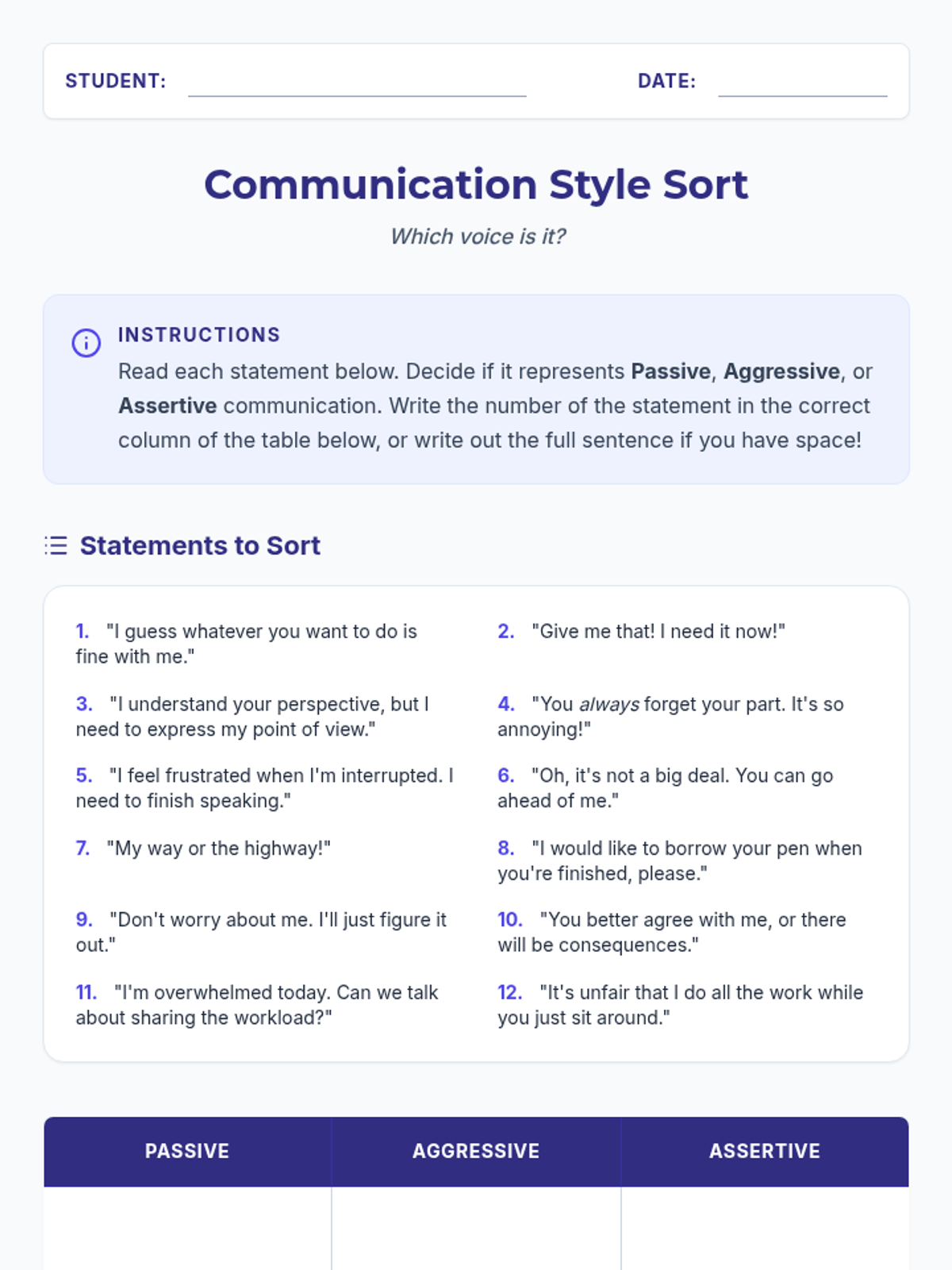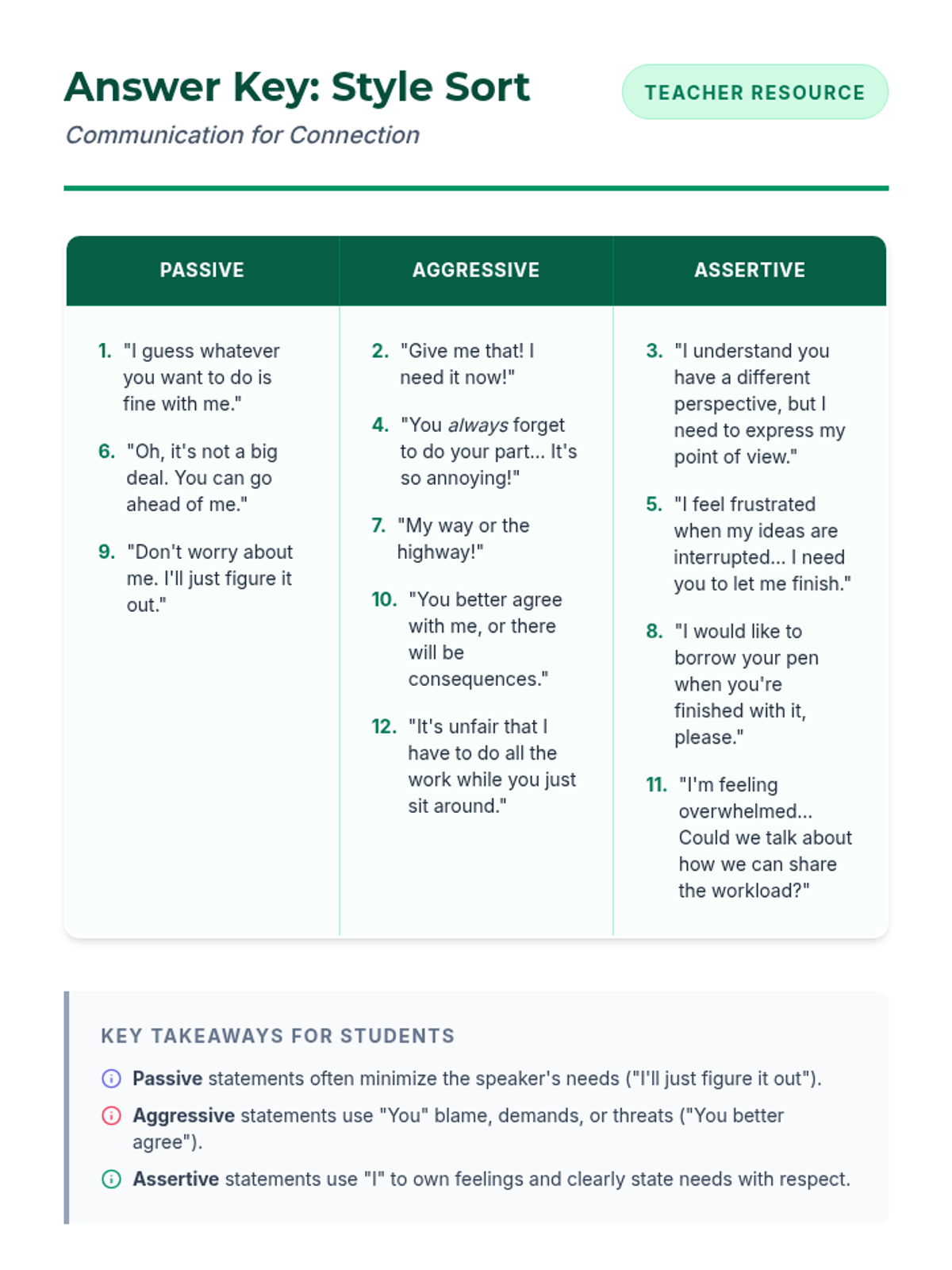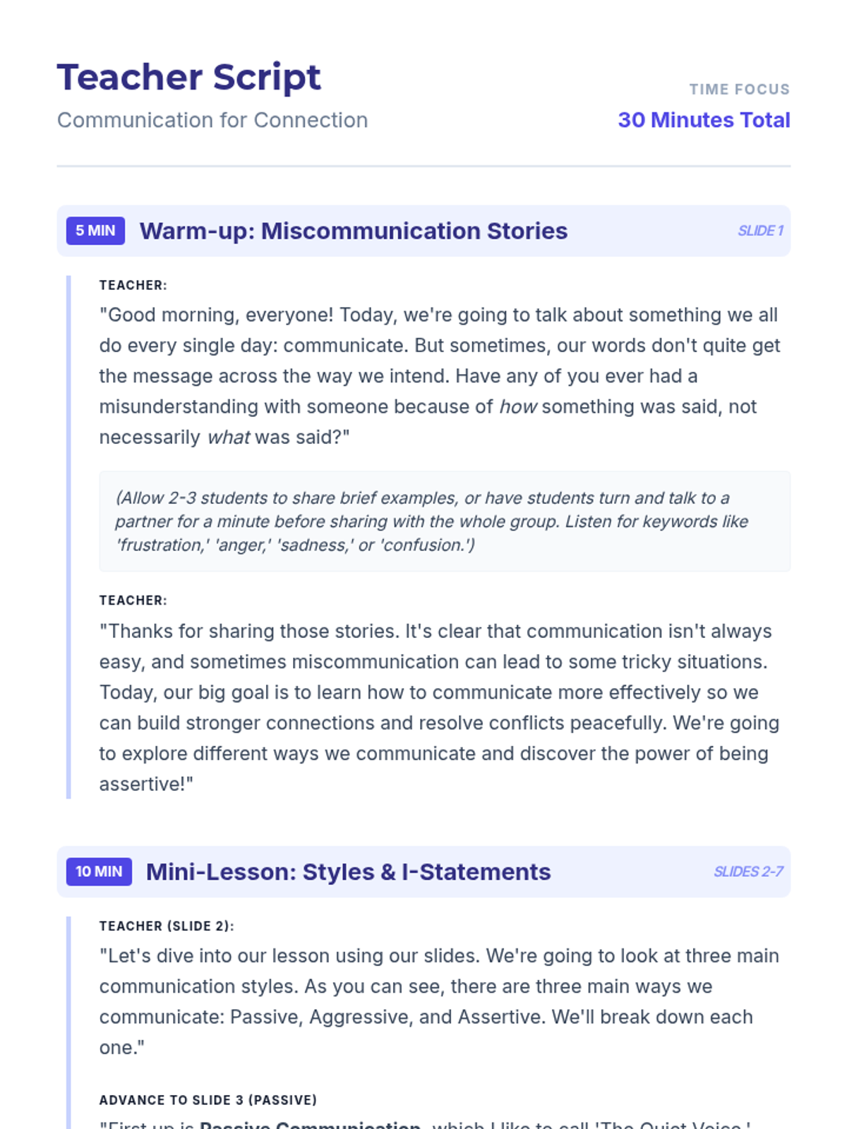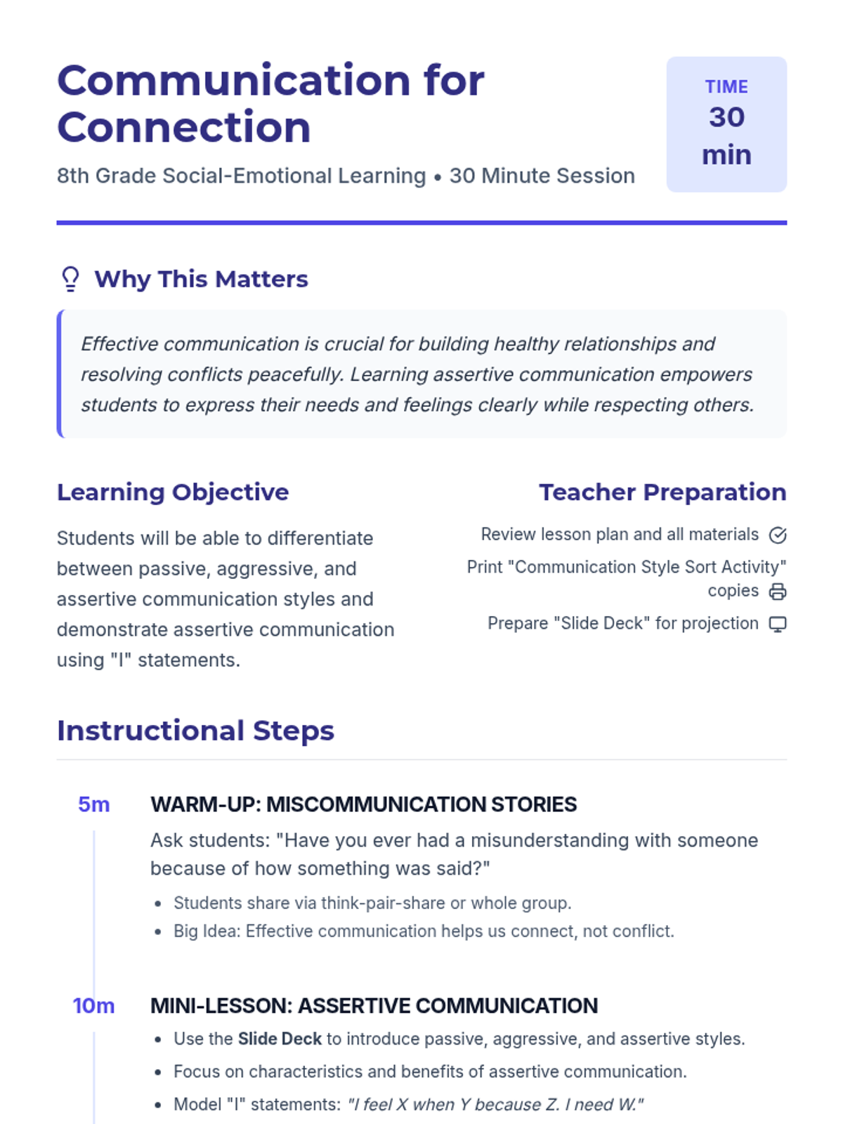 This lesson helps 8th-grade students understand different communication styles and practice assertive communication using 'I' statements. Students will learn to differentiate between passive, aggressive, and assertive styles to build healthier relationships and resolve conflicts.