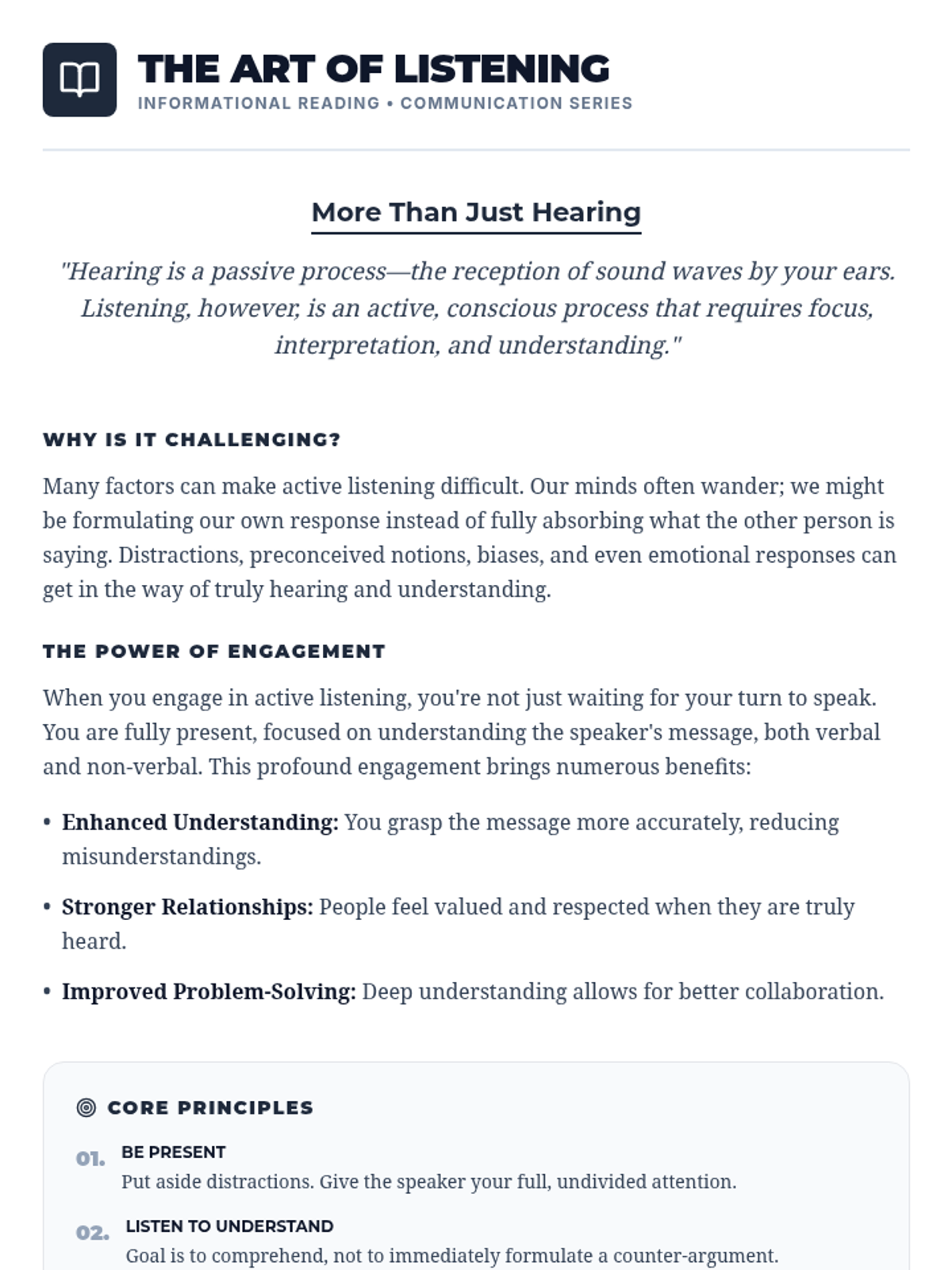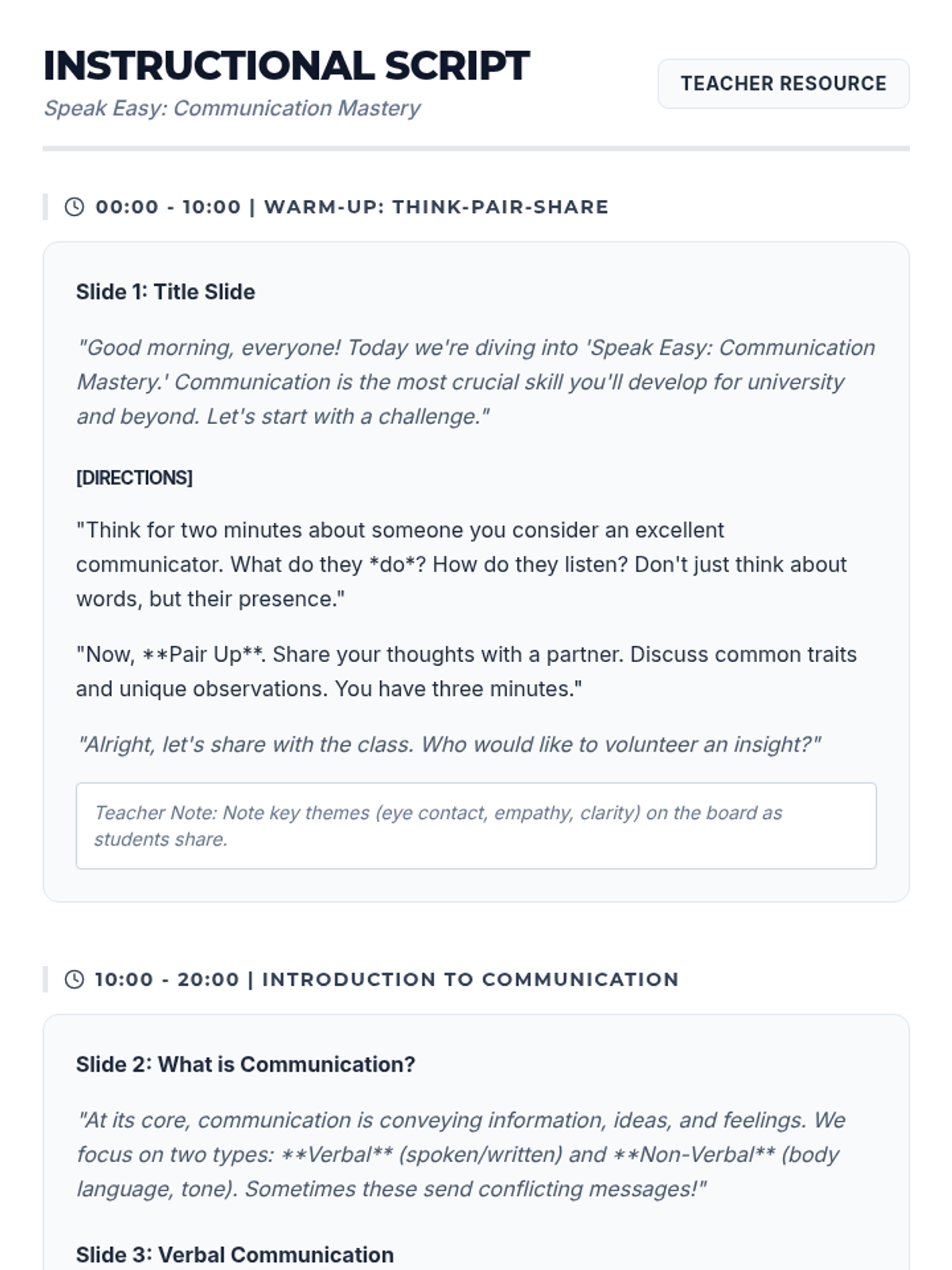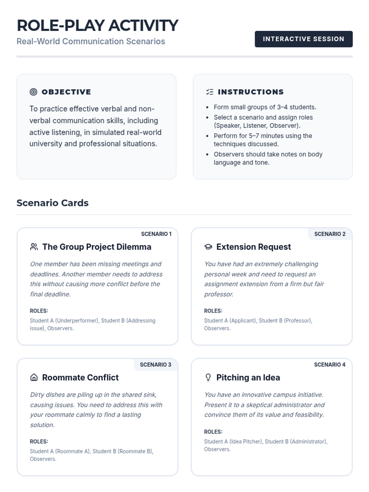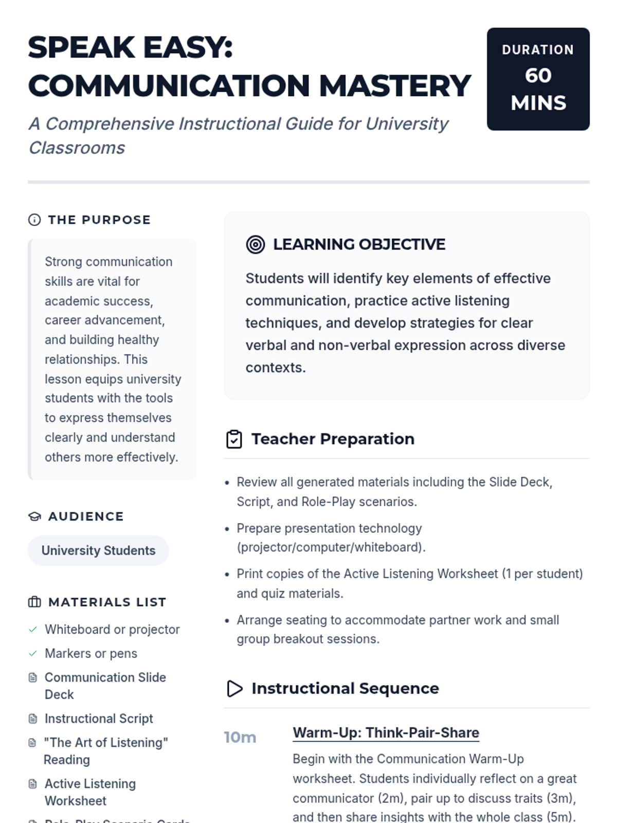 A 60-minute interactive lesson for university students focusing on essential verbal, non-verbal, and active listening skills for academic and professional success.
