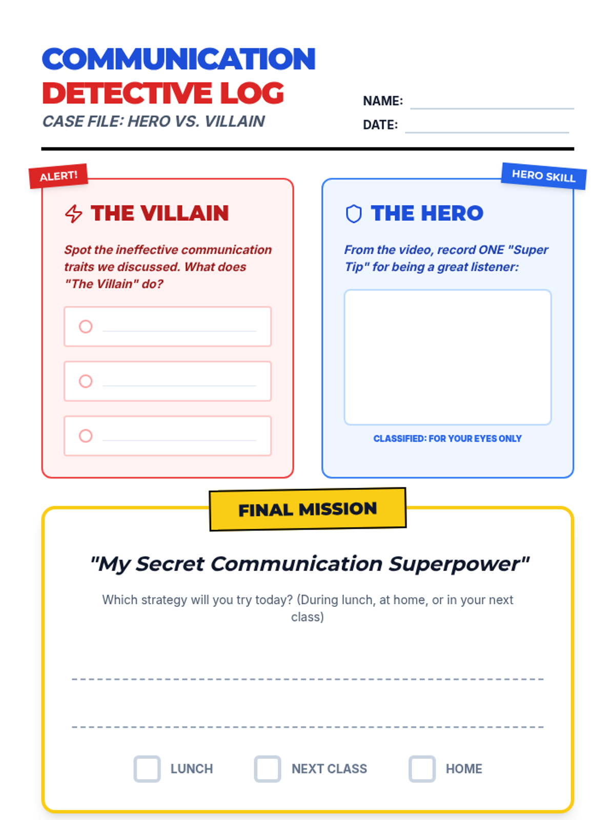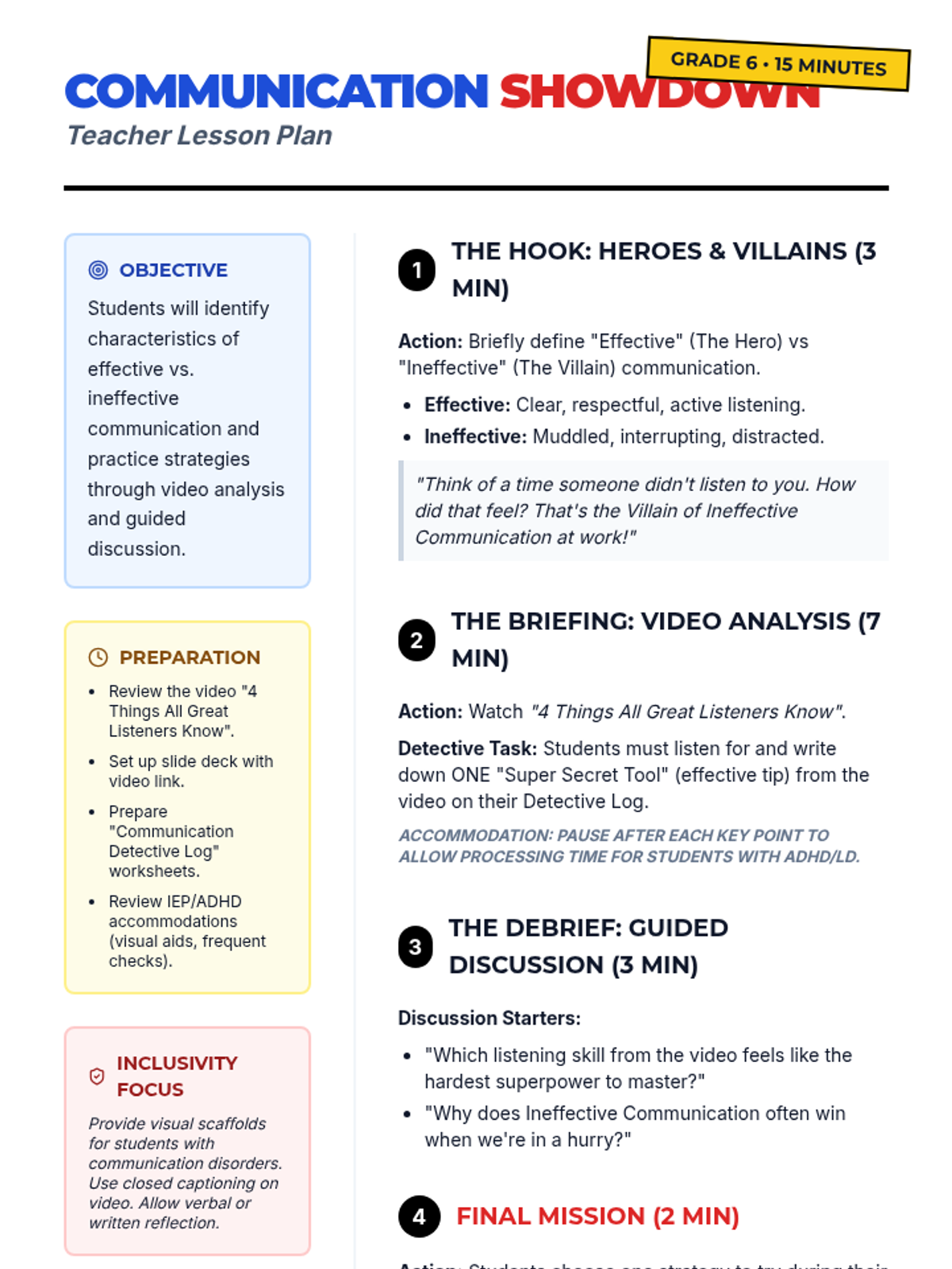 A fast-paced, 15-minute lesson for 6th graders to identify and practice effective communication strategies using a video-based 'showdown' between clear and unclear styles.