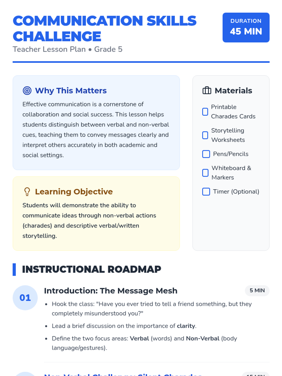 Students will practice verbal and non-verbal communication through charades and storytelling exercises to enhance collaboration and understanding.