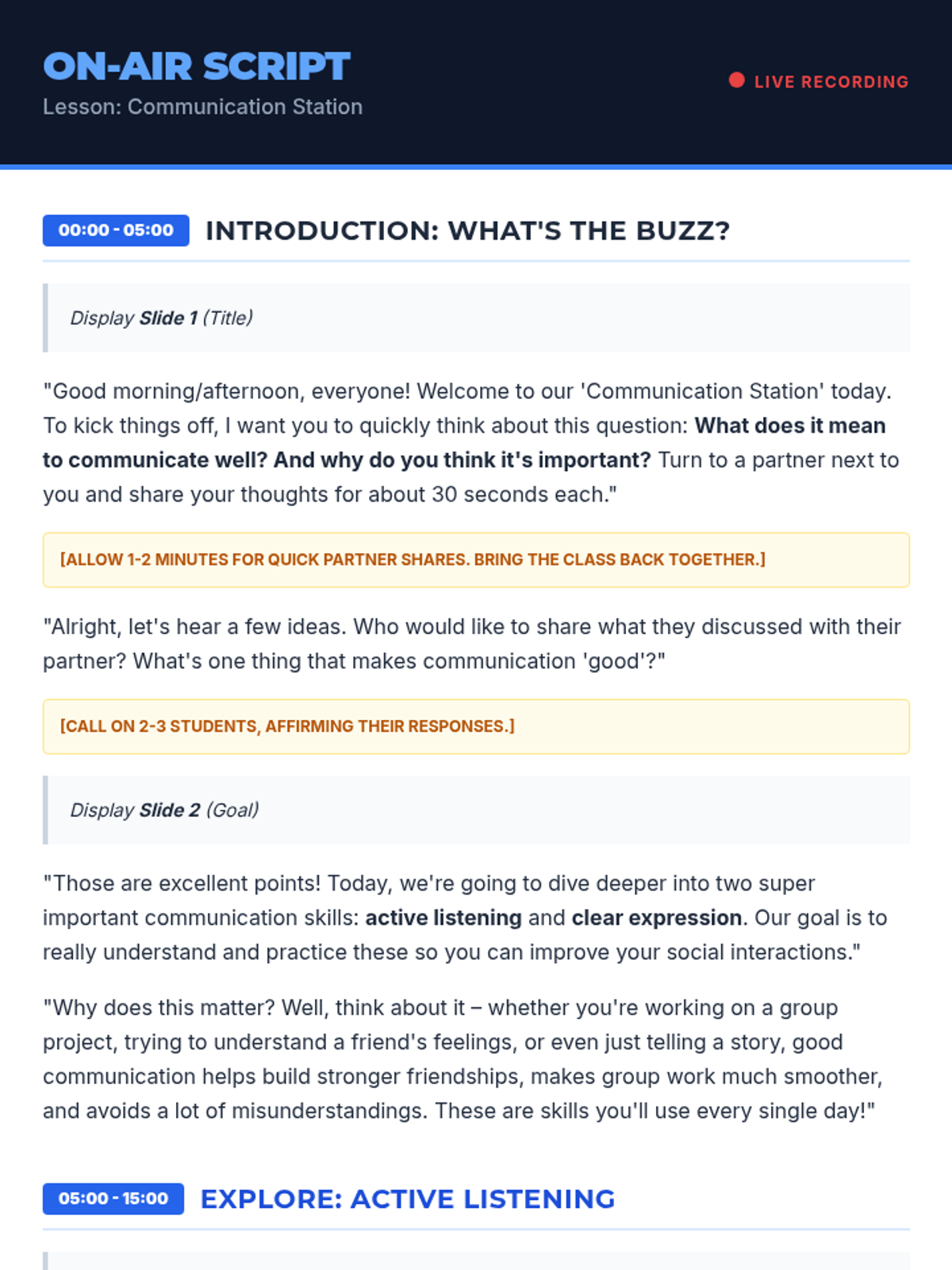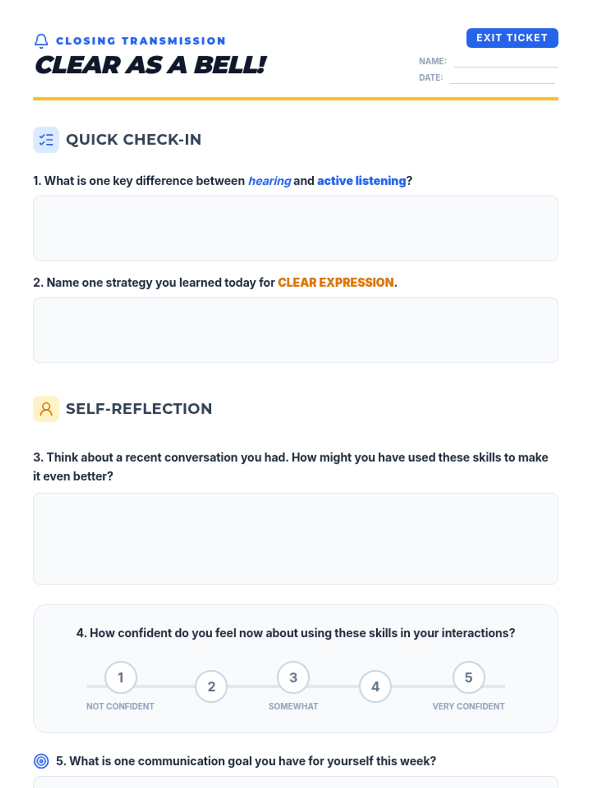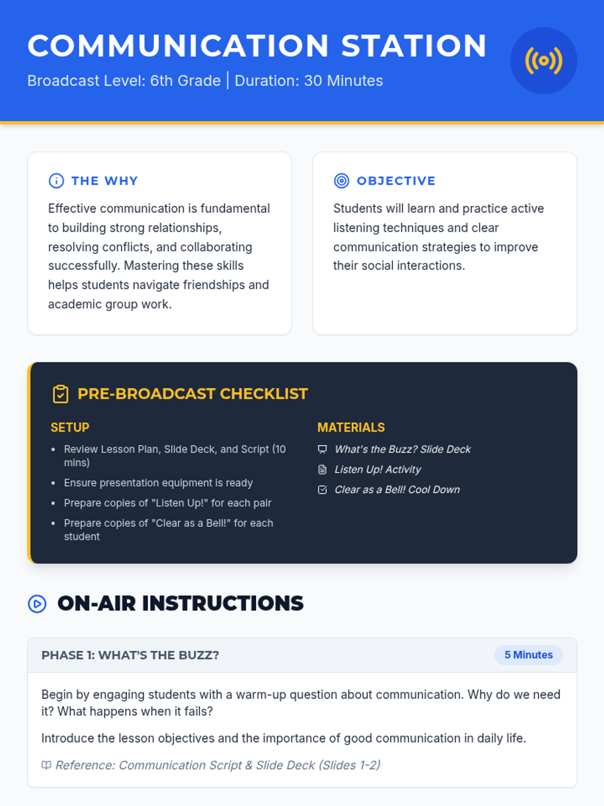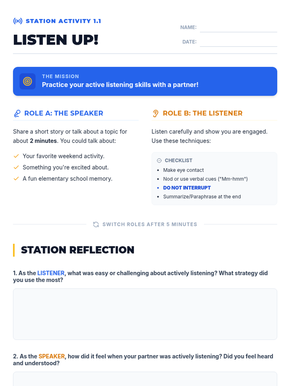 A 30-minute lesson for 6th graders to enhance social interactions through active listening and clear expression. Students participate in partner activities and reflections to build strong communication habits.