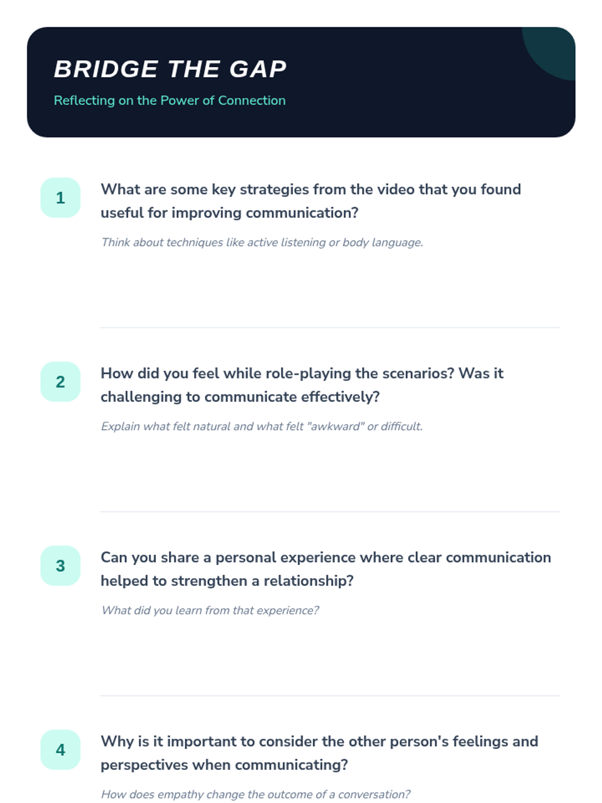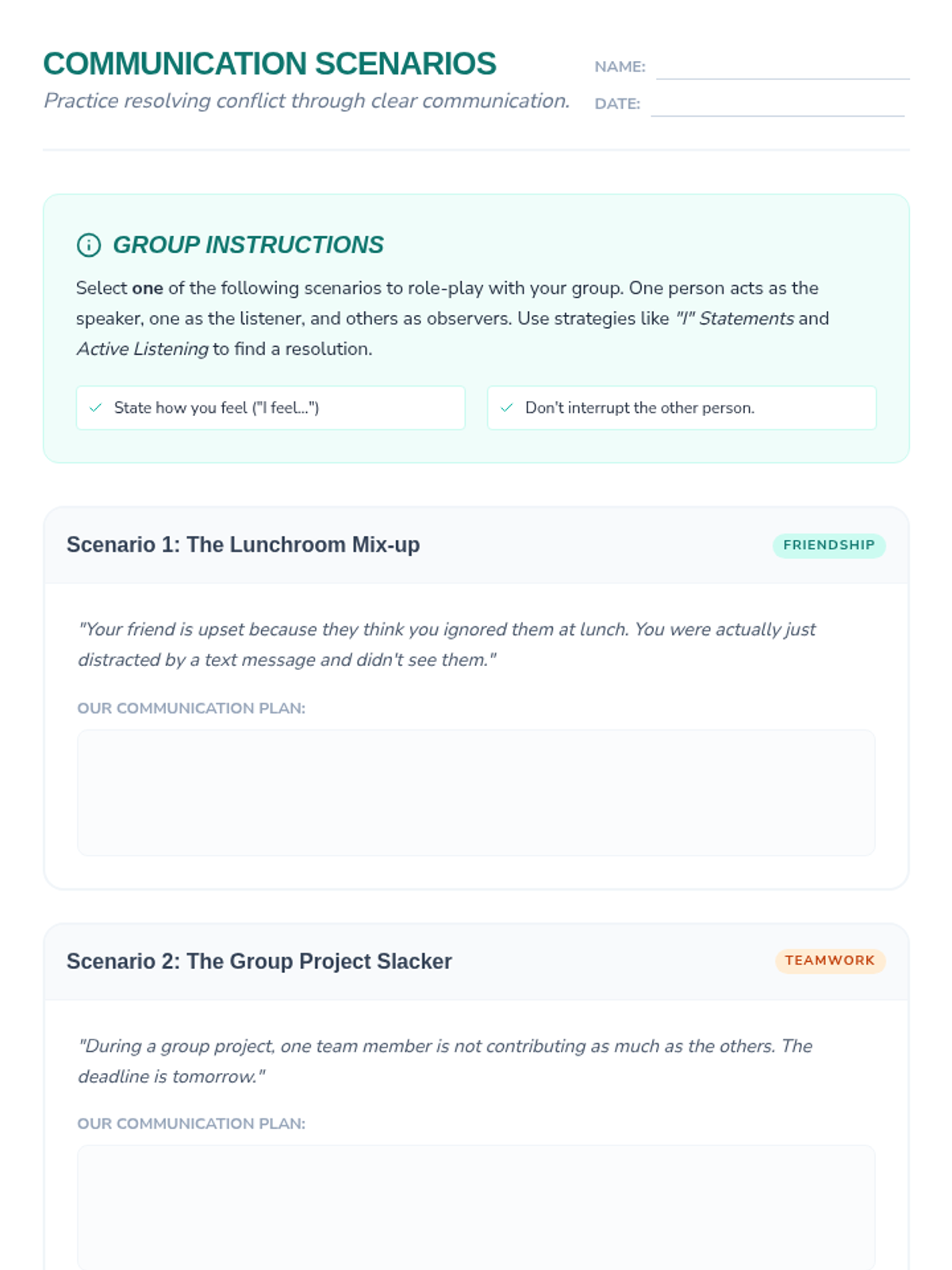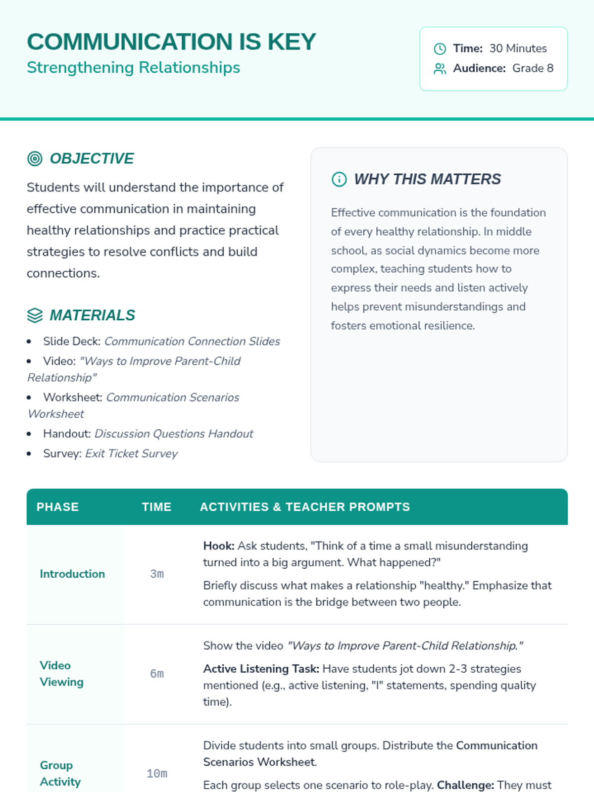 A 30-minute lesson for 8th-grade students focused on effective communication strategies to build and maintain healthy relationships, featuring role-play and video analysis.