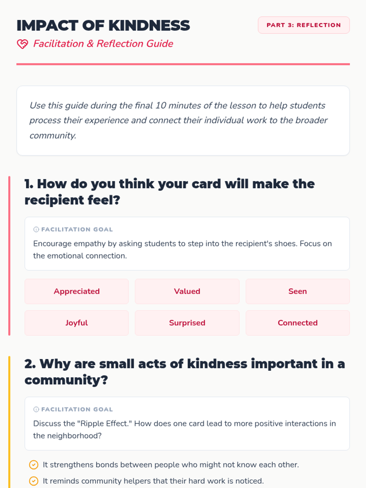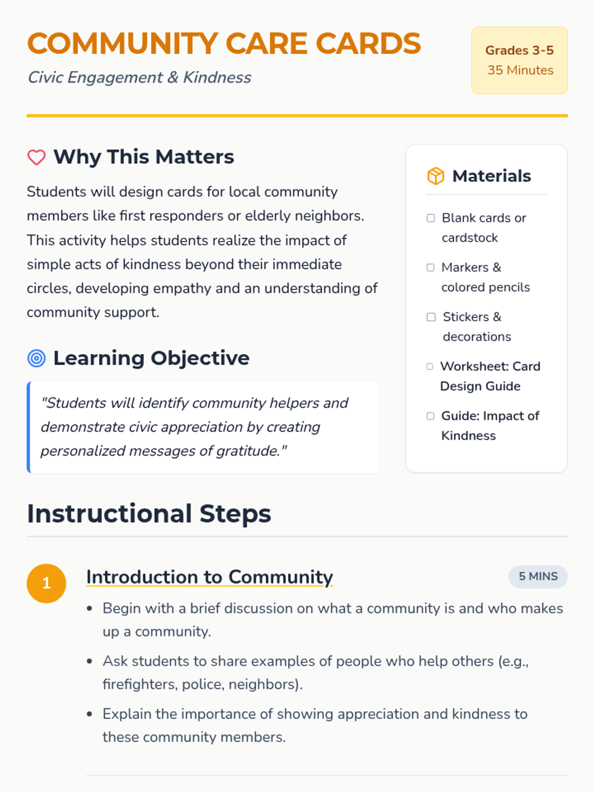 A heartfelt lesson for grades 3-5 that encourages civic engagement through the creation of appreciation cards for community helpers and neighbors. Students explore the concept of community and the ripple effect of small acts of kindness.