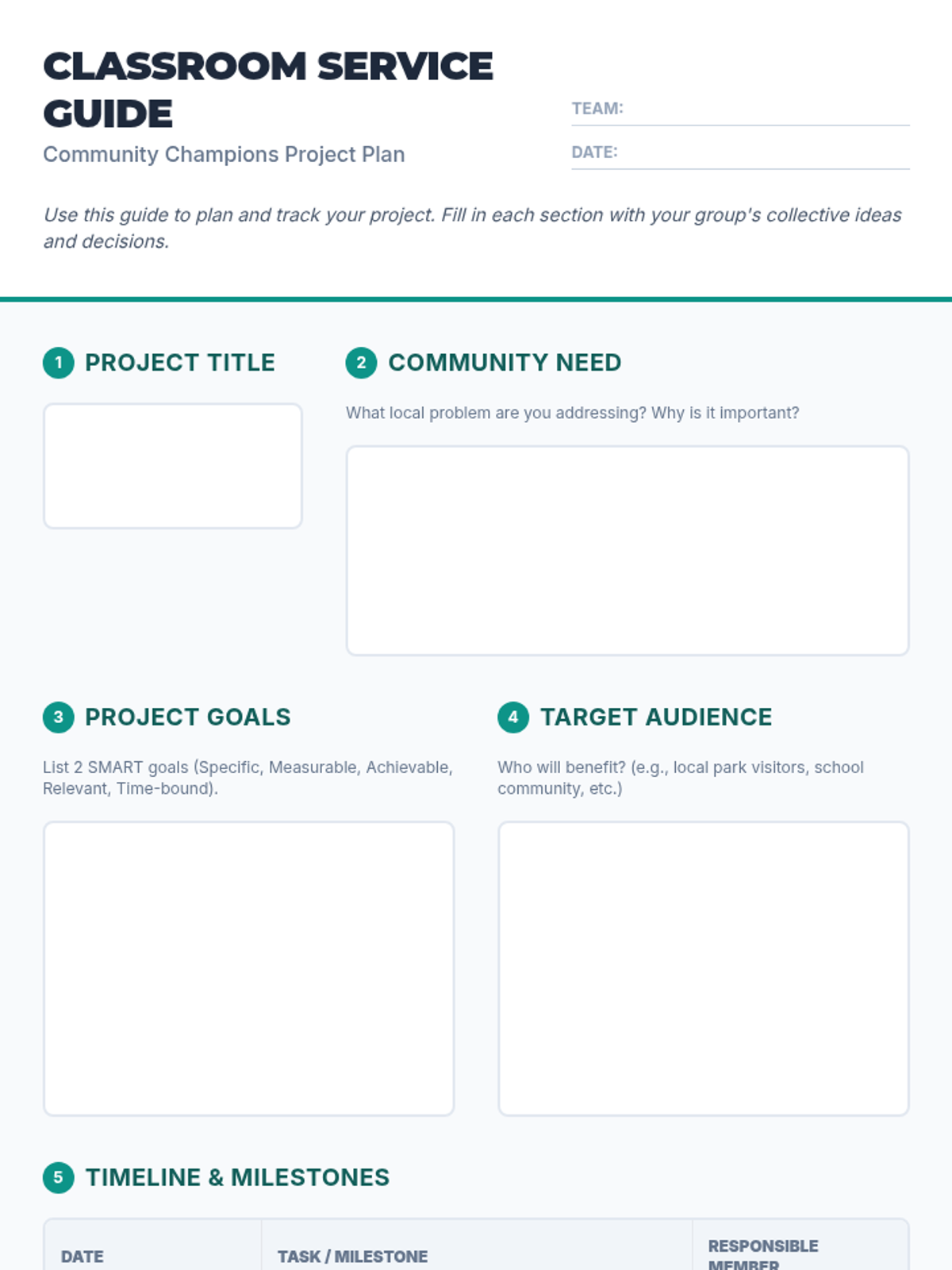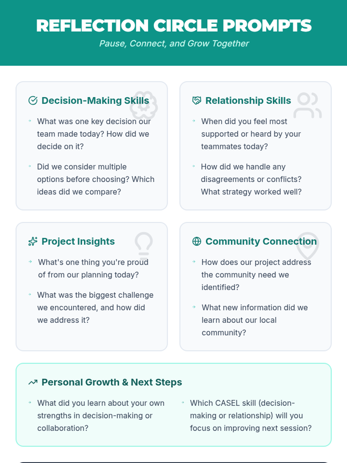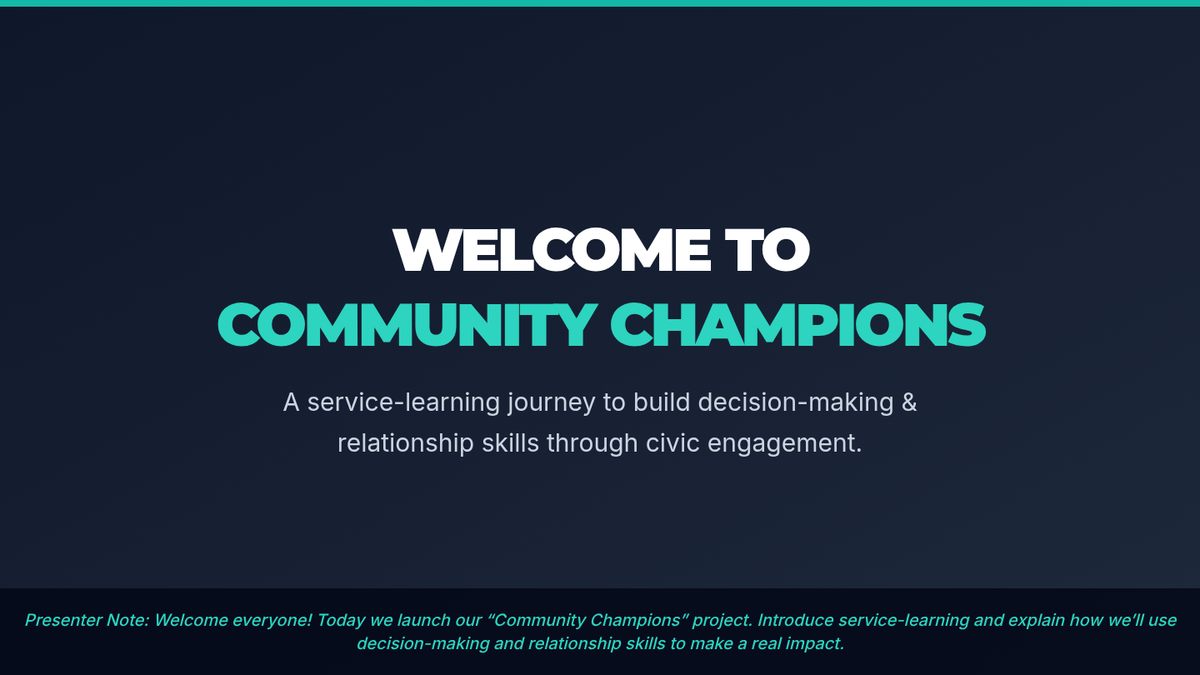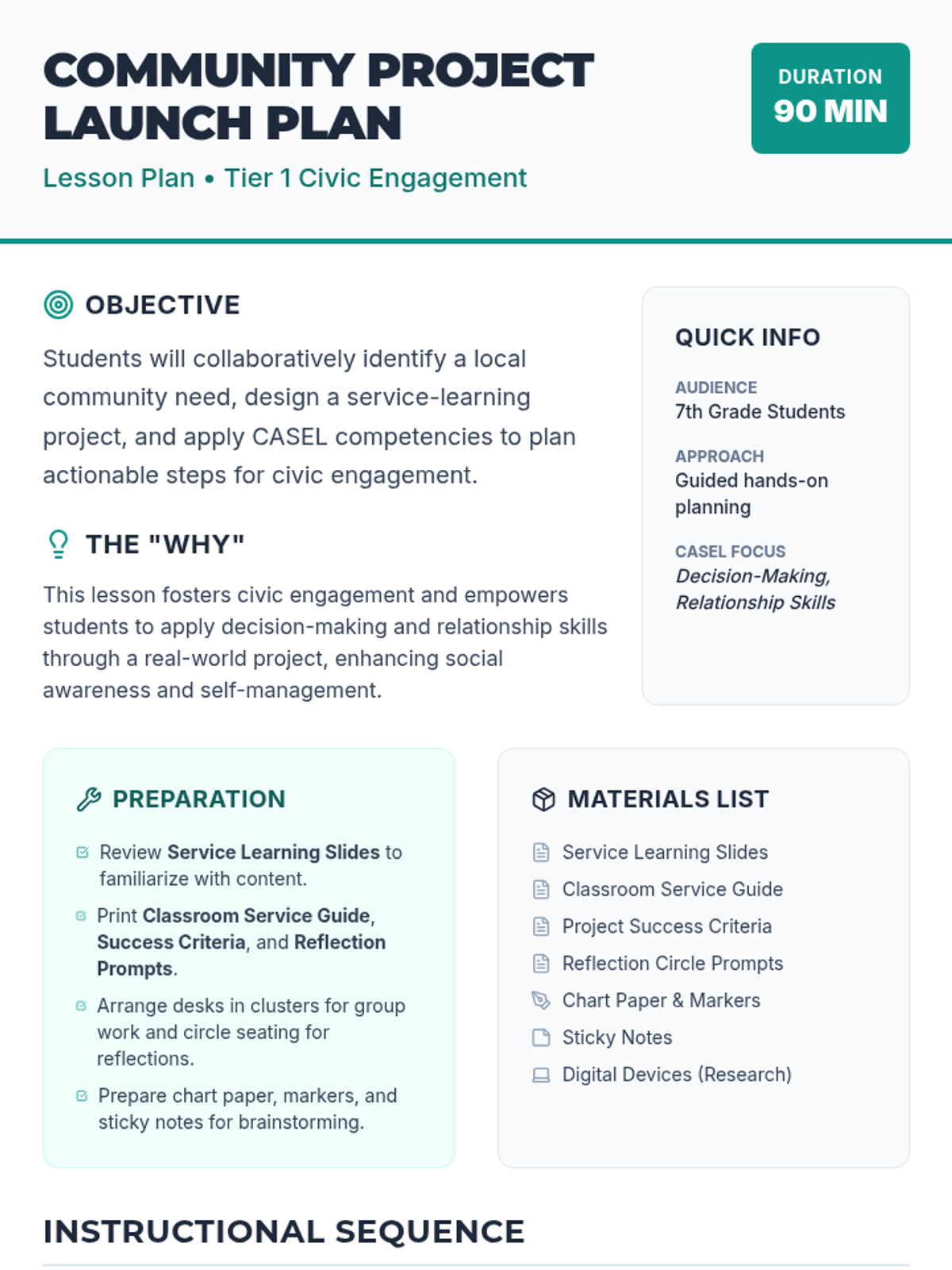 A service-learning project guide for 7th graders to develop decision-making and relationship skills through civic engagement. This 90-minute lesson empowers students to plan and initiate a real-world community project aligned with CASEL competencies.