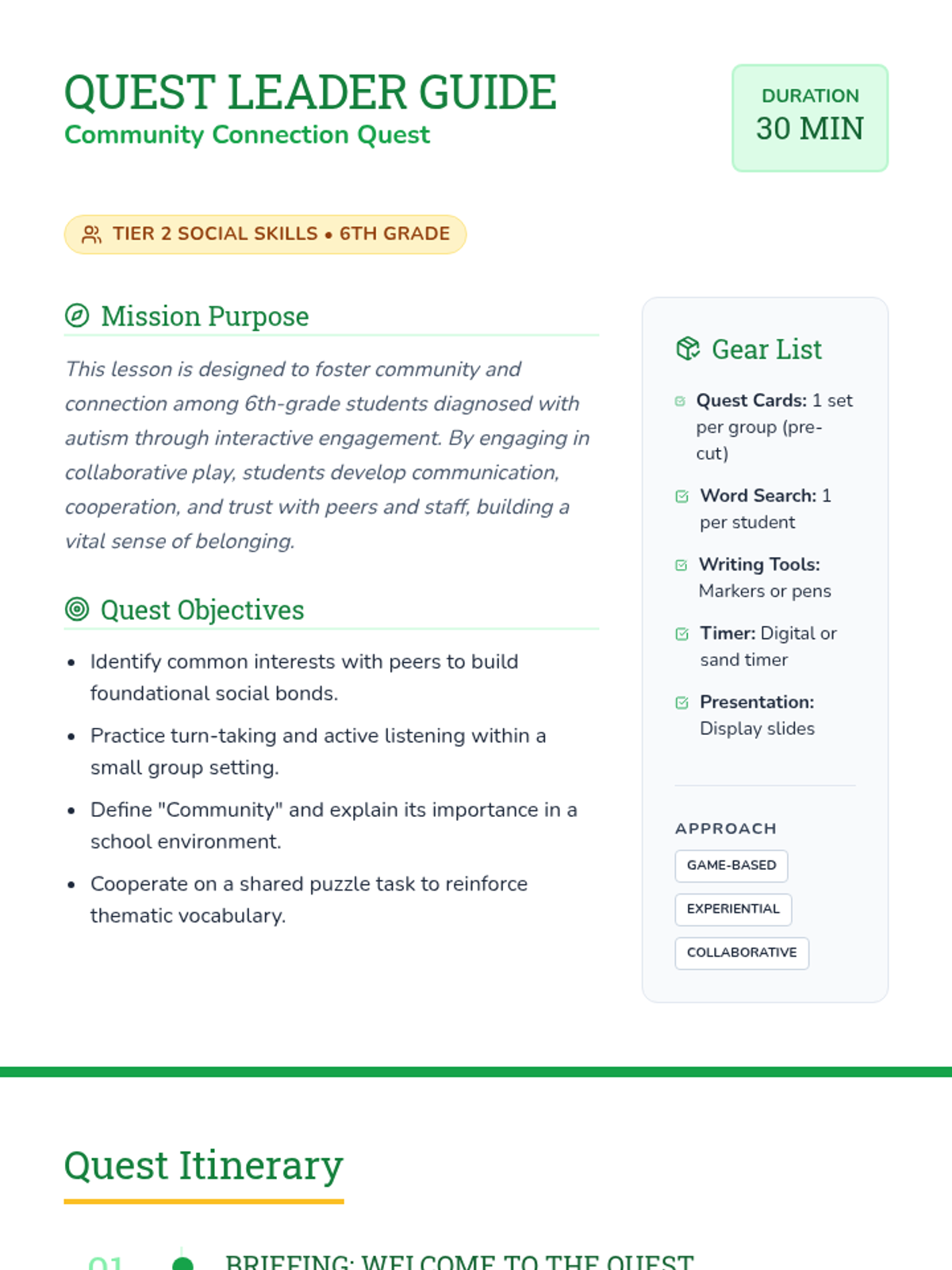 A social skills lesson for 6th-grade students with autism designed to foster connection, communication, and community through collaborative games and interactive tasks.