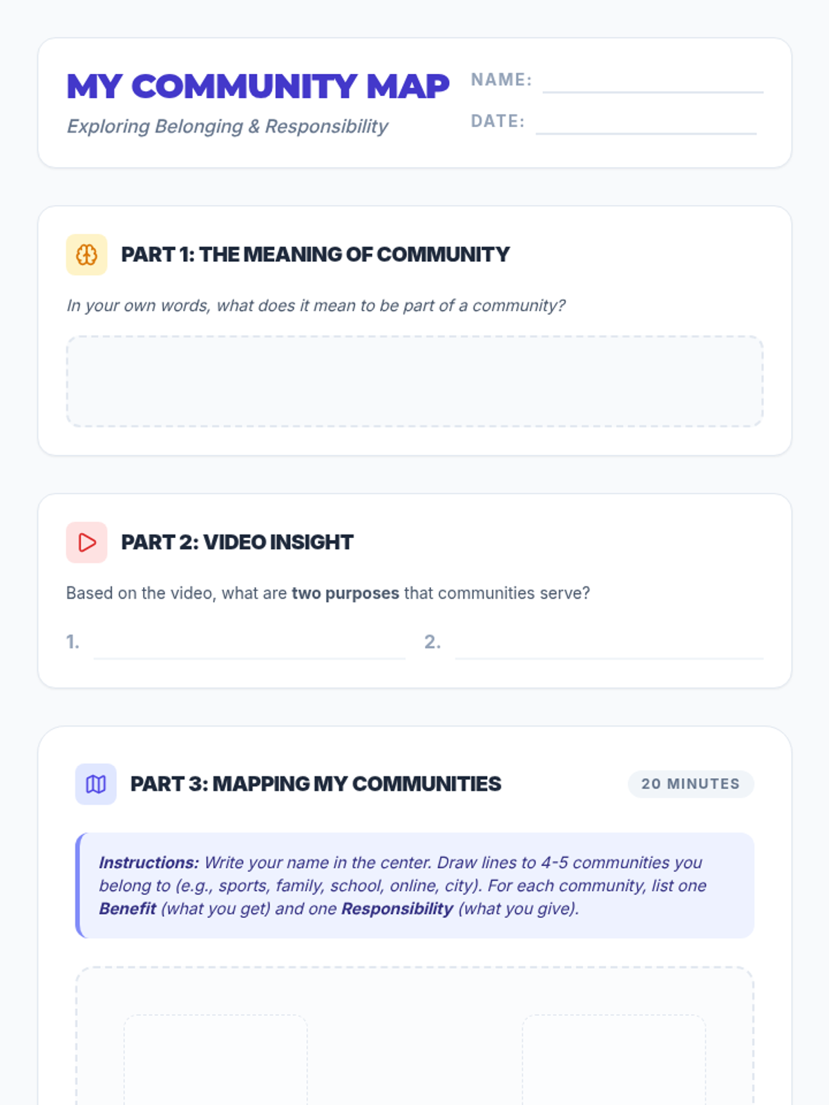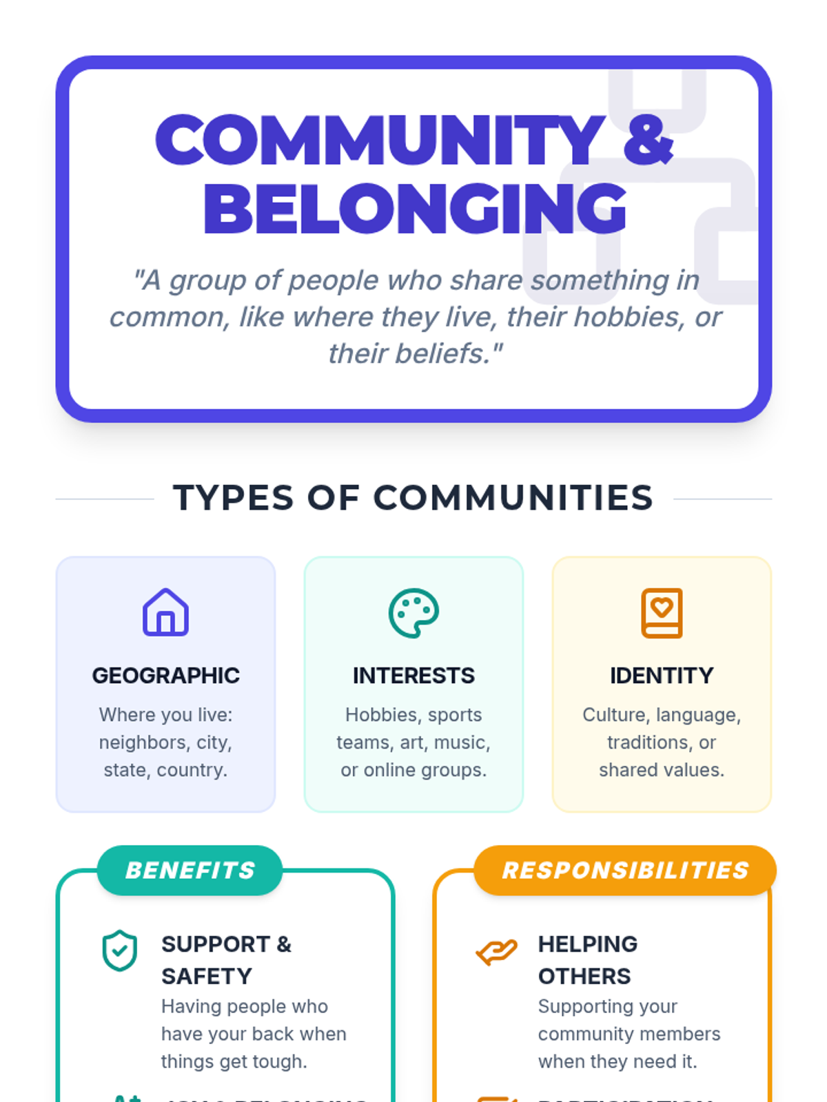 Students will explore what it means to belong to a community, identifying the diverse groups they are part of and the reciprocal relationship between personal benefits and communal responsibilities.