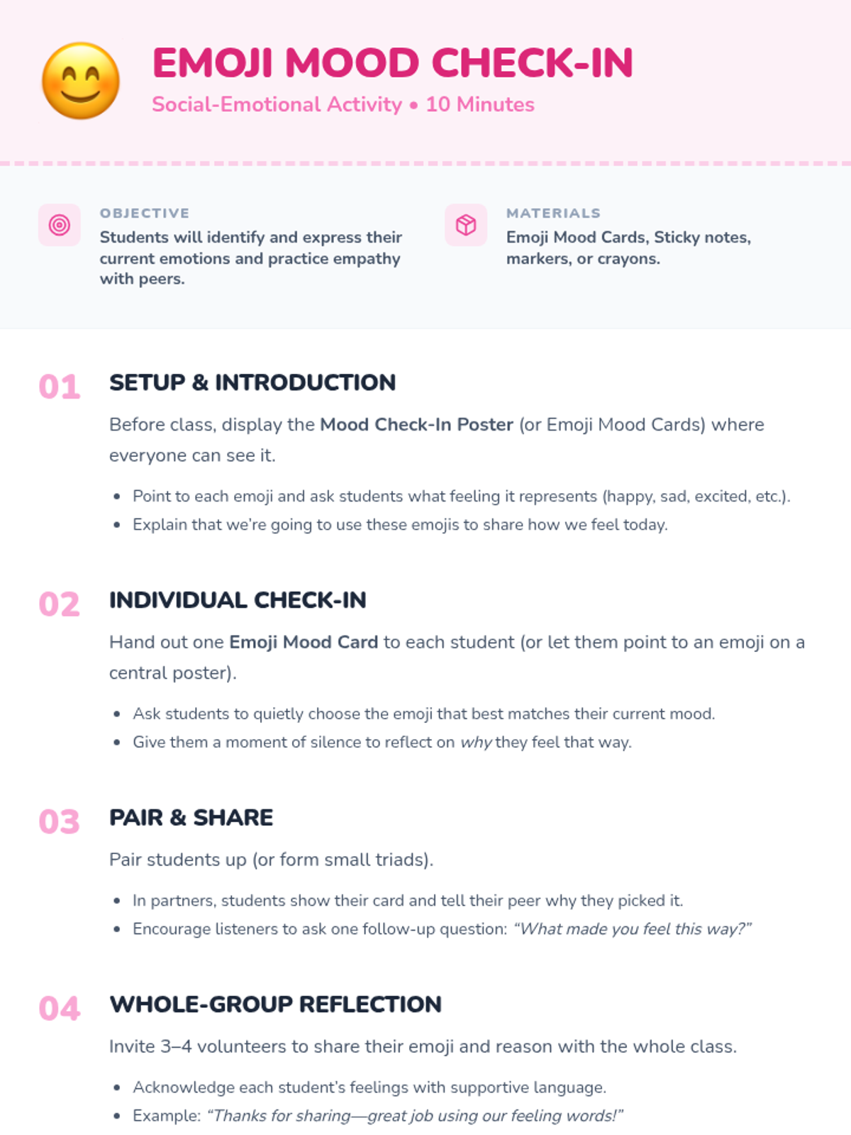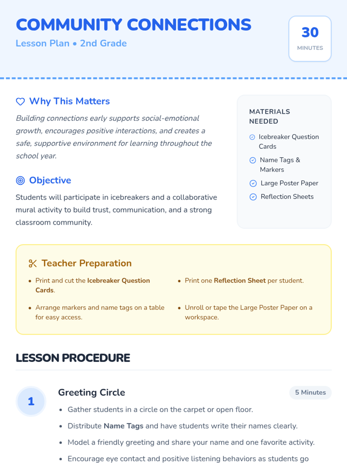 A 30-minute interactive lesson for 2nd graders focused on building classroom community through icebreakers, collaborative art, and social-emotional check-ins.