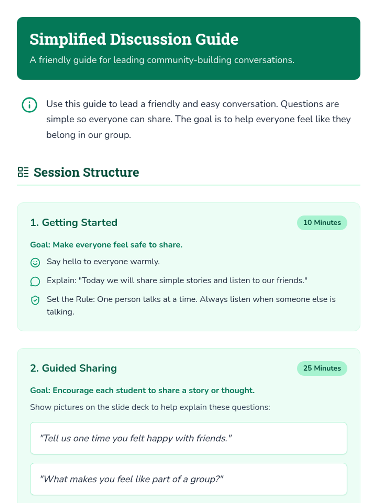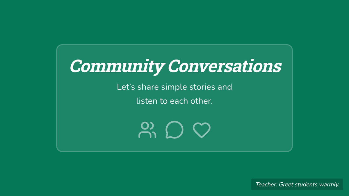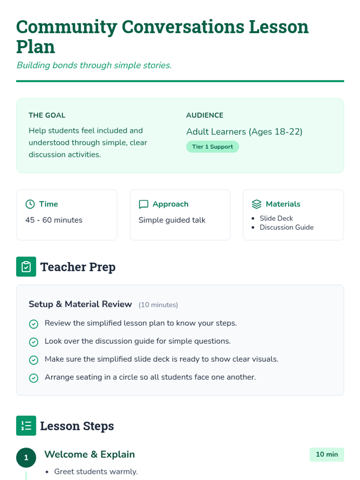 A structured, visual-heavy lesson designed for students with intellectual disabilities (ages 18-22) to practice sharing personal stories and active listening to build community.