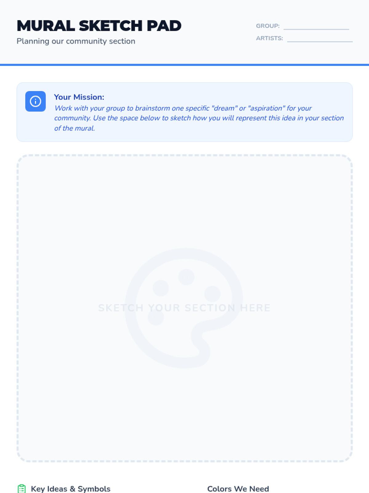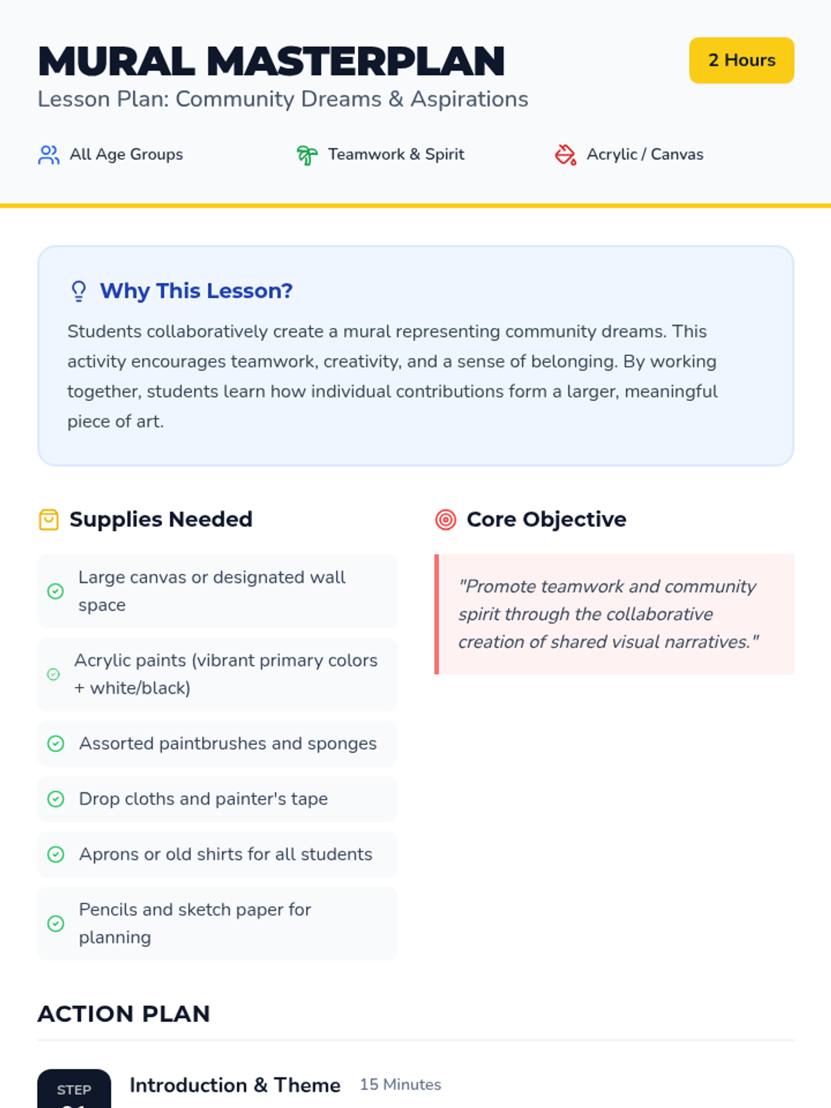 A collaborative art lesson where students design and paint a mural representing their collective dreams and community aspirations, focusing on teamwork and creative expression.