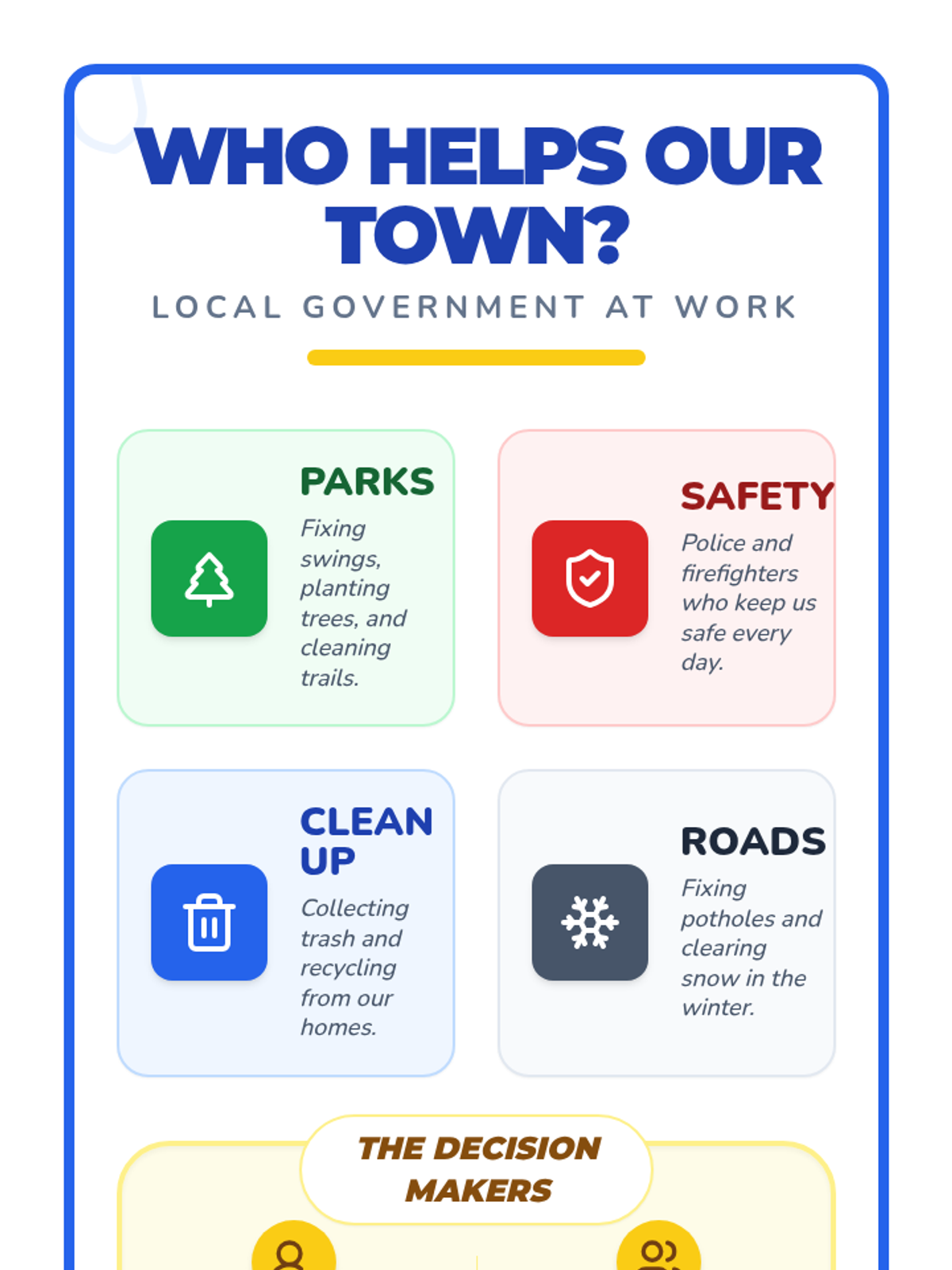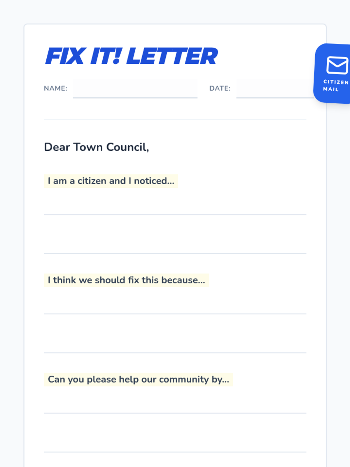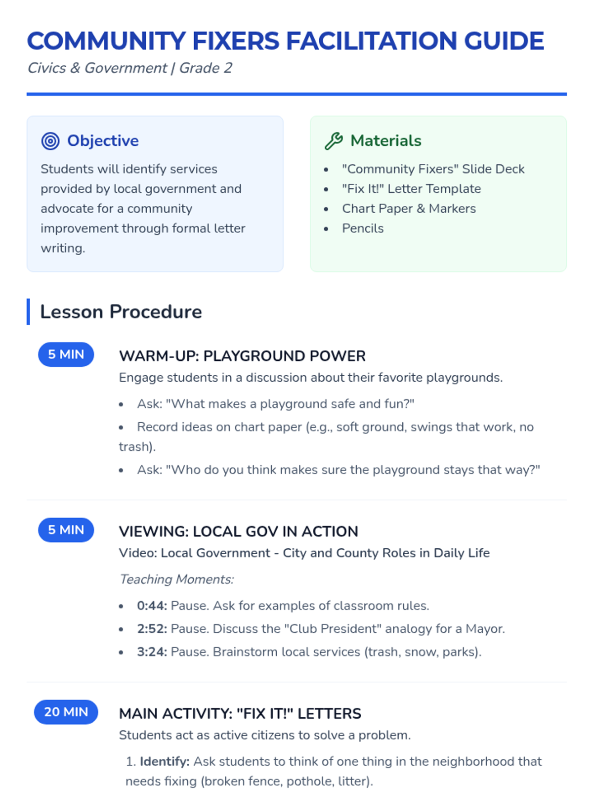Students explore the roles of local government, specifically Mayors and City Councils, through a video about civic services. They learn how citizens can advocate for change by writing a 'Fix It!' letter to address a specific community problem like a broken swing or litter.