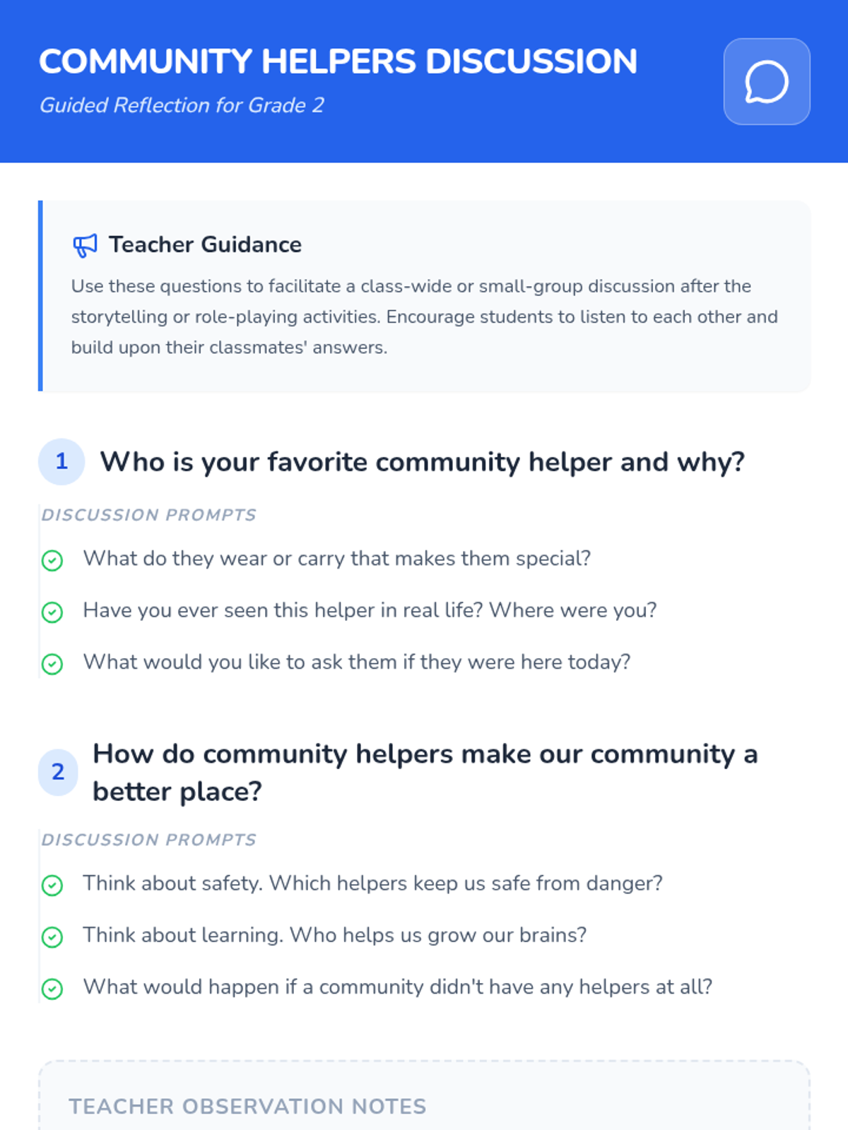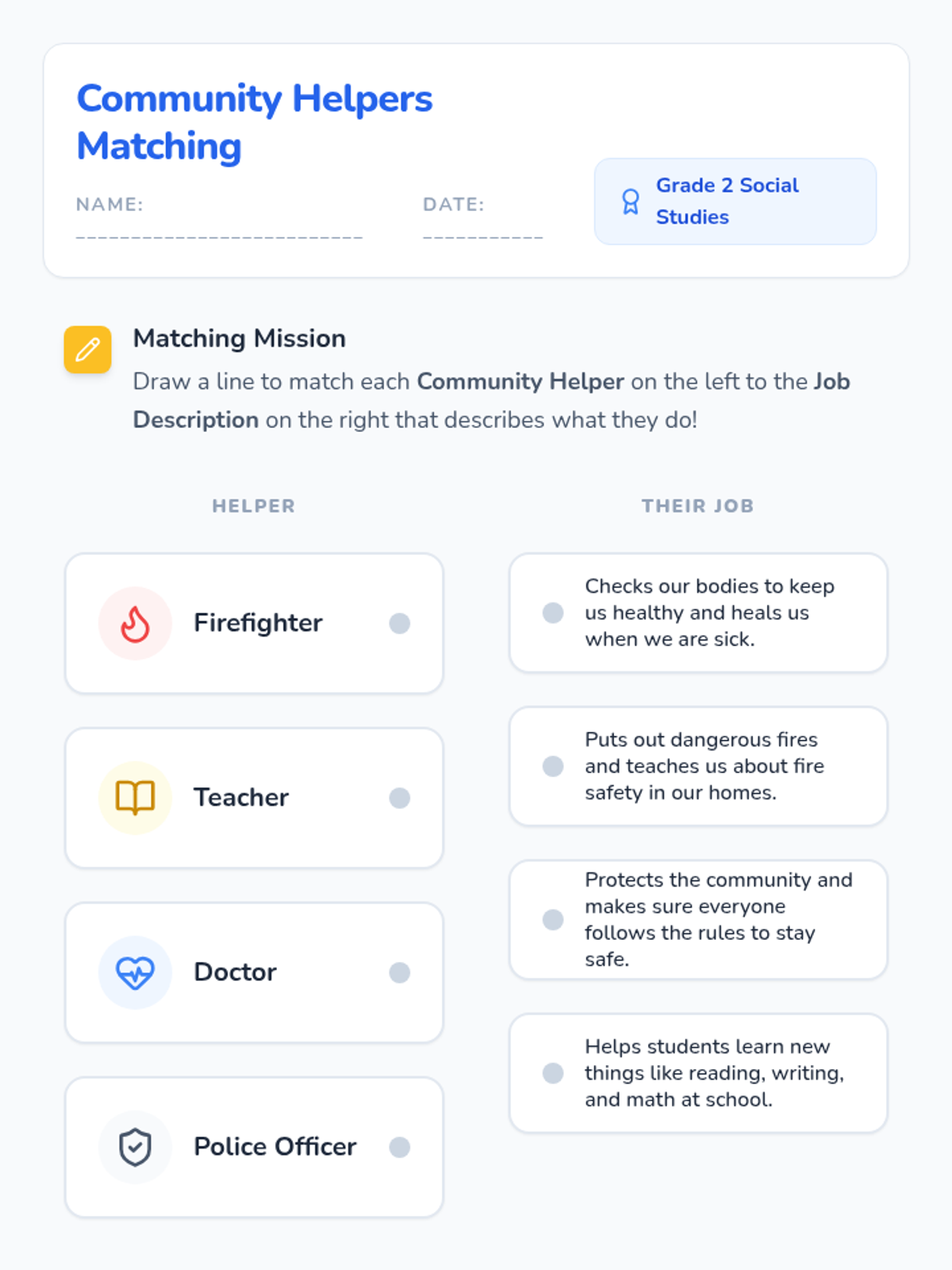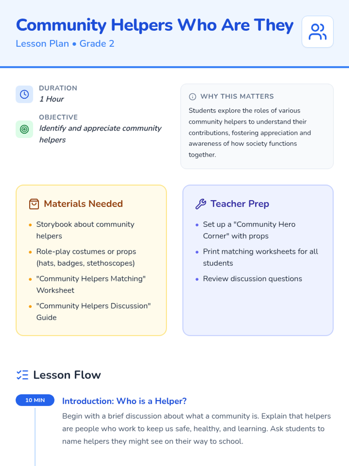 A Grade 2 lesson exploring the roles of community helpers through storytelling, role-playing, and matching activities to foster appreciation for societal contributions.