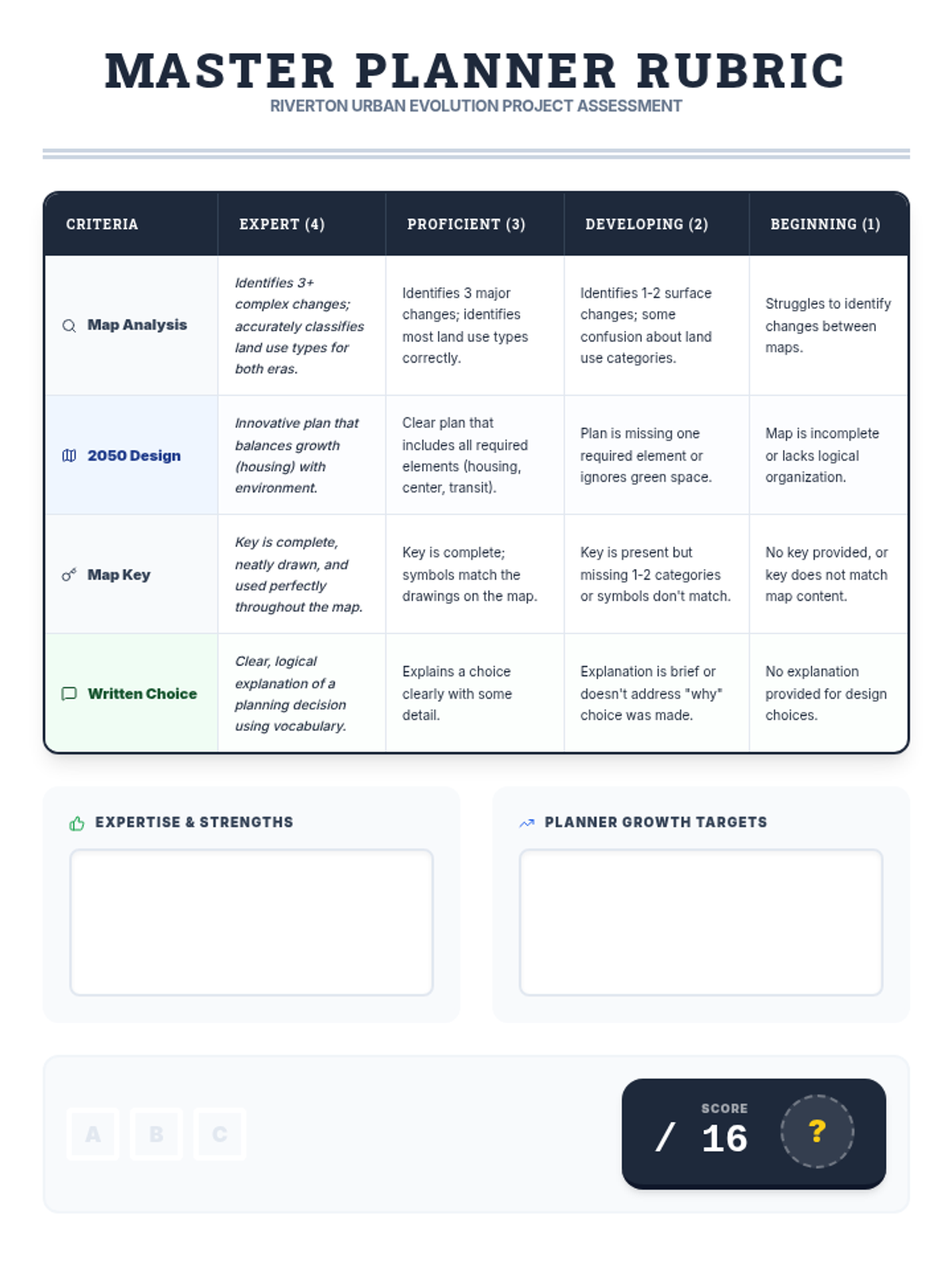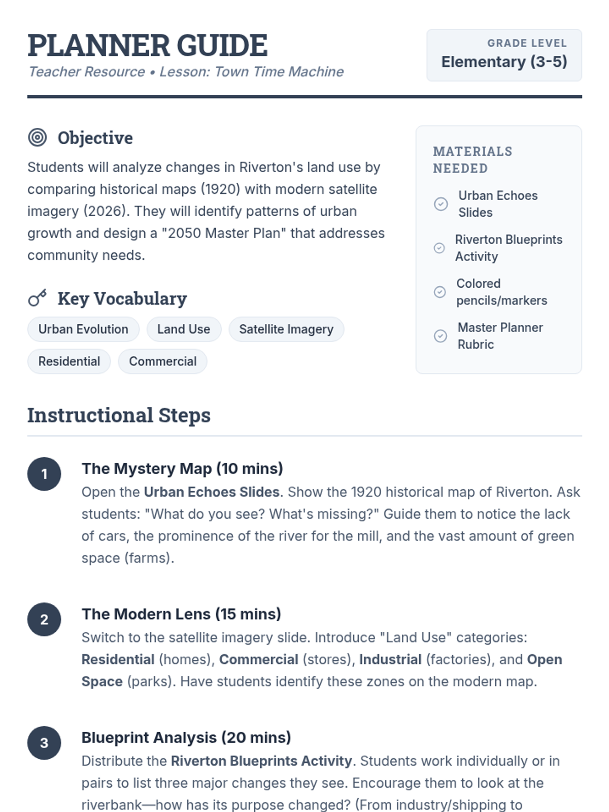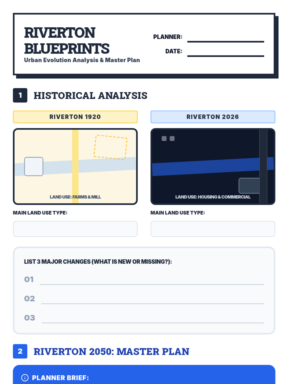 Students explore the history of Riverton through map analysis, identifying how land use has changed over a century and designing future urban solutions.
