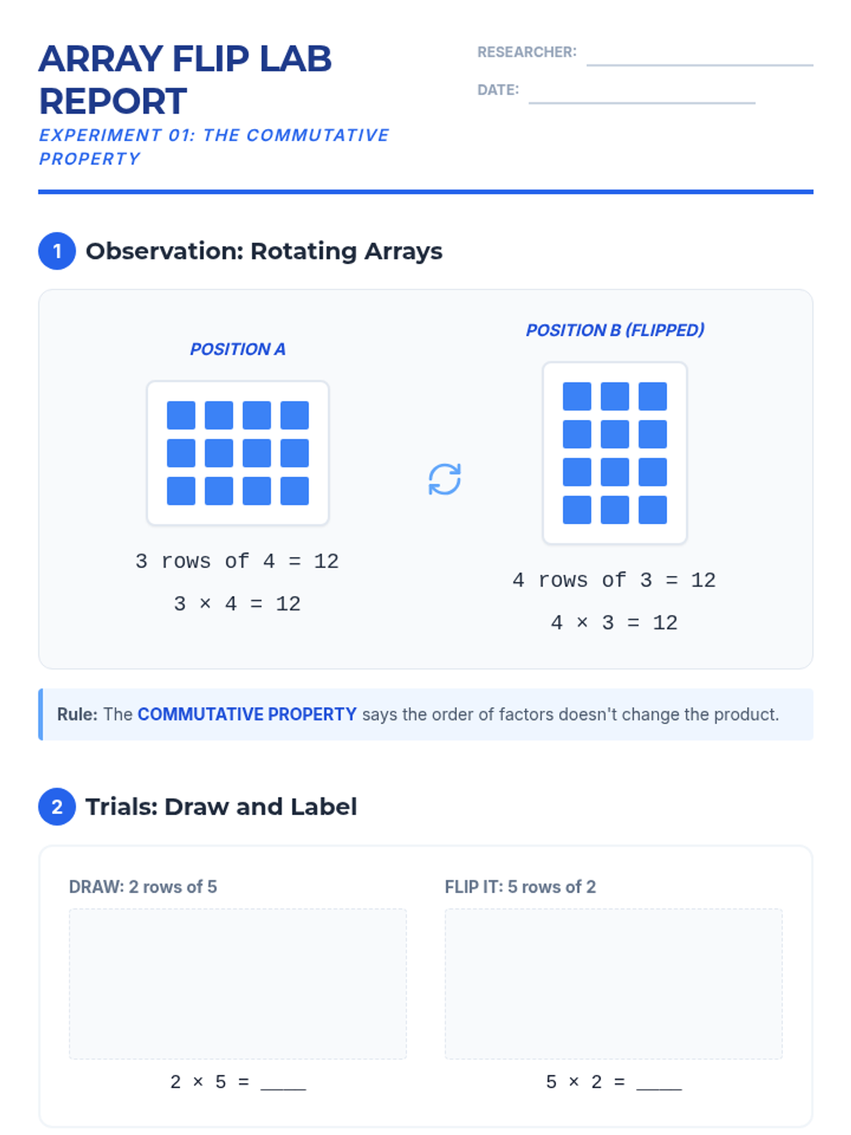 Students investigate the commutative property of multiplication by constructing and rotating physical arrays. By comparing representations like 3 rows of 4 versus 4 rows of 3, students conclude that changing the order of factors does not alter the total product.