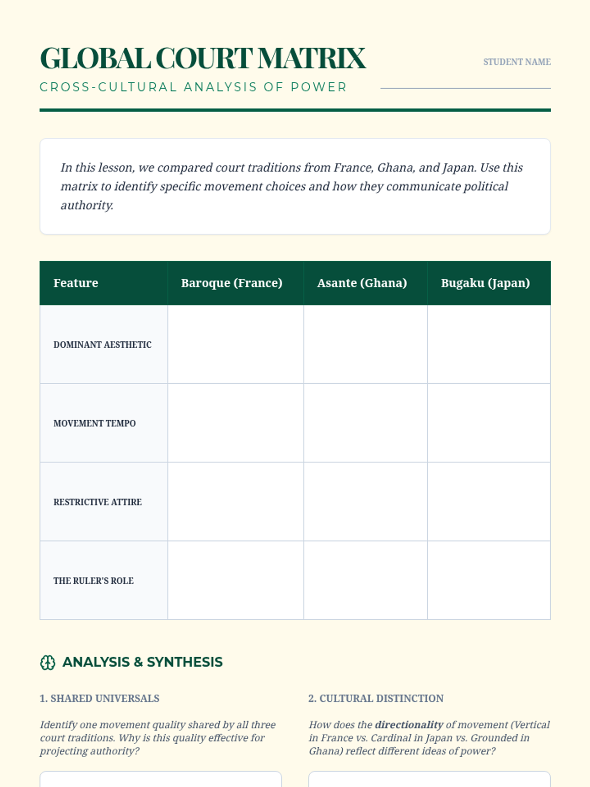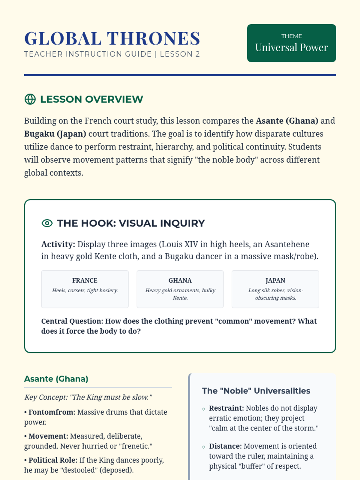 Compare the court dance traditions of the Asante people in Ghana and Japanese Bugaku with French court dance to identify universal themes of power, restraint, and hierarchy.