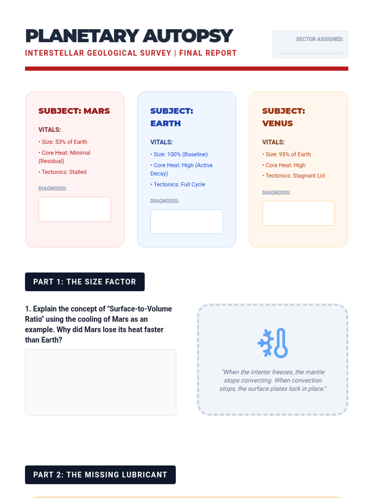 Compare Earth's tectonic activity with Mars and Venus to hypothesize how planetary size and internal heat dictate the lifespan of a planet's "engine."