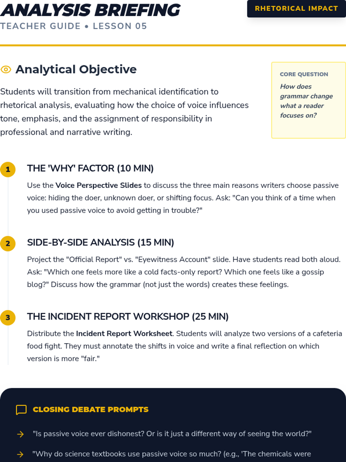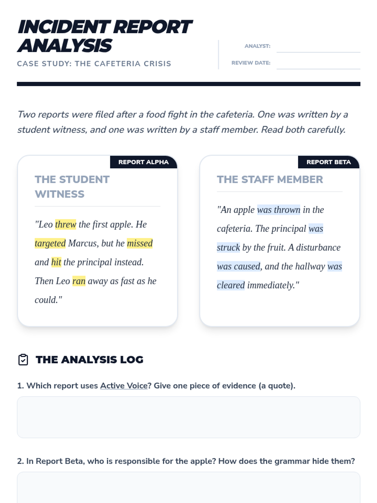 Students analyze the rhetorical effect of voice by comparing incident reports and literary passages.