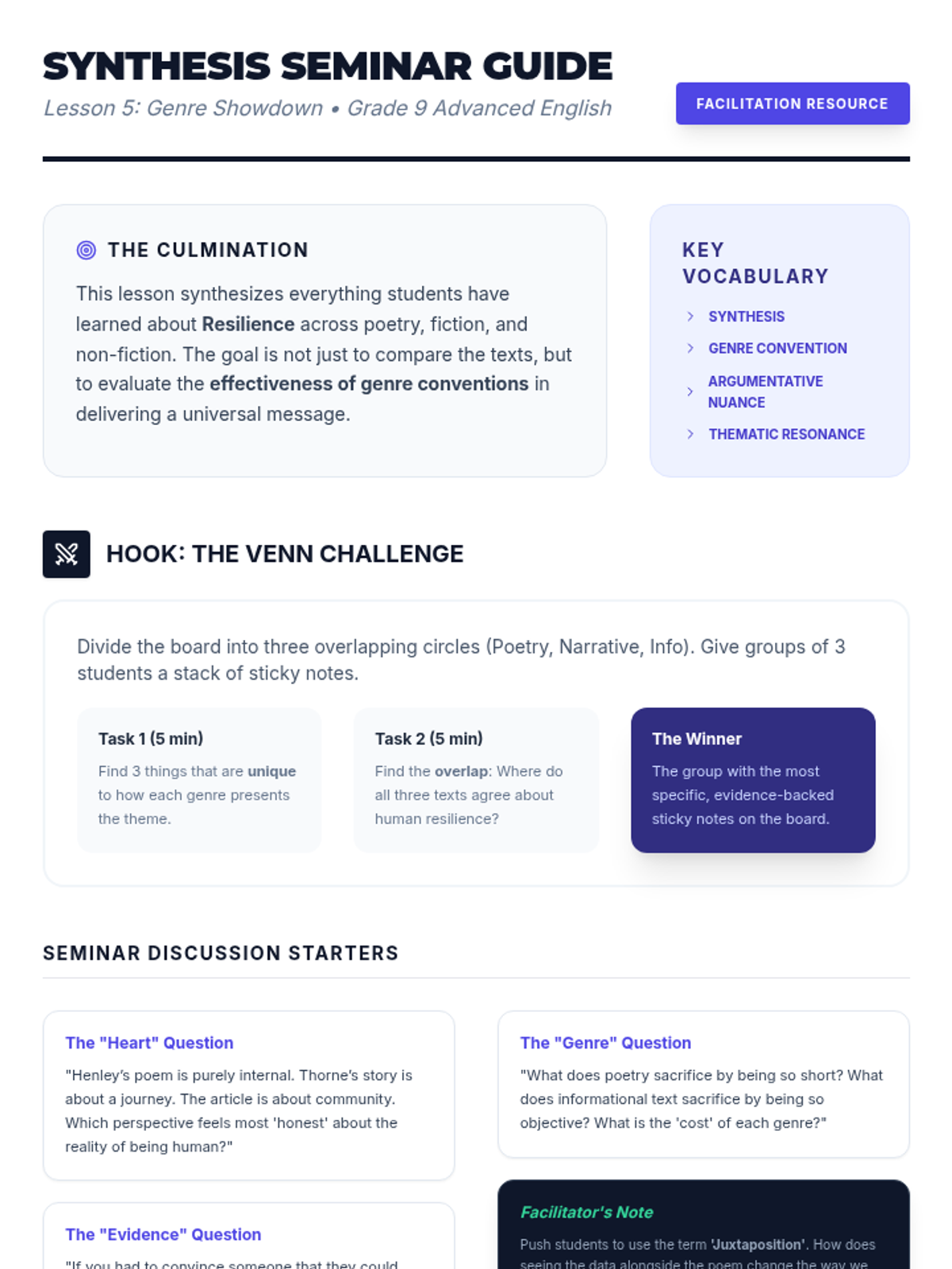 A culminating Socratic seminar and synthesis workshop where students compare the effectiveness of different genres and plan a comparative essay.