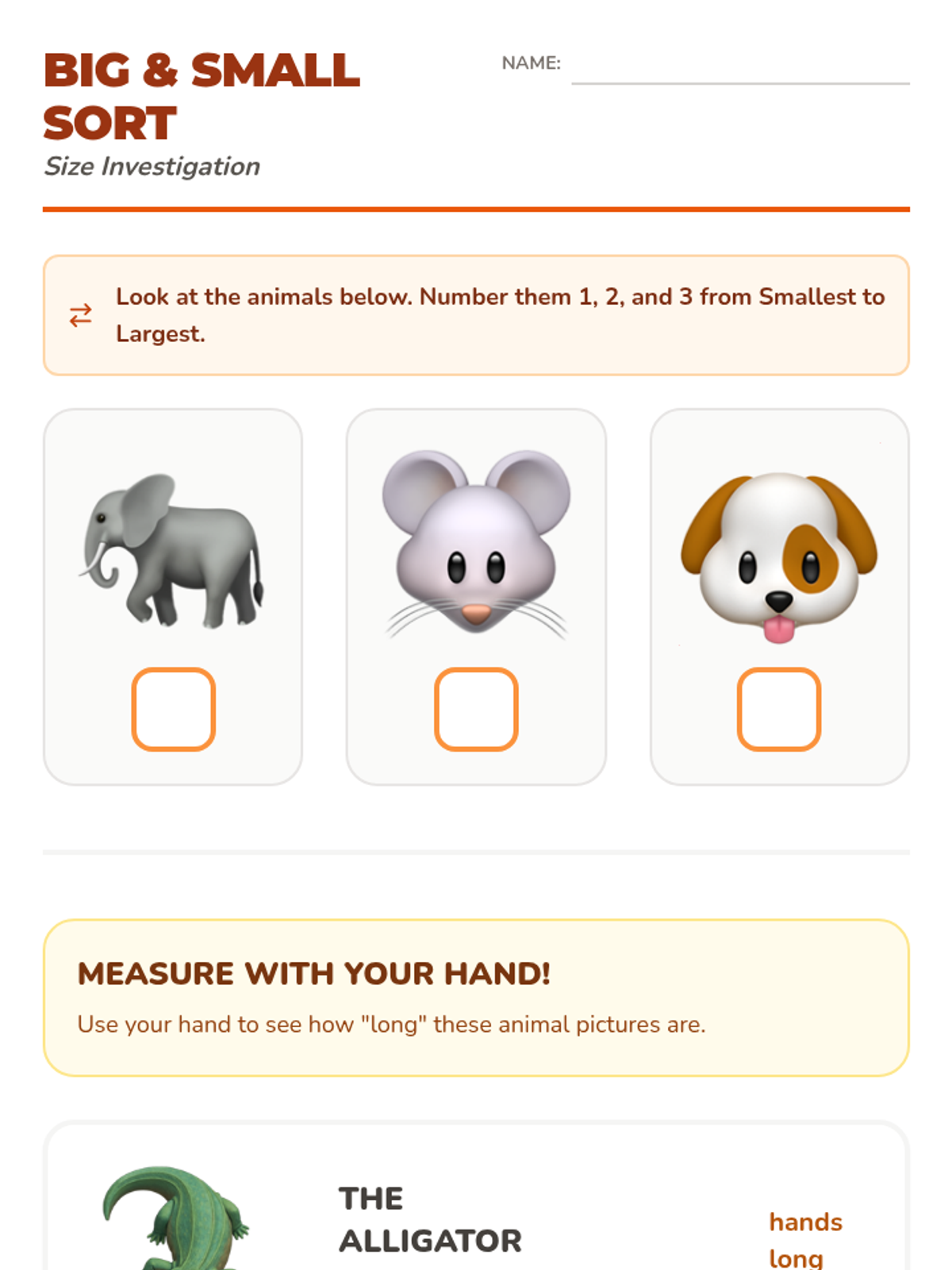 Students compare animal sizes using non-standard measurement and visual discrimination to understand the variety of animal scales.