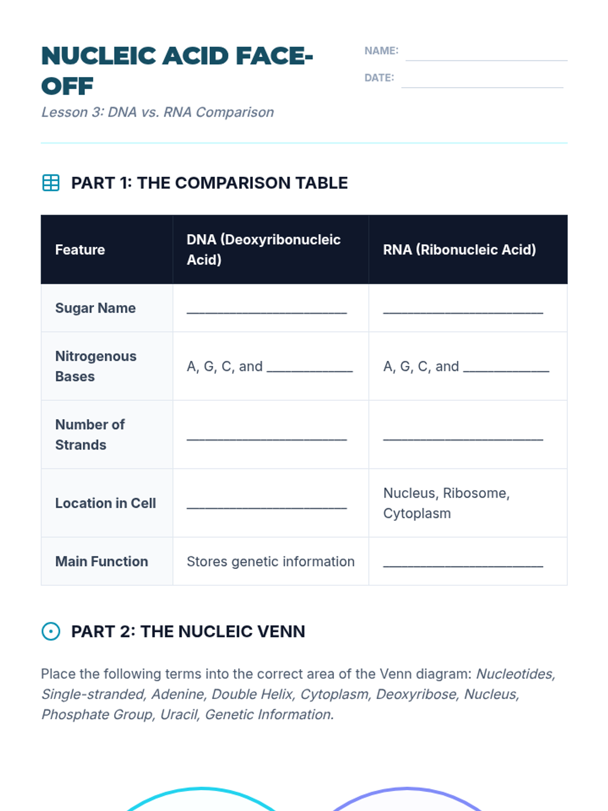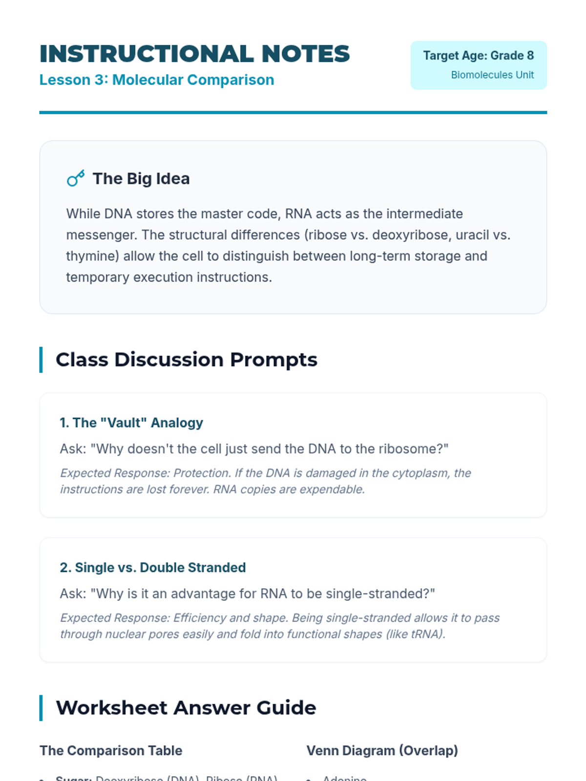 Students distinguish DNA from RNA by analyzing differences in sugar, bases, and strand structure, while exploring the functional relationship between the two molecules in protein synthesis.