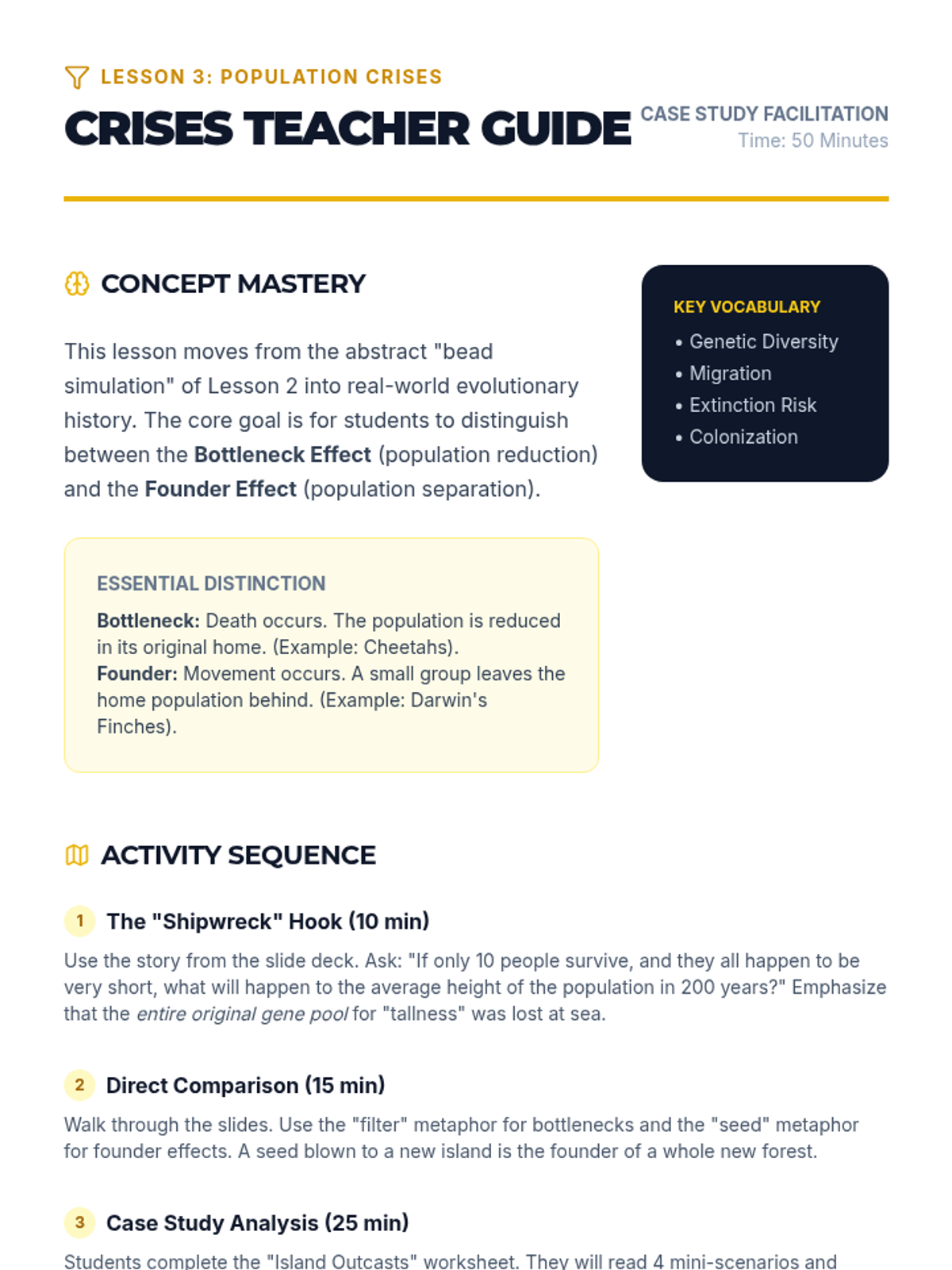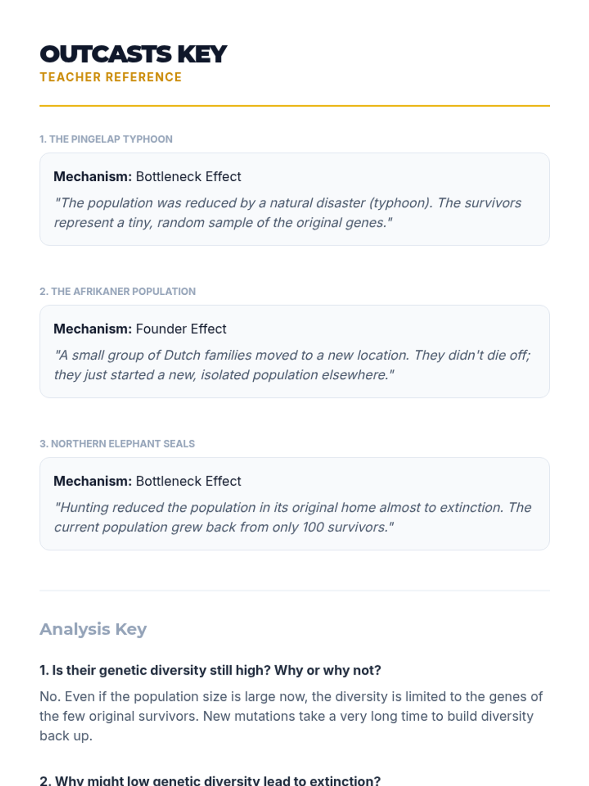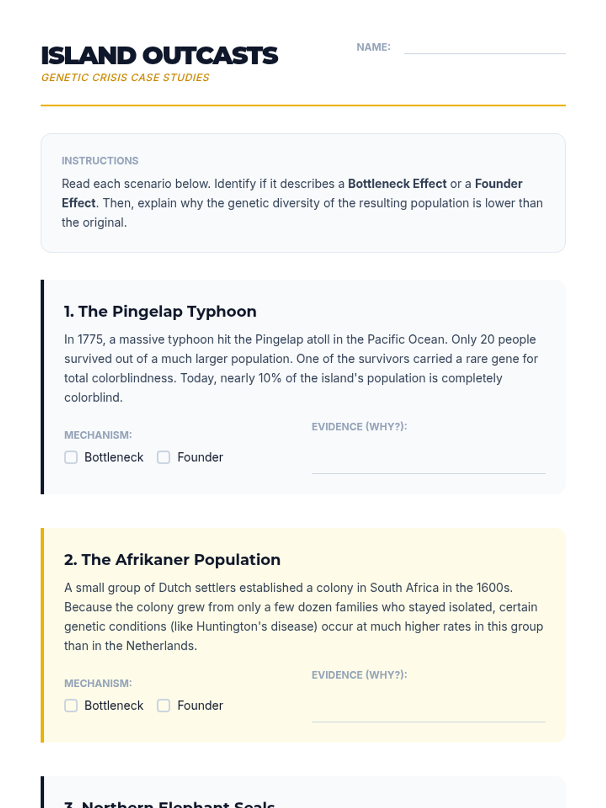 Students differentiate between the Founder Effect and the Bottleneck Effect through real-world case studies. They analyze how extreme population reductions impact genetic diversity.