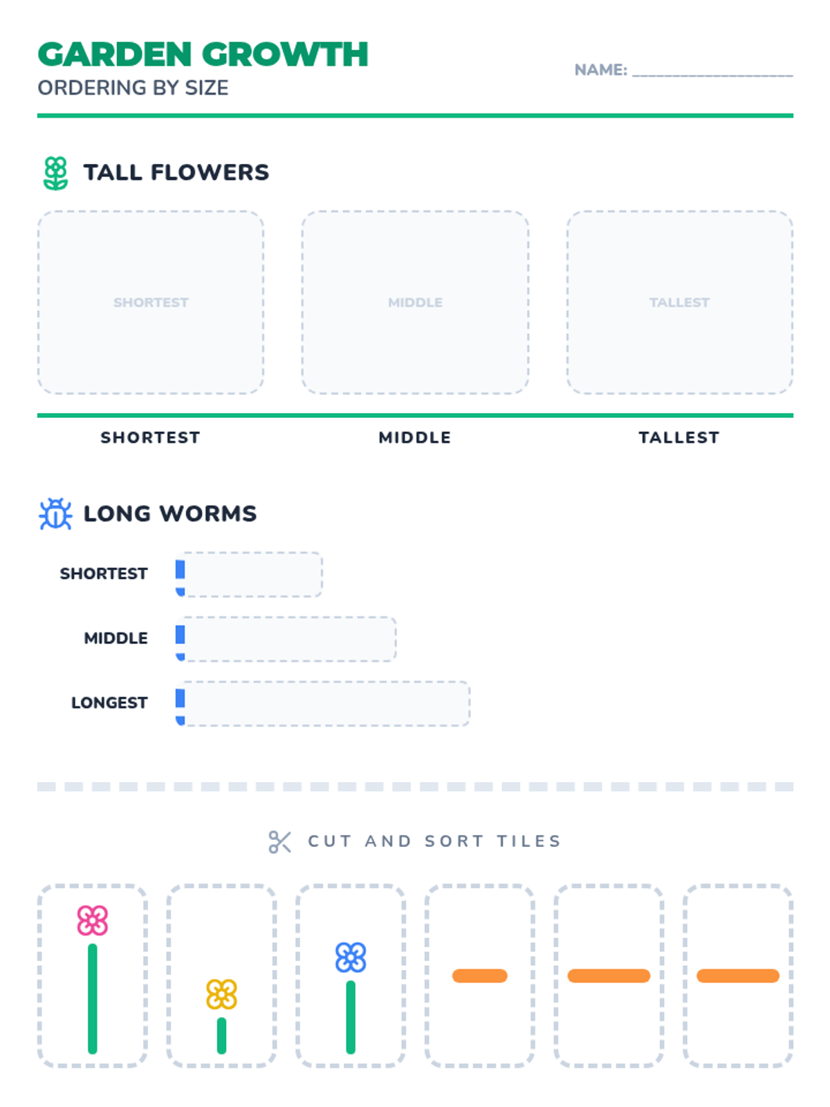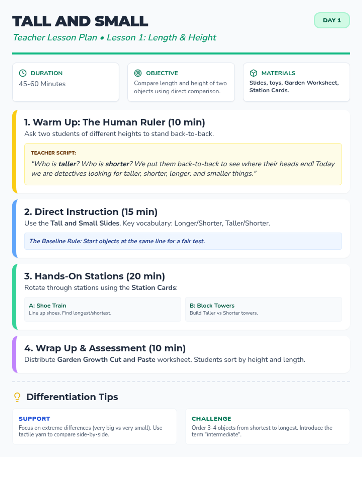 Introduction to comparing length and height using terms like 'longer', 'shorter', 'taller', and 'smaller'.