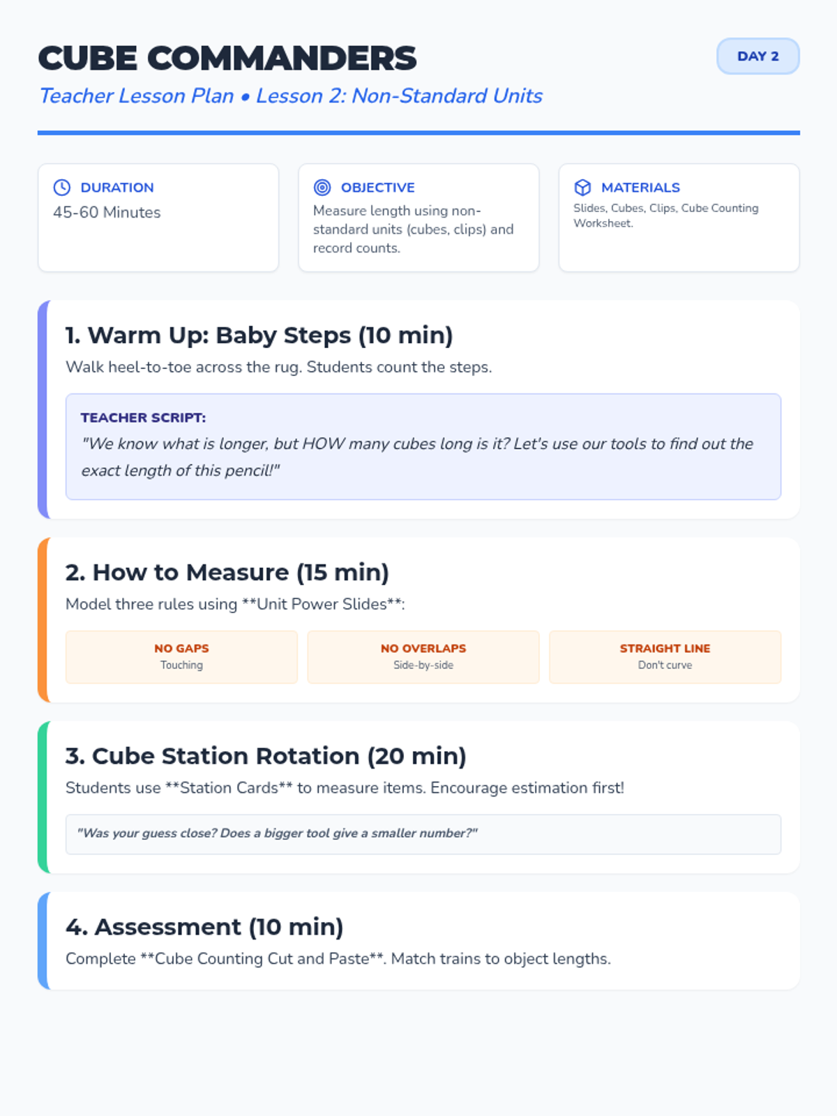 Introducing standard measurement using inches and rulers, focusing on estimating, measuring, and comparing classroom objects with tiered supports.