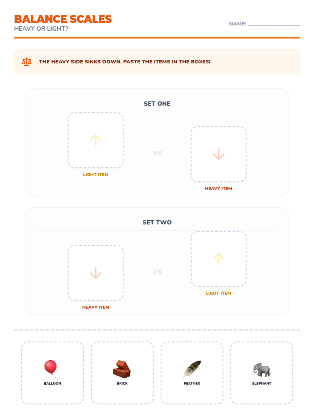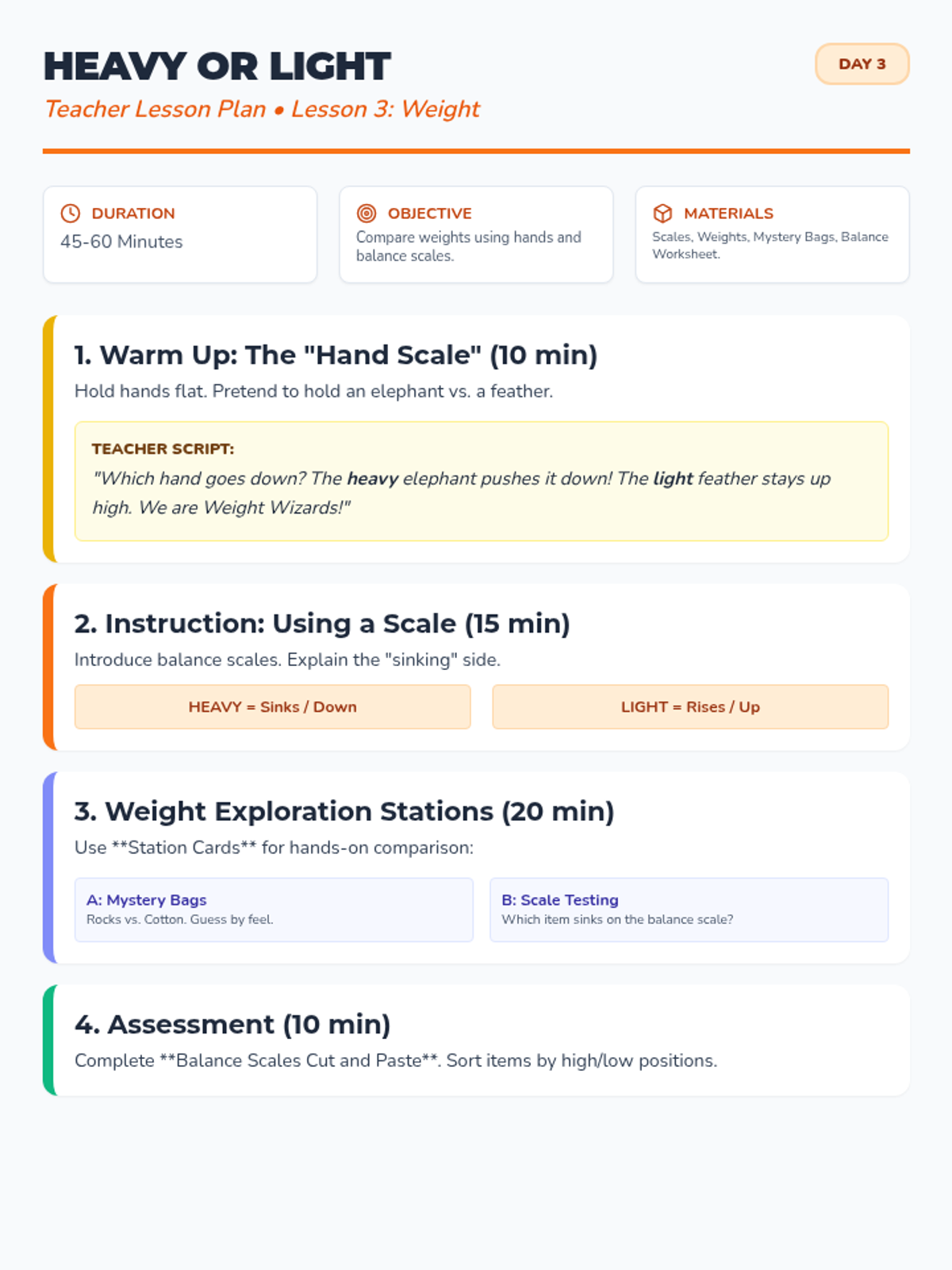 Exploring weight by comparing heavy and light objects using hands and balance scales.